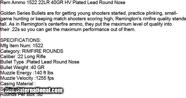 Description: 22'S ARE 500 RDS PER BRICK STARTING AT $ 59.00 REMINGTON #1522 HI-VEL 22LR 40GRAIN 500 ROUND BRICK == $ 49.00 SOLD OUT AGUILA 22 HV SHORTS 29 GRAIN ( 10BX OF 50ES = 500RDS ) ===$ 59.00 AGUILA 22LR STD. VELOCITY LEAD RN OR COPPER PLATED RN === $ 59.00 sale WIN VARMINT HE 22LR HP 1435FPS 500 ROUND BRICK == $ 79.00 WIN 22LR SUB-SONIC 42GR 1065FPS 500 ROUND BRICK == $ 79.00 WIN 22LR SUB -SONIC 40GR VARMIT & PEST 500 ROUND BRICK == $ 80.00 << 2 LEFT ALL SINGLE BRICKS SHIP FOR $ 18.00 EACH ADDITIONAL BRICK ADD $ 4.00 ORDERS OVER $ 500 SHIP FREE (48 STATES) SEE PHOTOS FOR MORE DETAILS ABOUT EACH ITEM. CREDIT CARDS OK WITHOUT FEE. (928) 607-4773 TO ORDER BY PHONE SOLD |