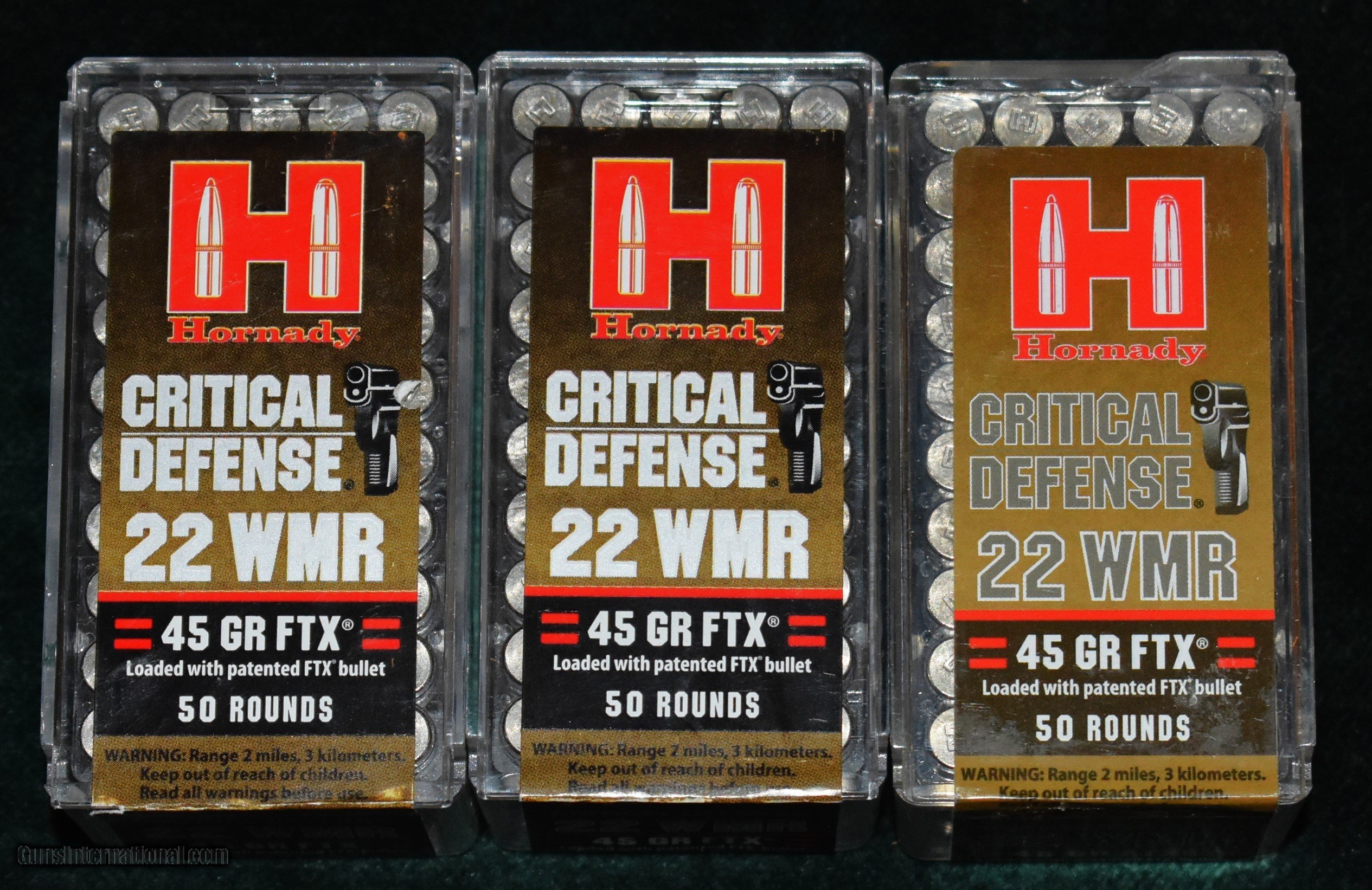 Description: Three full boxes of 50 round each of hornady 22WMR 45 grain FTX Critical Defense loads. A fine hunting load as well. Price includes shipping. SOLD Rifle Caliber: .22 WMR (.22 Magnum) |