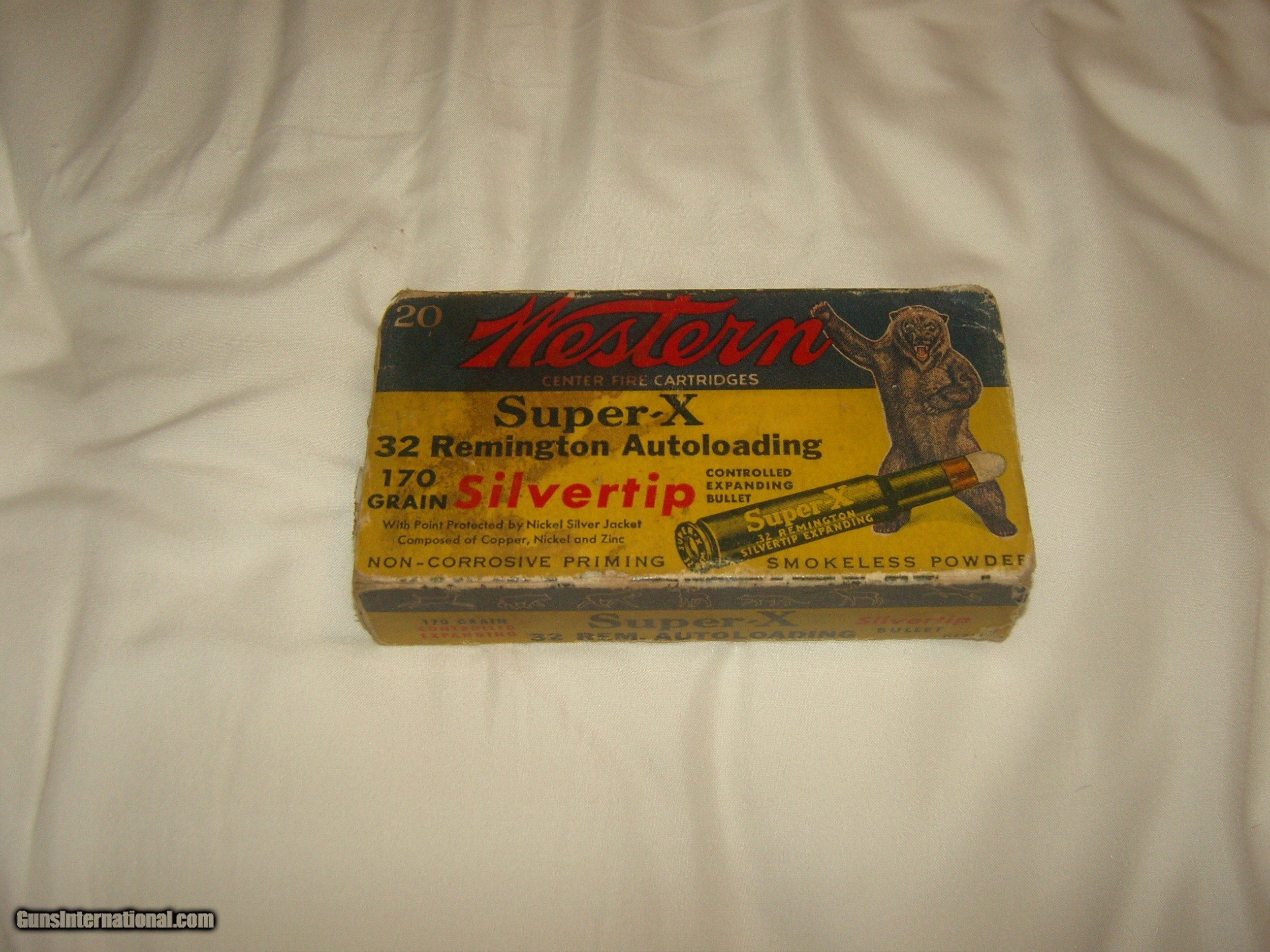 Description: 32 Remington Ammo, 11 rounds, various head stamps in rare crouching bear box, no end tabs,obsolete, only $50 SOLD |