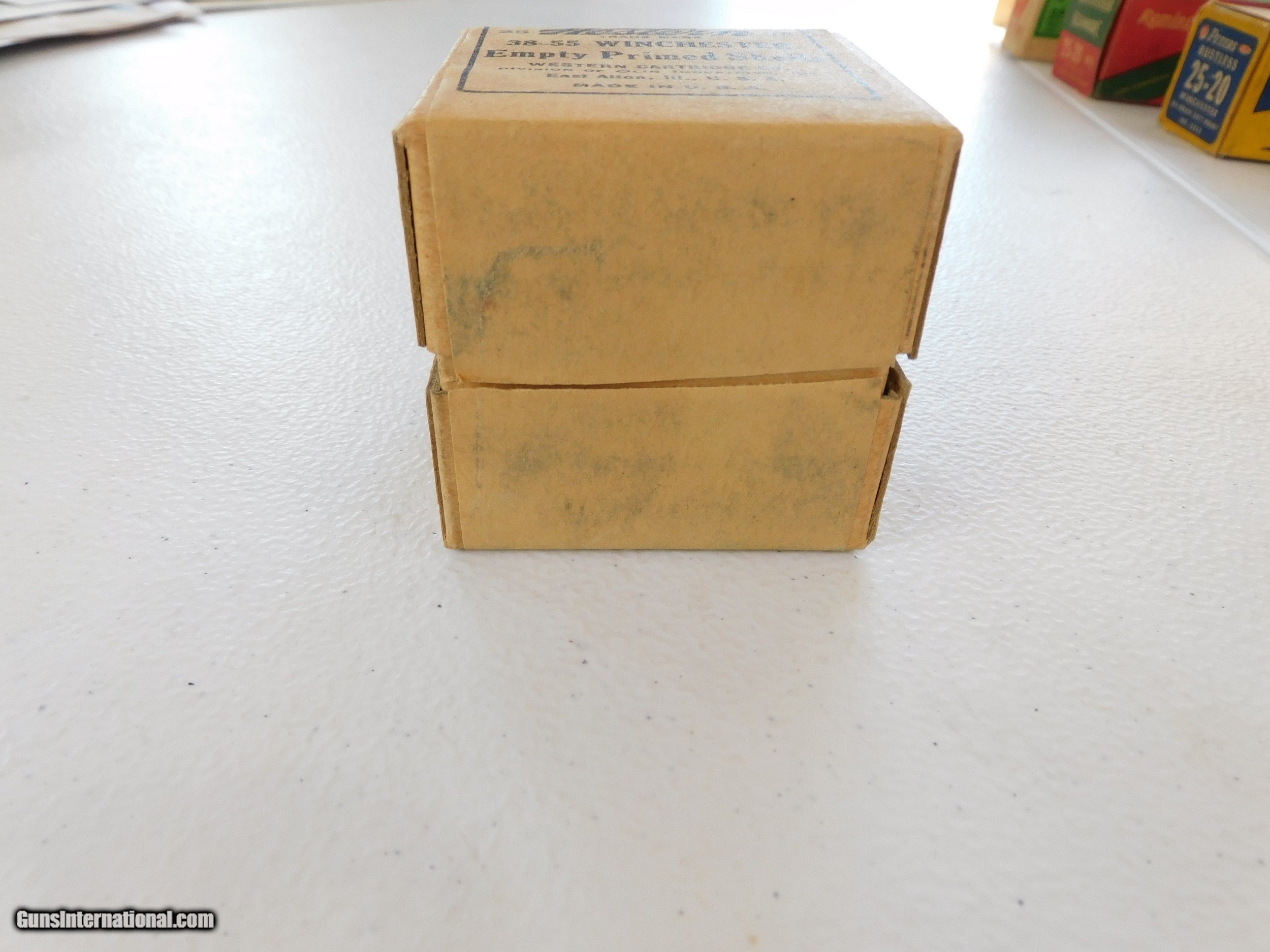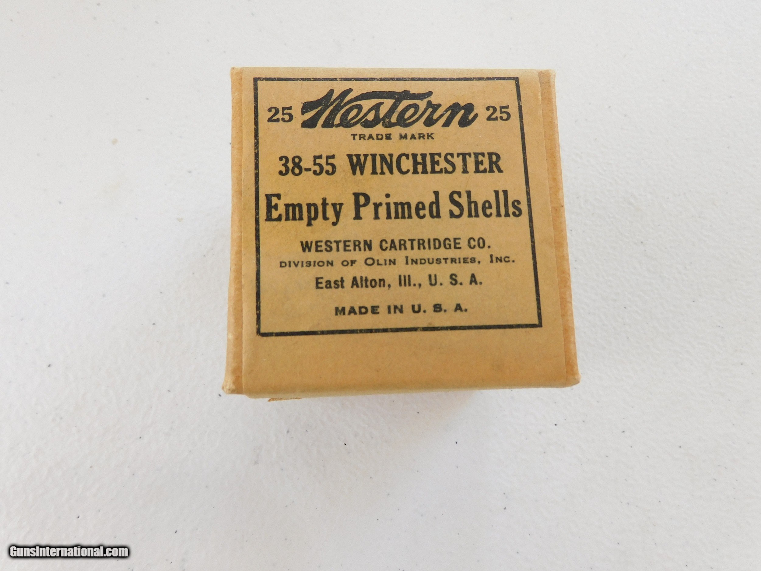 Description: #3777MA 38-55 Western empty primed shells, 25 rd. tan boxes in VG condition. 2 boxes for $95 SOLD |
