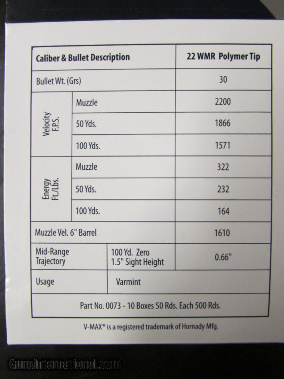 Description: Brand new in the box, ready to ship. Buy it now! Manufacturer: CCI/Speer Operations Caliber: .22 Winchester Magnum Rimfire Bullet: 30 Grain V-MAX Polymer Tip Muzzle Velocity: 2200 fps Muzzle Energy: 322 ft. lbs. 500 Rounds (1 Sleeve of 10 Boxes 50 Rounds per Box) CCI has been loading rimfire ammunition since 1962 and is known in the shooting sports as a one of the leaders in rimfire ammunition. CCI has made a reputation for delivering reliable ammunition that delivers exceptional performance time after time. The 30 Grain Hornady V-Max bullet features a polymer tip that helps to enhance accuracy and promote devastating expansion. This hard hitting Maxi-Mag load delivers the V-max into the target at high-speed exploding varmints on contact. This ammunition is new production and non-corrosive. UPS Ground shipping ONLY to lower 48 EXCEPT NY. Please email in with your zip code to receive a shipping quote. KNOW YOUR LOCAL AND STATE LAWS!! SOLD |