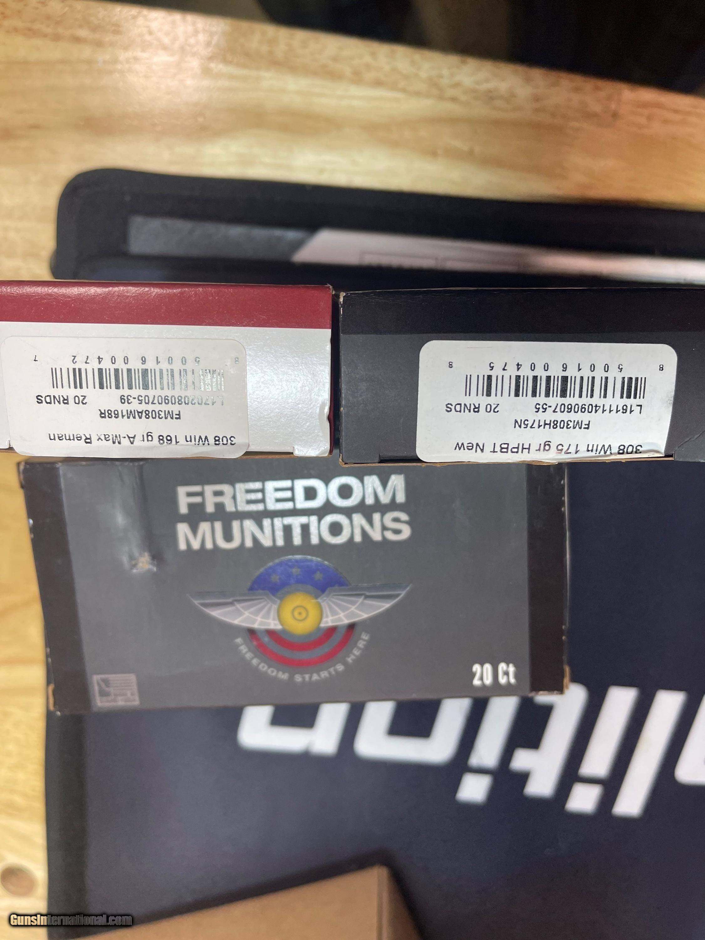 Description: NIB 308 Ammo Freedom Munitions 3 boxes 168 gran 1 box 155 grain 2 boxes 175 grain $100 for all 6 boxes SOLD PENDING PAYMENT SOLD Rifle Caliber: .308 Winchester |