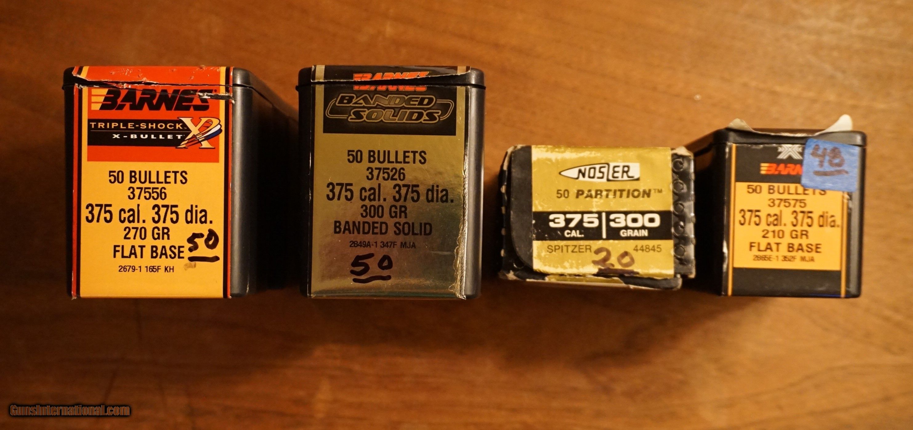 Description: Offering the following .375 caliber projectiles: 50 Barnes #37556 270 Gr flat base 50 Barnes #37526 300 Gr Banded Solids 48 Barnes #37575 210 Gr Flat Base 20 Nosler #44845 300 Gr Partition Spitzers $125.00 for all plus $17.00 prioity shipping SOLD Rifle Caliber: .375 H&H Magnum |