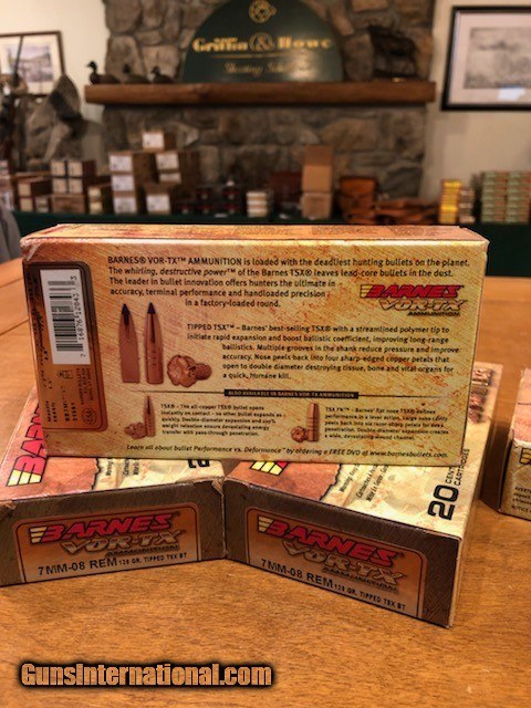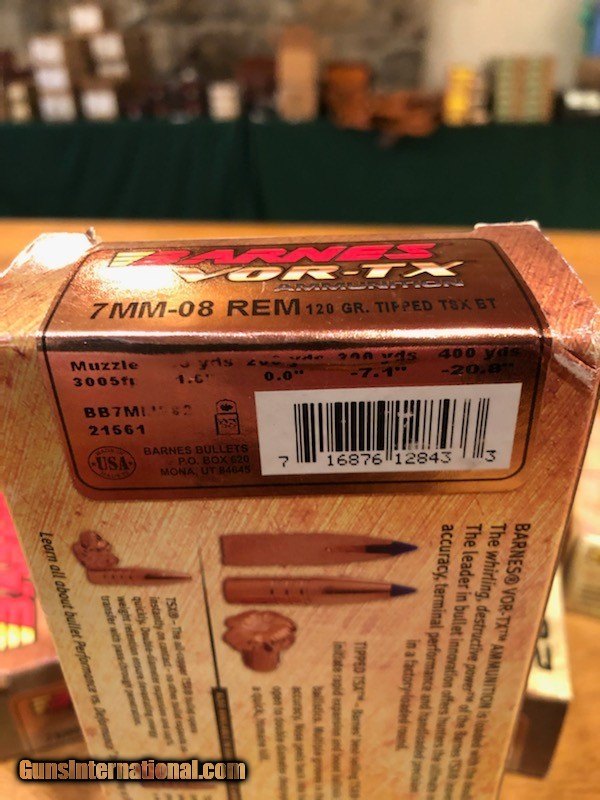 Description: Barnes VOR-TX 7MM-08 120gr Tipped TSX BT Rifle Ammo Brand New in Box Item # 21561 UPC# 716876128433 Box of 20 Cartridges Brand New in Box Barnes VOR-TX is precision ammunition loaded with TSX, Tipped TSX or TSX FN bullets to offer double-diameter expansion, maximum weight retention and excellent accuracy. The TSX bullets provide maximum tissue and bone destruction, pass-through penetration and devastating energy transfer. Multiple grooves in the bullet's shank reduce pressure and improve accuracy. Bullets open instantly on contact - no other bullet expands as quickly. Nose peels back into four sharp-edged copper petals destroying tissue, bone and vital organs for a quick, humane kill. Whether you're after whitetail deer, elk, antelope or boar, put 'em in the VOR-TX and they're going down. We have 7 Boxes left in stock SOLD |