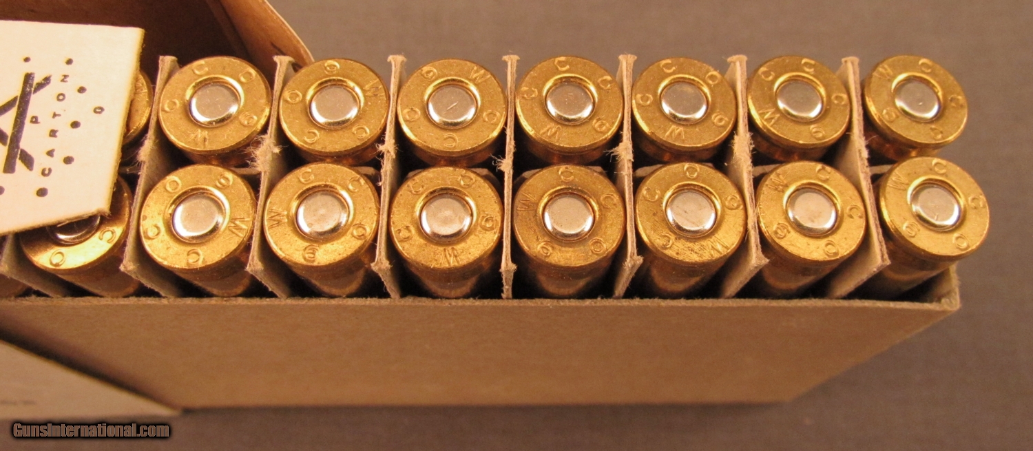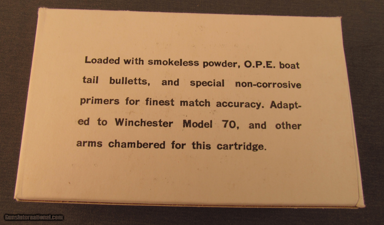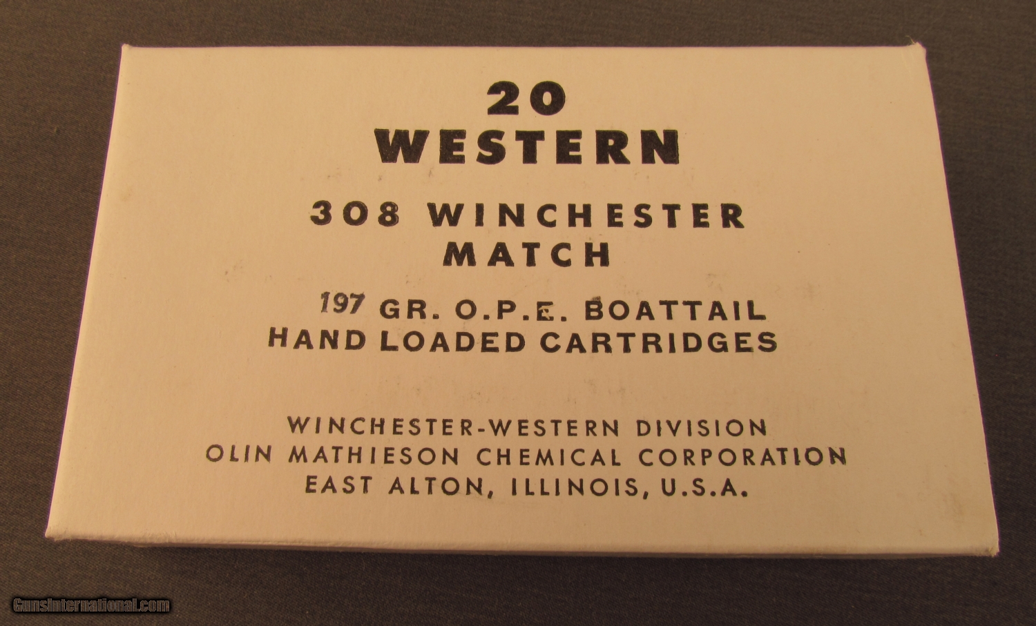 Description: This box comes from a sealed case of Winchester Western .308 (7.62) NATO cartridges especially loaded for the U.S. army. The original label shows shipping from Fort Benning to the National Match Support Mission, Camp Perry, 26 May 1975. The case markings indicate 1000 rounds .308 match 197 GR. OPE. We were informed that the 197 GR was not standard. These match cartridges were hand loaded by Winchester with O.P.E. boat tail bullets. The primers are special non-corrosive. These cartridges were built for use in bolt action Model 70 rifles. The case label indicates that the case was part of a shipment of 2 cases. The boxes are coded 49 RE 42 BPH. The head stamp is WCC dated 1960. All of the boxes are new, excellent. A .308 built for use by a U.S. army target team. We have multiples, please inquire. SOLD Manufacturer: Winchester Model: Ammo Caliber Info: .308 Gauge Info: .308 |
