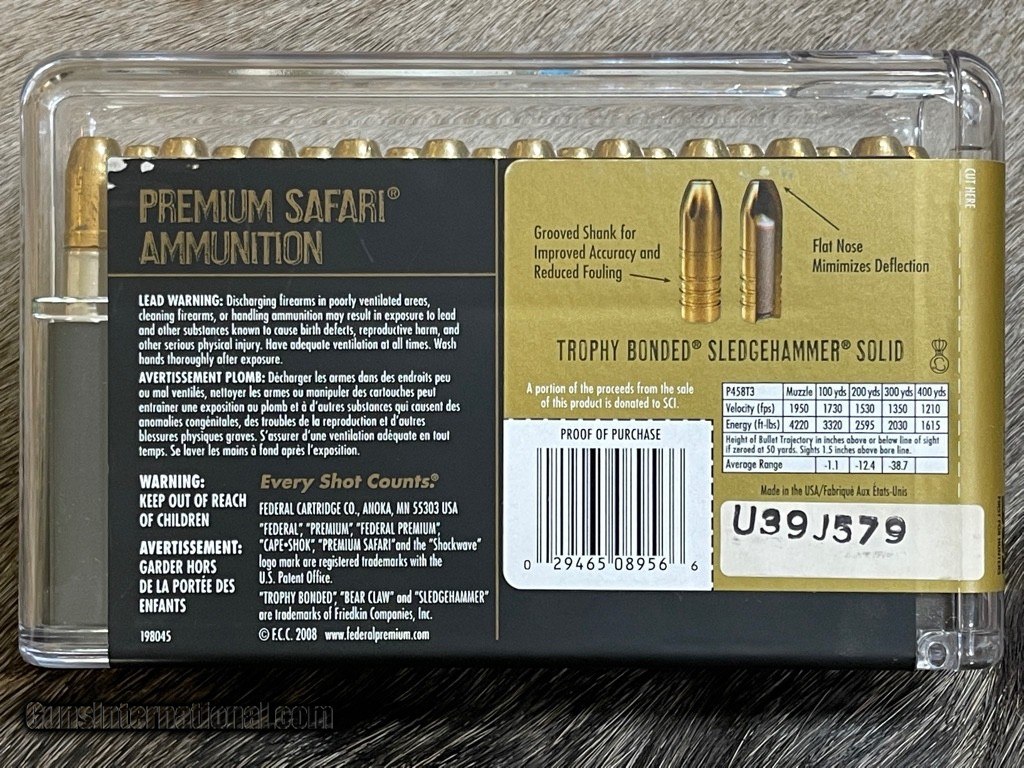 Description: NEW FEDERAL CAPE-SHOK PREMIUM SAFARI 458 WINCHESTER MAGNUM TROPHY BONDED SLEDGEHAMMER SOLID AMMUNITION Jack Carter's legendary Trophy Bonded® Sledgehammer® Solid bonds the core to a thick brass jacket to achieve bone-crushing penetration. Federal Premium® Ammunition's nickel-plated case, specially formulated powder and Gold Medal® primer ensure peak performance when it matters most.