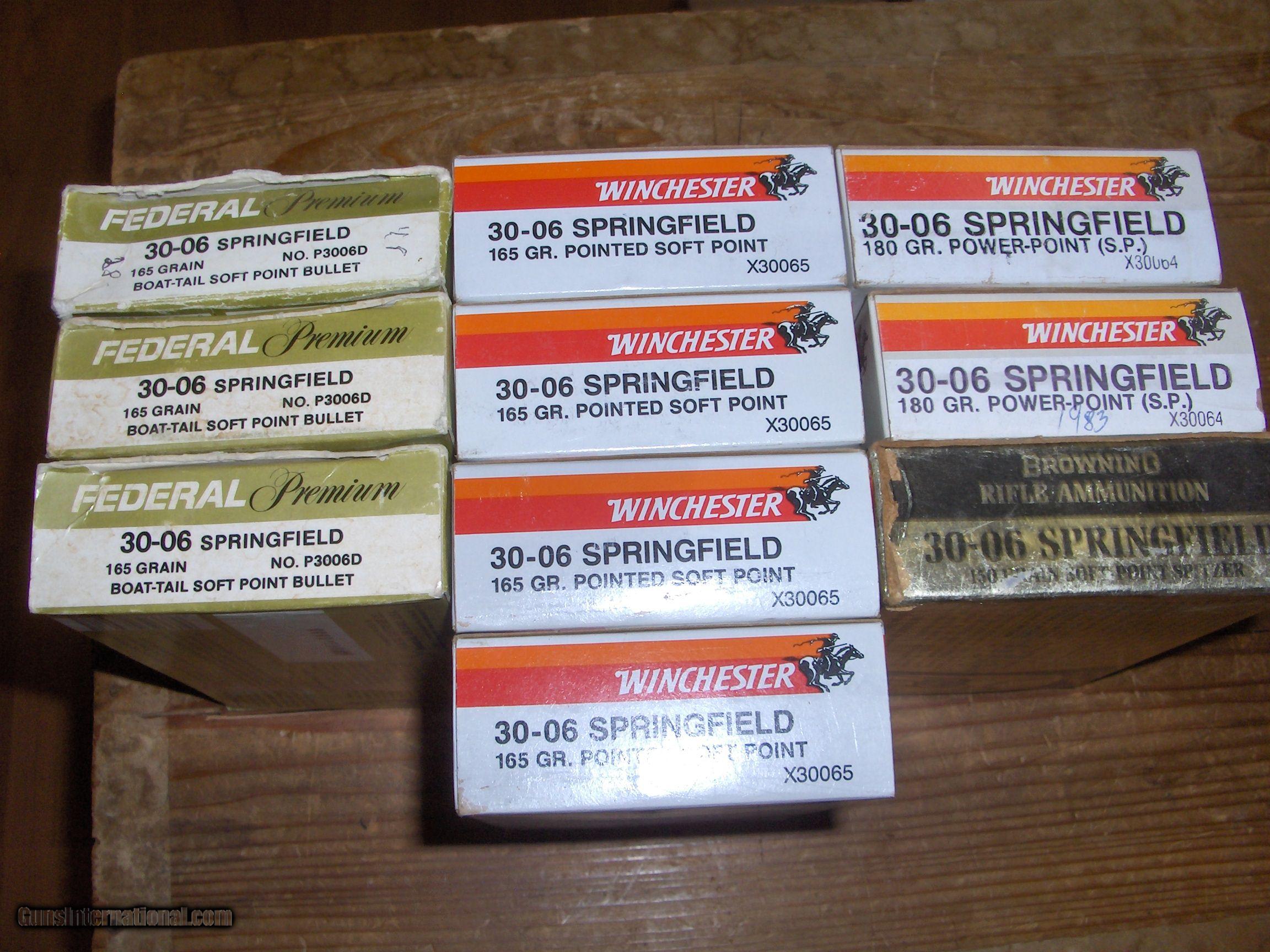 Description: 5 Boxes of factory 30-06 ammo. 1. 3 boxes of Federal Premium 165 grain boat-tail soft point. 2. 1 box of Winchester 180 grain power point. 3. 1 box of Browning 150 grain soft point. SOLD |