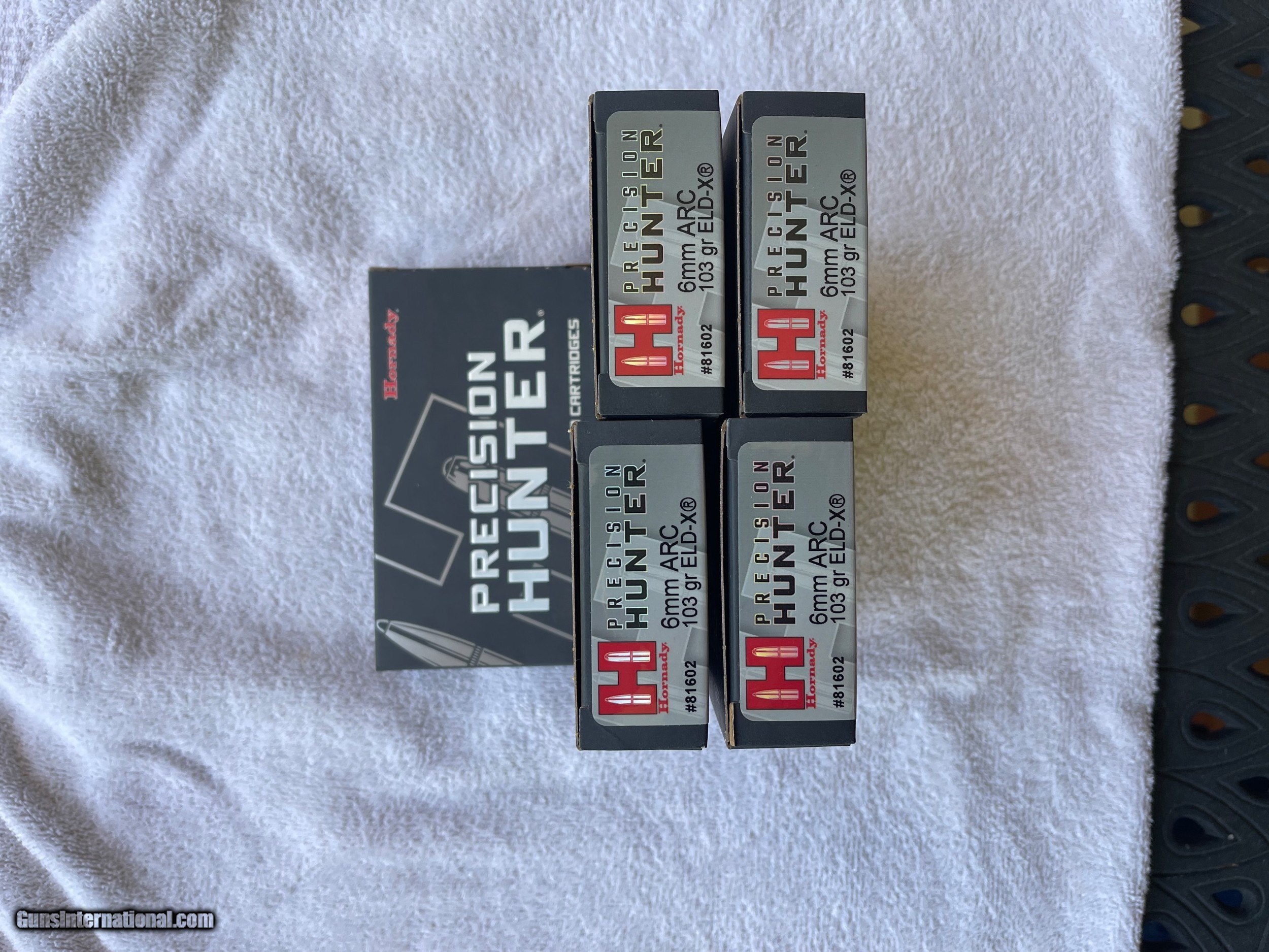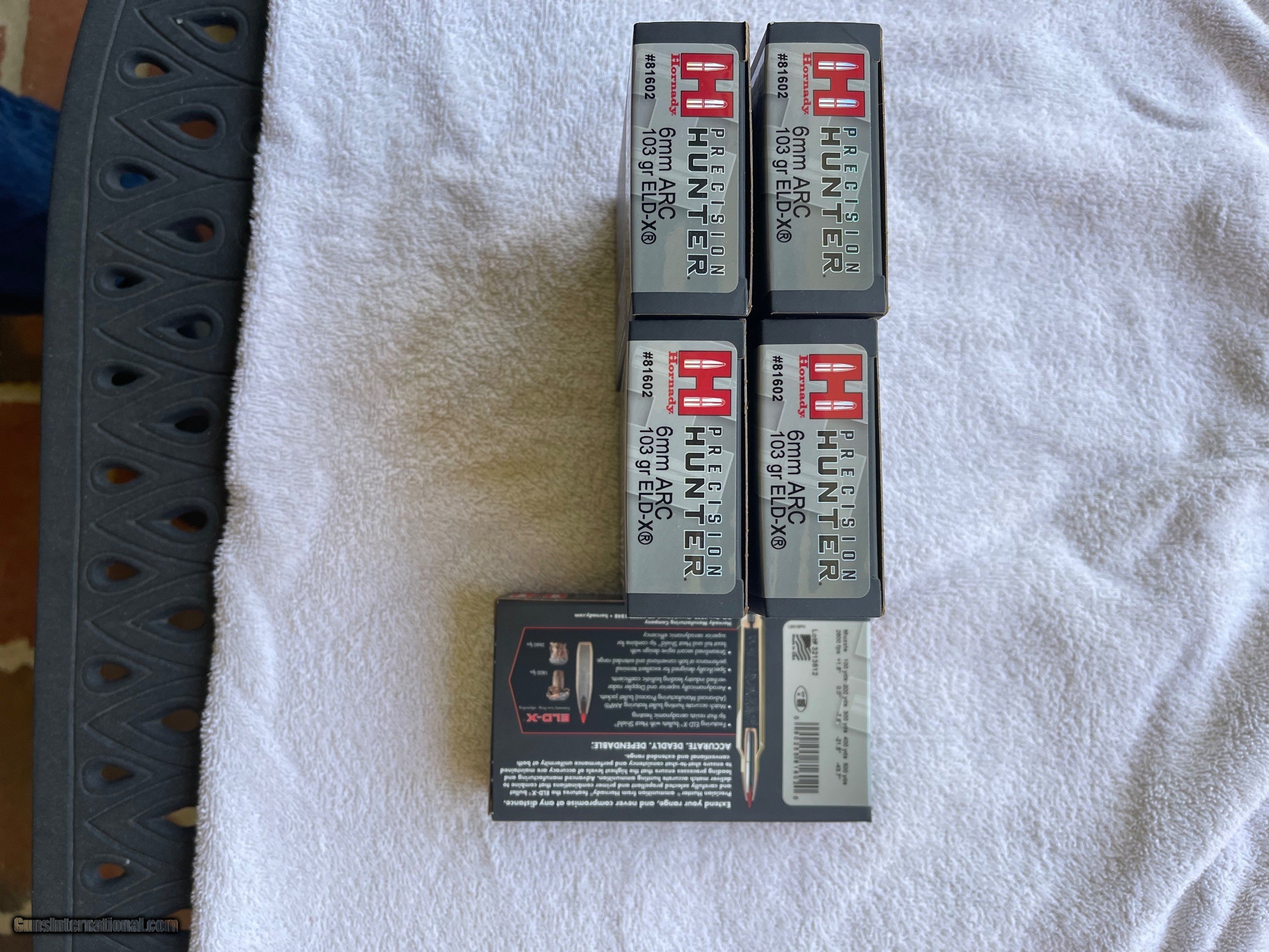 Description: 5 new boxes of Hornady 6mm ARC 103 gr ELD-X ammo SOLD Rifle Caliber: 6mm ARC |