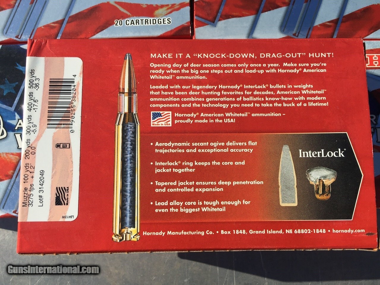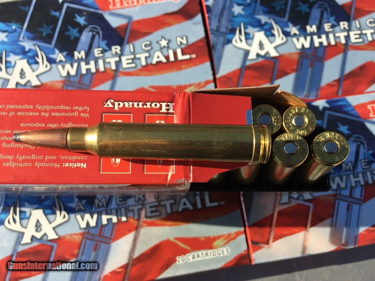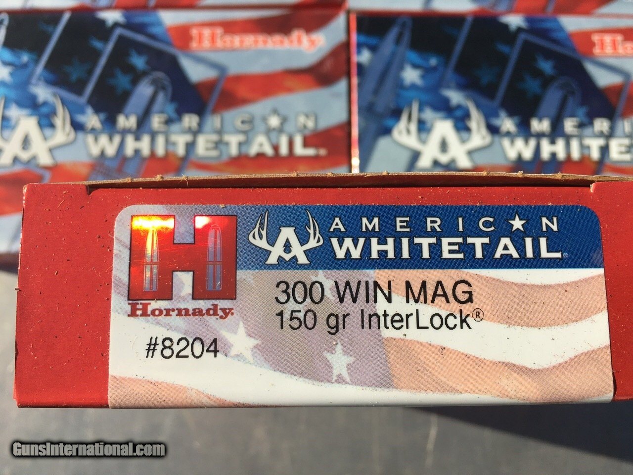 Description: This lot contains 5 boxes of Hornady American Whitetail ammo for a 300 Winchester Magnum. This lot contains a total of 100 rounds. No shipping to CA,AK, HI, DC, IL nor anywhere else prohibited and or an overall issue to ship to. Buyer to pay actual shipping cost via Fedex ground. Money orders and PayPal accepted. If paying via PayPal add 4%. SOLD Rifle Caliber: .300 Winchester Magnum |