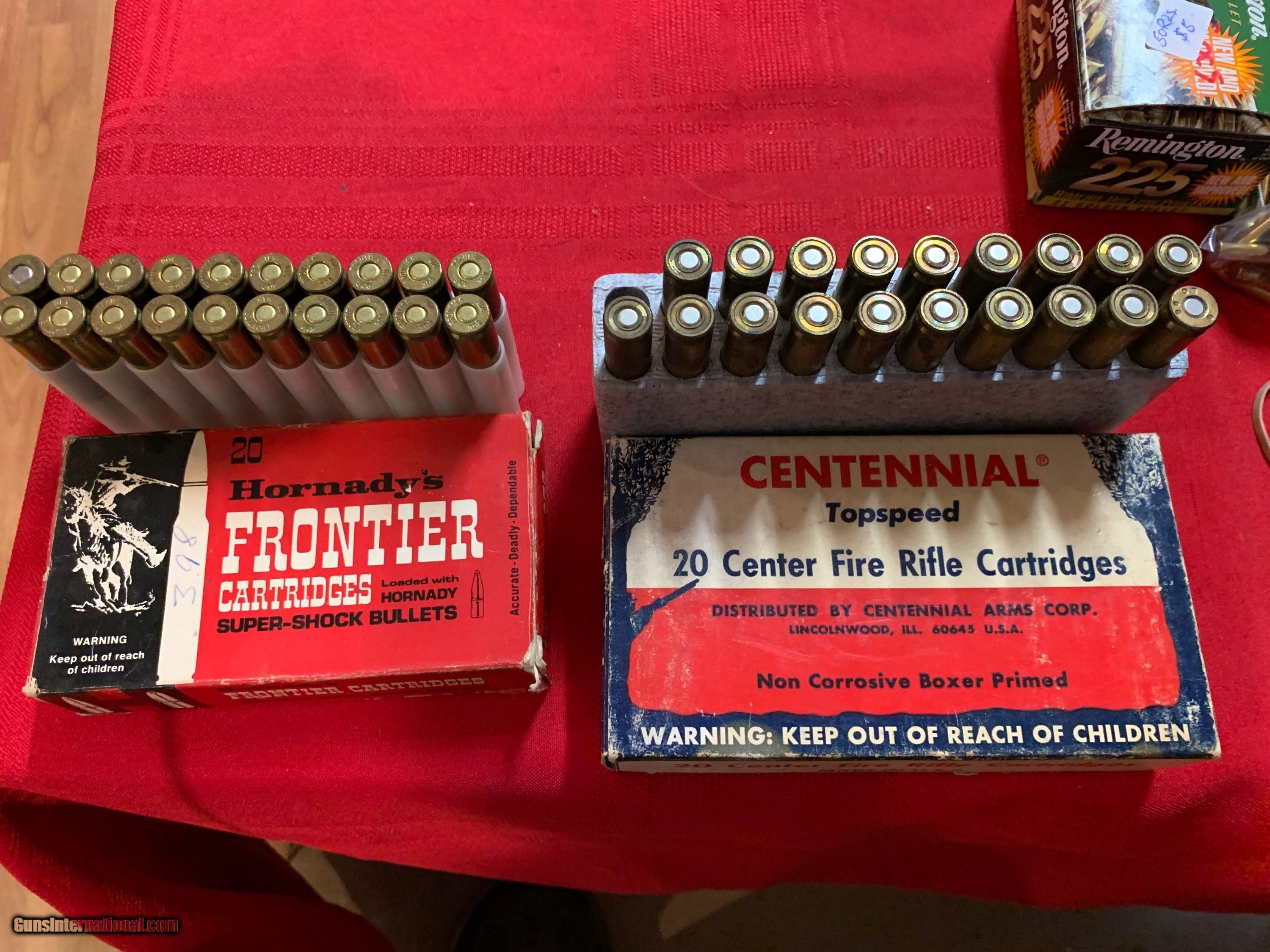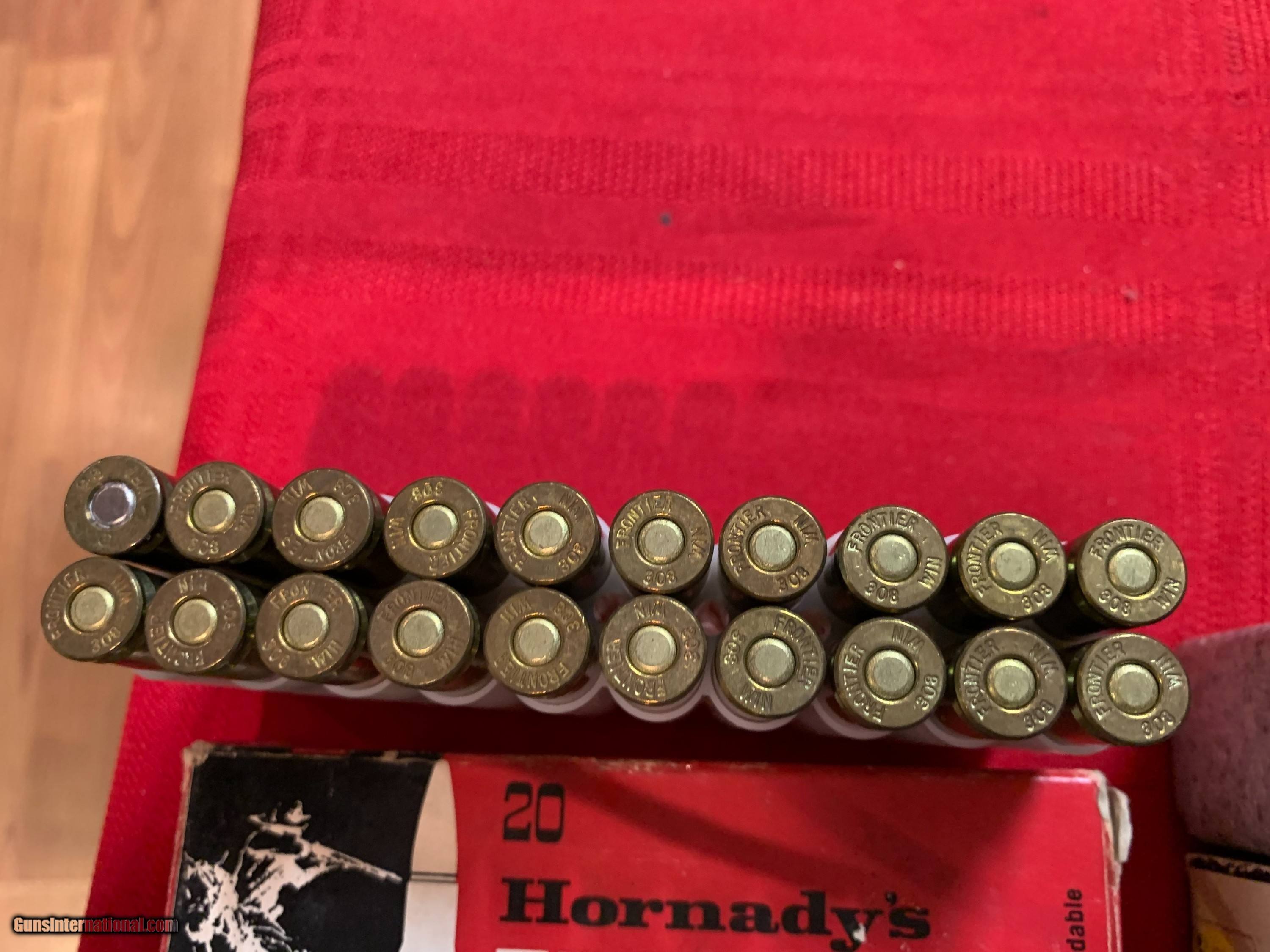 Description: ! box Hornady 308, 150 grain soft points. Plus 19 Centennial 150 grain soft pointsHornady are new factory. Centennial was a souce for remanufactured ammo in the 80s. They used military brass. SOLD Rifle Caliber: .308 Winchester |