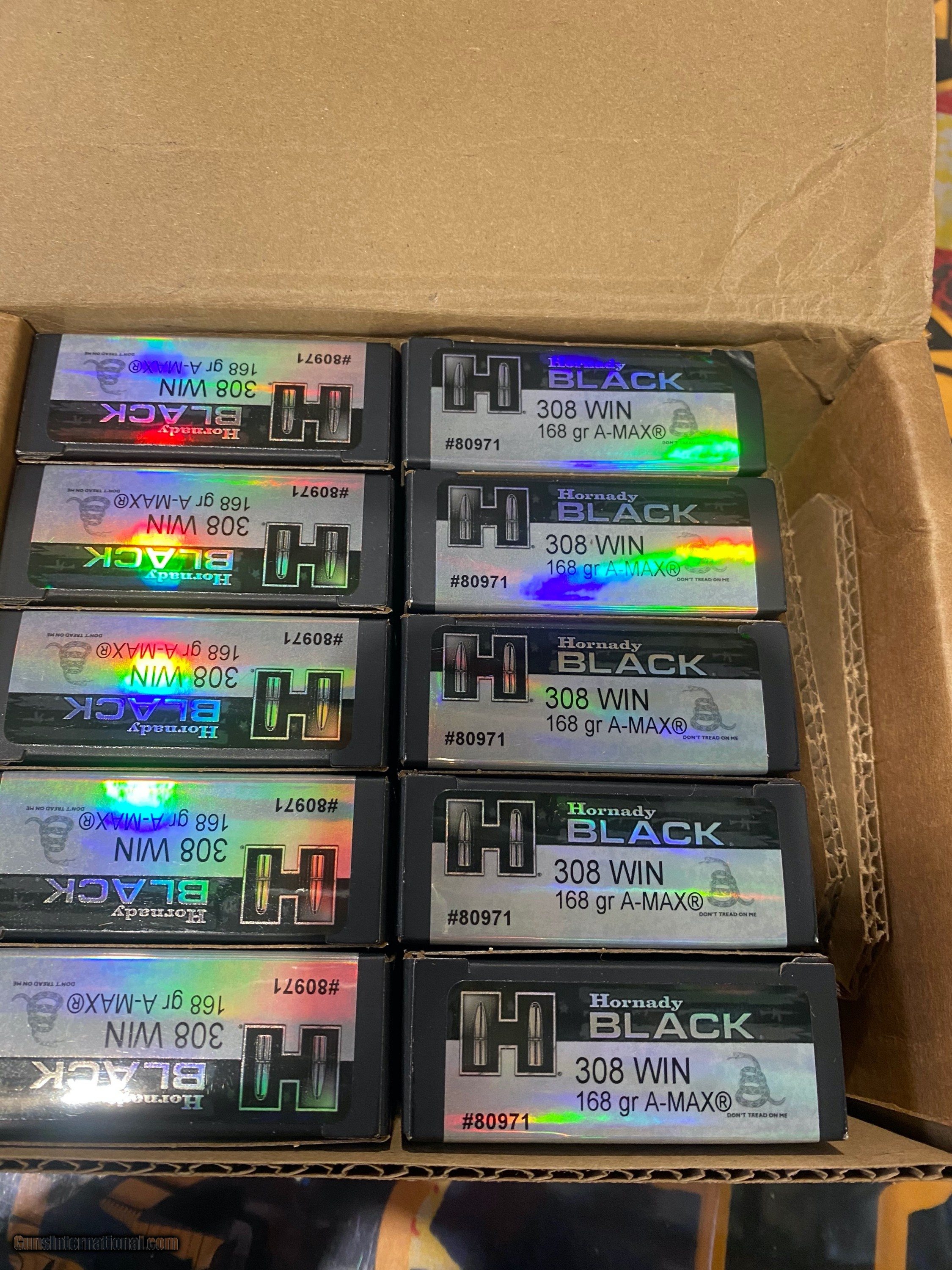 Description: Hornady Black 308 Win 168 grain A-Max. Top of the line. Selling case of 200 rounds for $550. Plus shipping. SOLD Rifle Caliber: .308 Winchester |