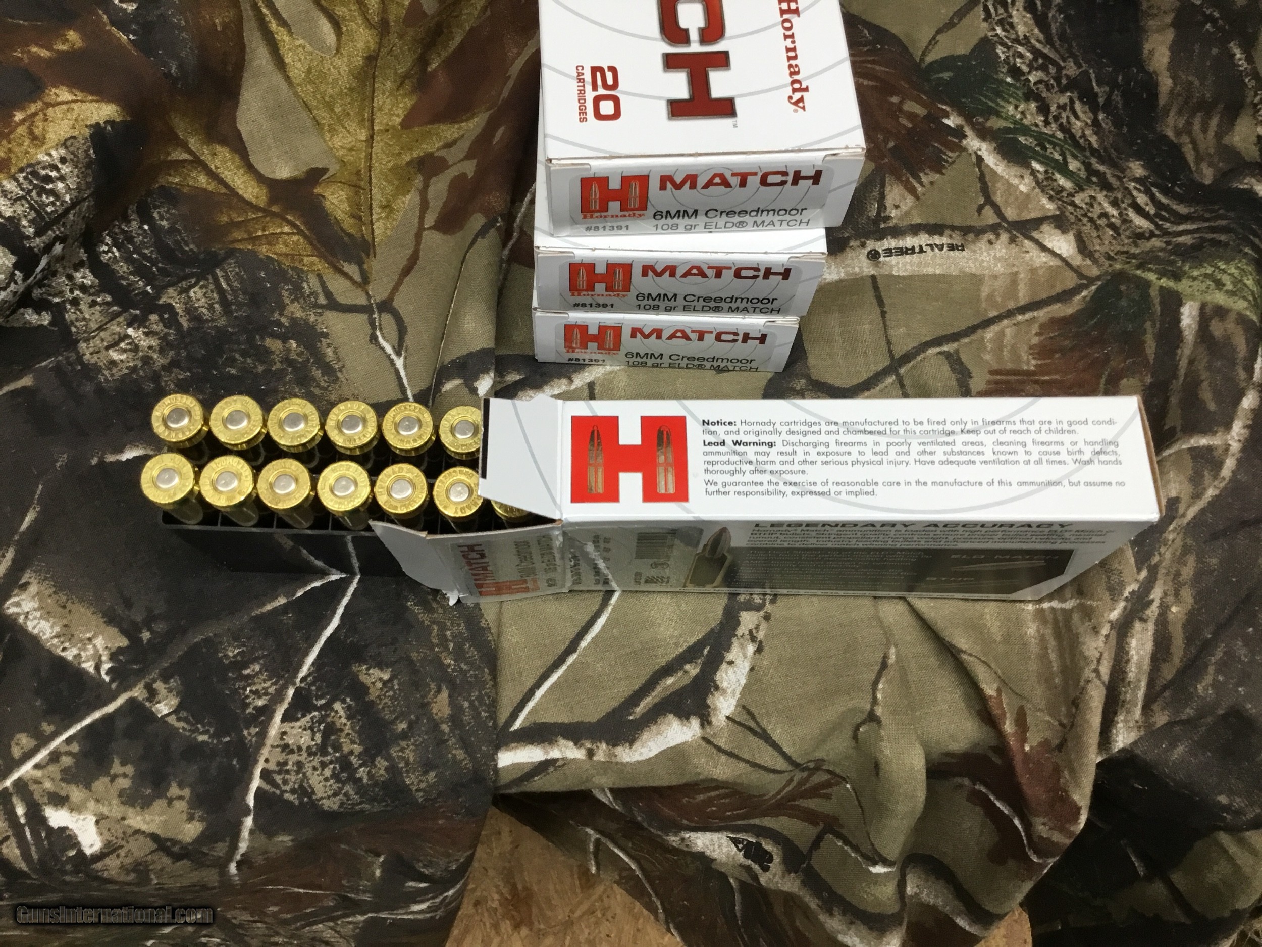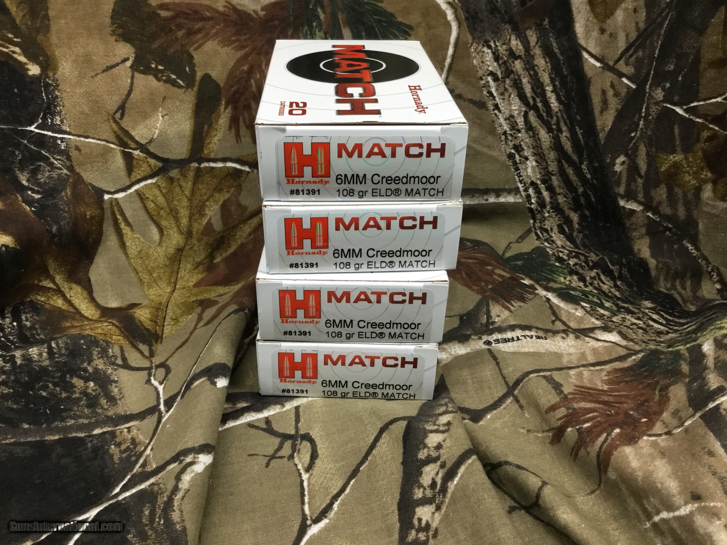 Description: Hornady 6mm Creedmoor 108gr ELD Match 4 boxes …….80rds $149.00 $21.00 to ship Thank you for looking at our items. If it is listed on the site, we still have it in the shop. If you wish to buy, hit buy it now and call the shop to pay. Ask for Bree....... (803) 874-1060. If you are WEST of the Mississippi add $10 more to shipping cost. NO sales to California EXCEPT under certain conditions. If you are in California, please DO NOT push buy it now and just CALL the shop first. ...... (803) 874-1060 NO INTERNATIONAL SALES. SOLD Rifle Caliber: 6mm Creedmoor |