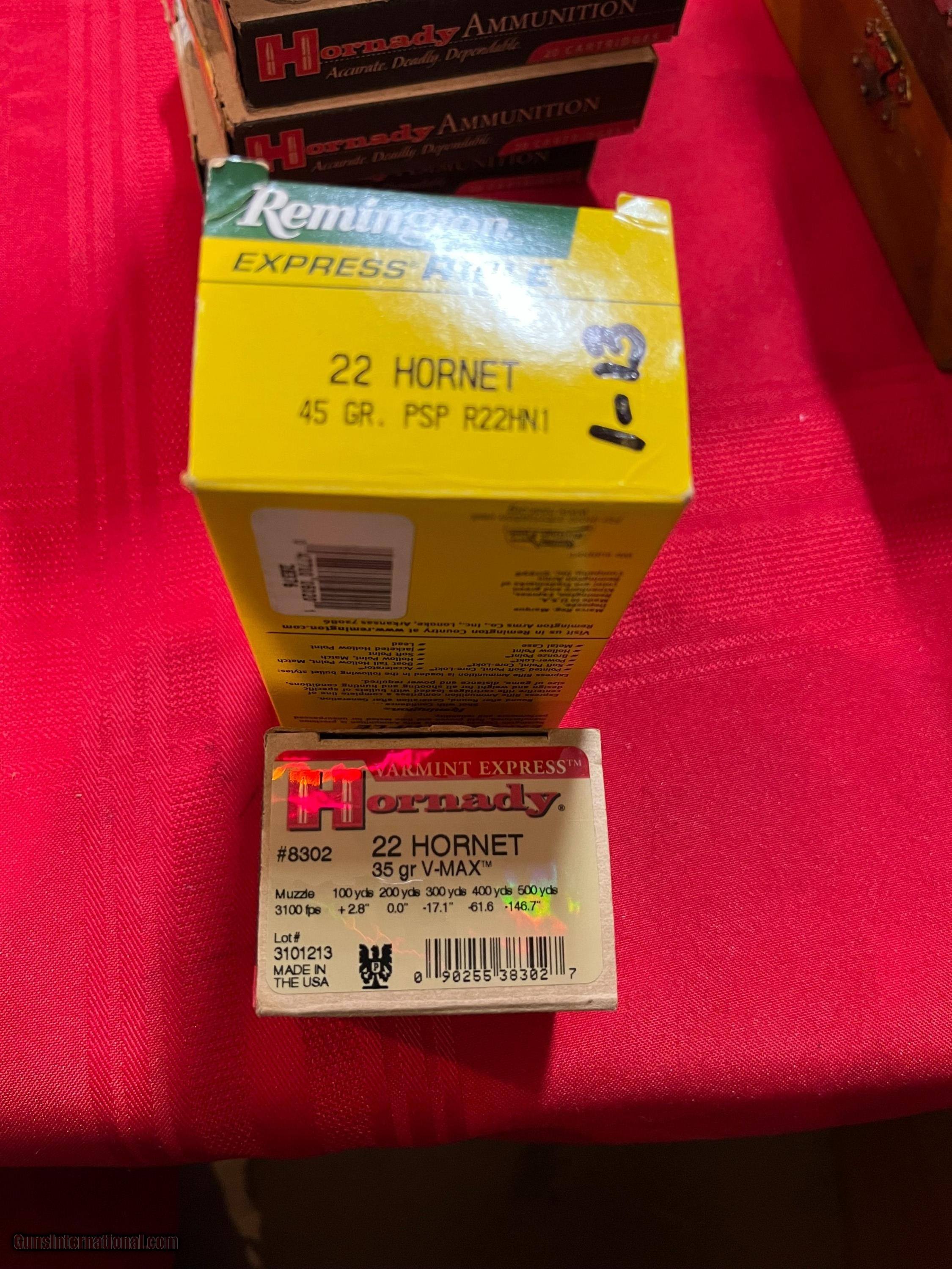 Description: 1. Remington 45 grain pointed soft point 50 rds. 2. Hornady 35 grain vMax 25 rounds SOLD Rifle Caliber: .22 Hornet |