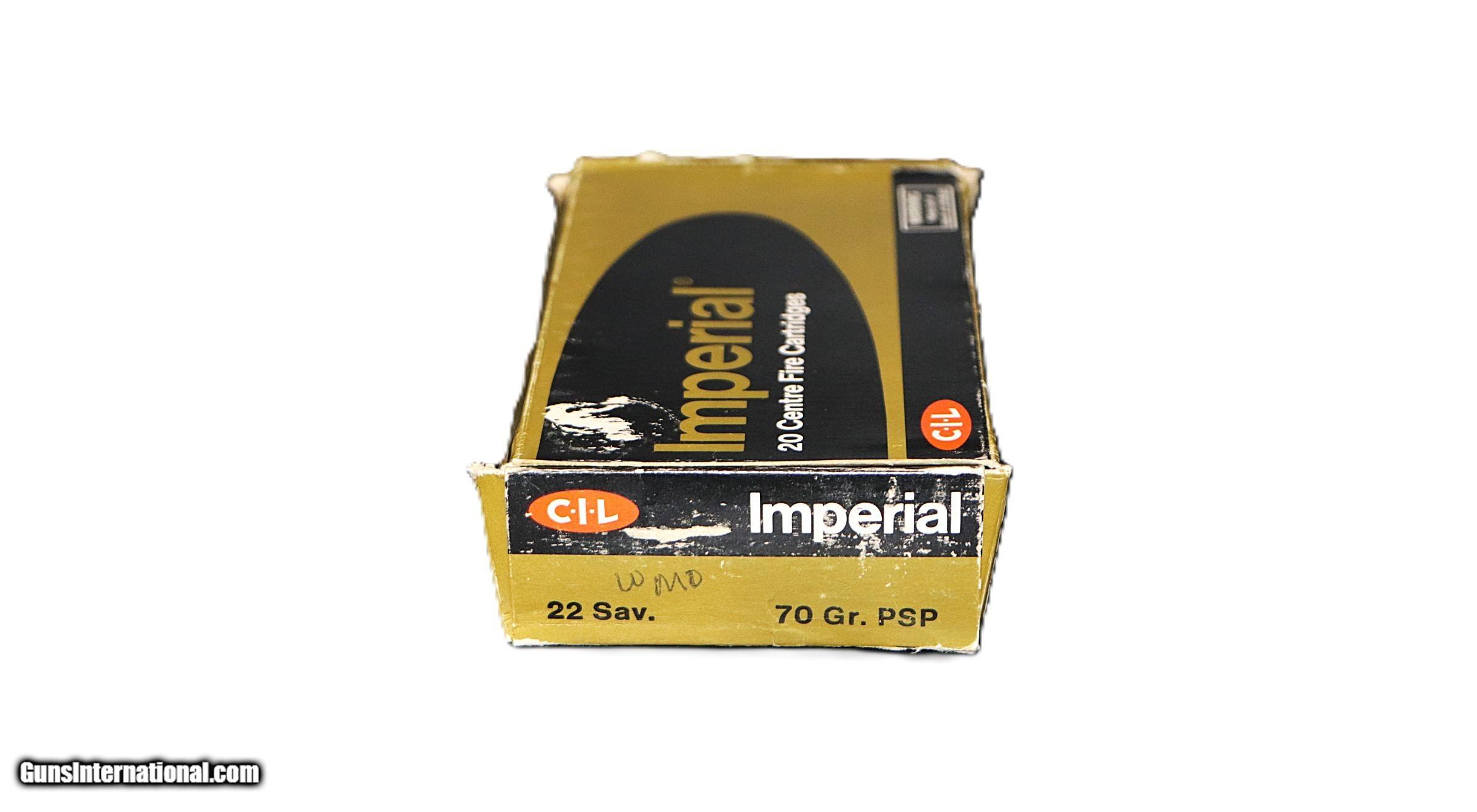 Description: Imperial - 20 Excellent Rounds of .22 Savage in 70 Grain Pointed Soft Point. Box is Good with some scuffs and edge wear. Add $13.50 S+H SOLD Rifle Caliber: .22 Savage Hi-Power |