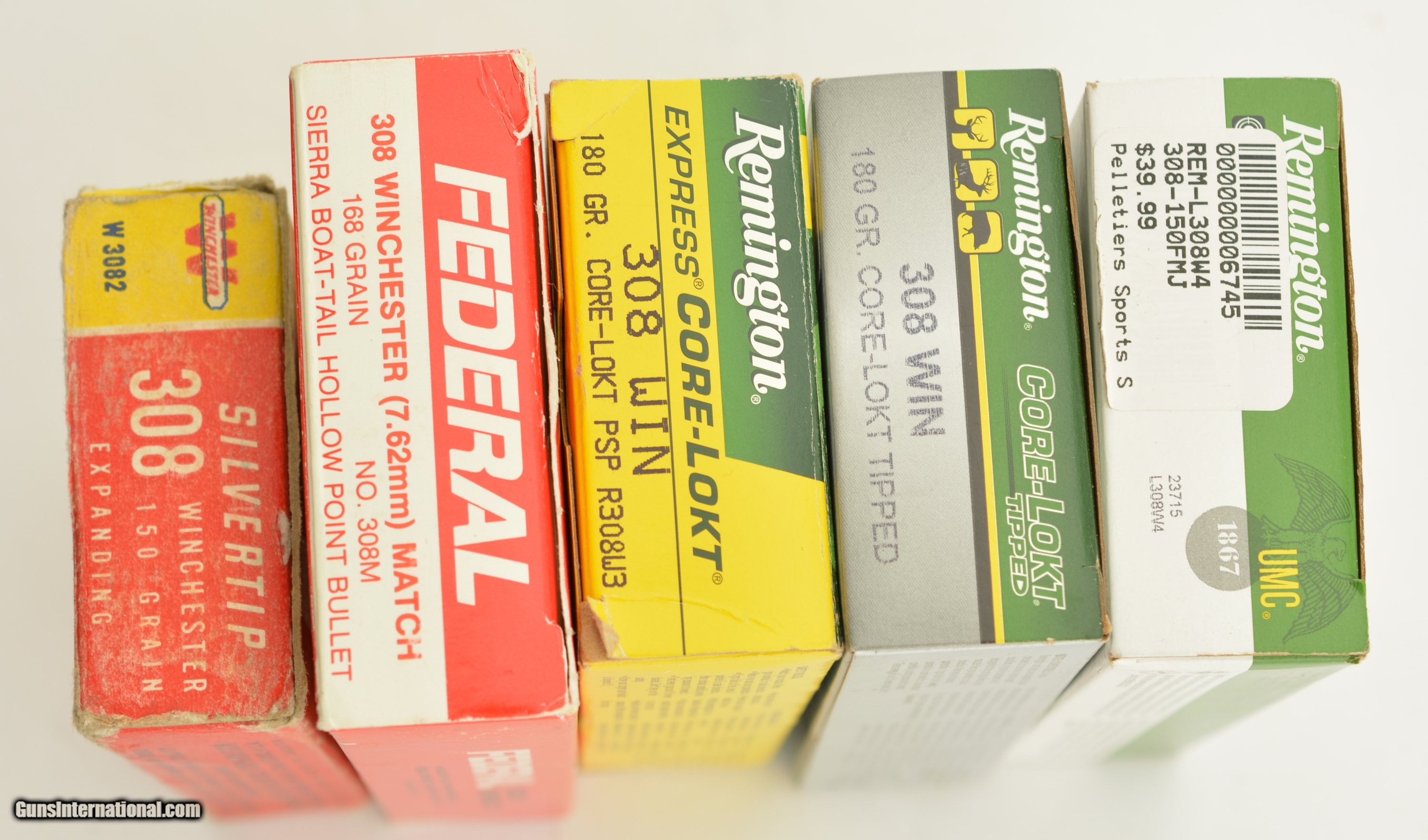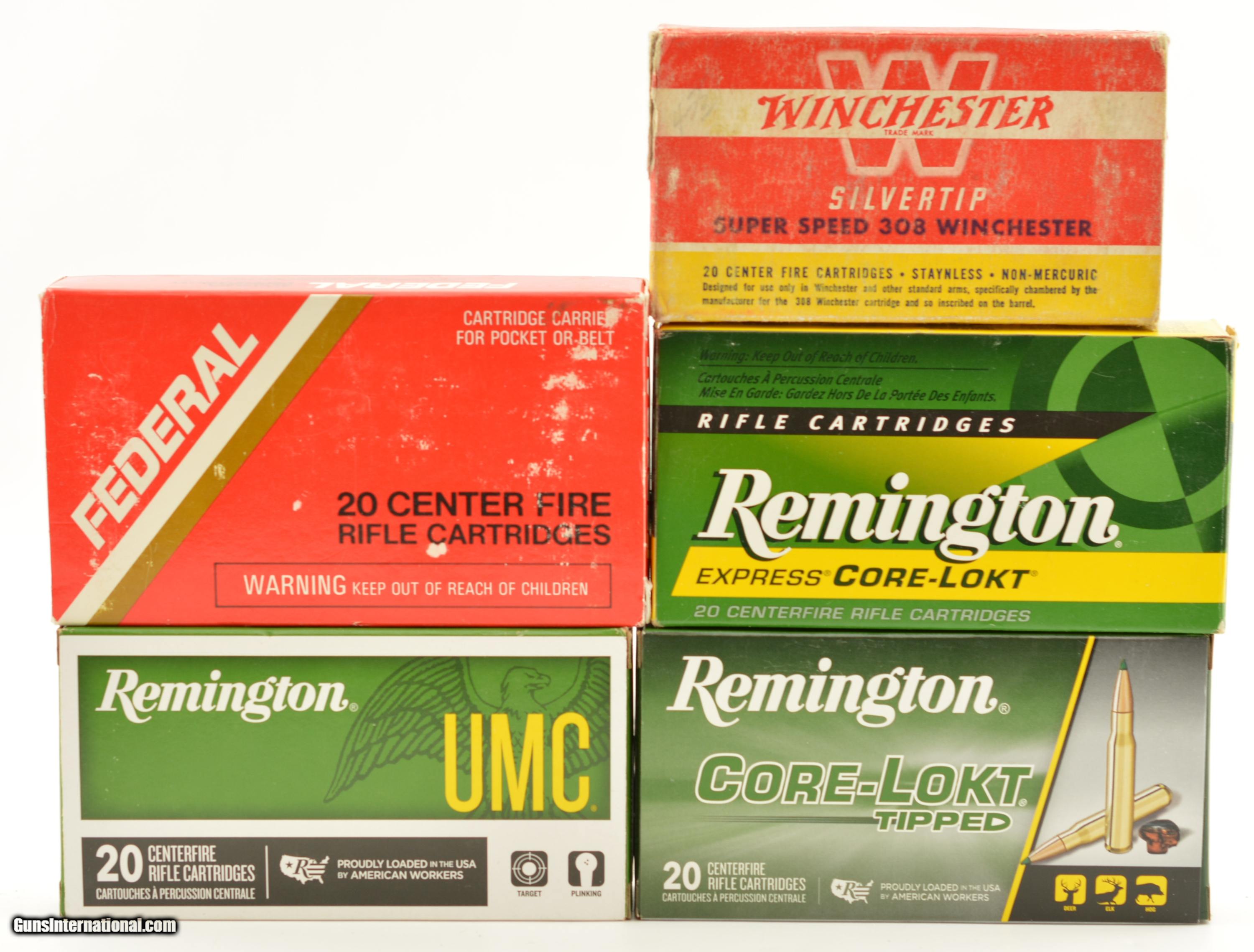 Description: This is a group of NOS 308 Winchester consisting of one box of Lake City military in a Winchester box, one box of Federal Match 168gr. Sierra BT HP bullet, one box of Remington Core-Lokt 180gr. PSP, one box of Remington Core-Lokt 180gr. Green Tipped and one box of Remington UMC 150gr. FMJ. 5 full boxes for a total of 100 cartridges. SOLD Model: Ammo Caliber Info: .308 Gauge Info: .308 |