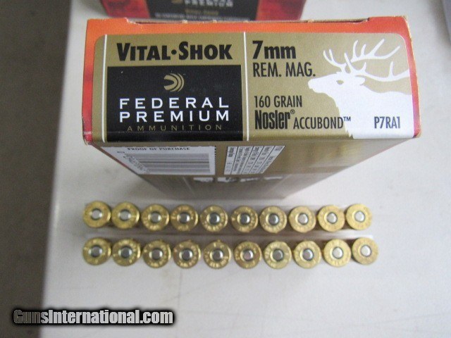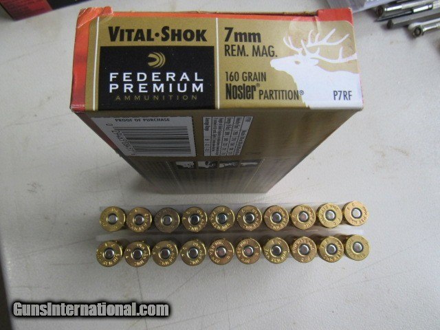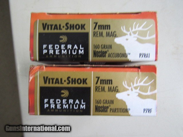 Description: NEW OLD STOCK Federal Vital Shok 7mm Rem Mag ammunition, 2 full boxes. One box has the 160 grain Nosler Partition bullet and one box has the 160 grain Nosler Accubond bullet. For use Winchester, Marlin, Remington, Savage and other rifles. This load is a target and hunting round especially good on large game such as elk, moose and bear. I pay the shipping! Don't miss out, they won't last long... TERMS: PLEASE KNOW YOUR LOCAL LAWS AS I DON'T KNOW THE LAWS FOR EVERY STATE. BY PURCHASING YOU CERTIFY YOU ARE AT LEAST 21 YEARS OLD AND CAN LEGALLY PURCHASE AMMUNITION DIRECTLY. PHOTO ID REQUIRED. SALES TO NEW YORK STATE MUST GO THROUGH AN FFL, NO EXCEPTIONS! No international sales. 3 day non-use inspection. Buyer pays return shipping. Payment by bank check, personal check or money order. All major credit cards accepted with 4% convenience fee added. Always interested in used long guns and used antique handguns so please contact me if you have anything for sale or trade. 315.251.4799 with questions or concerns. FREE SHIPPING!! SOLD Rifle Caliber: 7mm Remington Magnum |