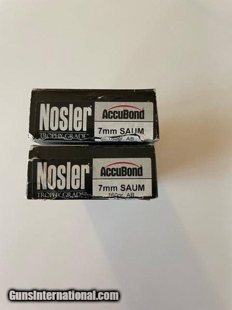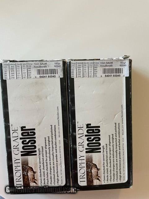 Description: I HAVE 2 FULL BOXES OF NEW NOSLER 7MM SAUM AMMUNITION, 20 ROUND BOXES BOTH LOADED WITH ACCUBOND BULLETS. $260.00. THE PRICE IS FOR BOTH BOXES. SHIPPING IS $20.00 TO CONTINENTAL US STATES. SOLD Rifle Caliber: 7mm Remington Short Action Ultra Magnum |