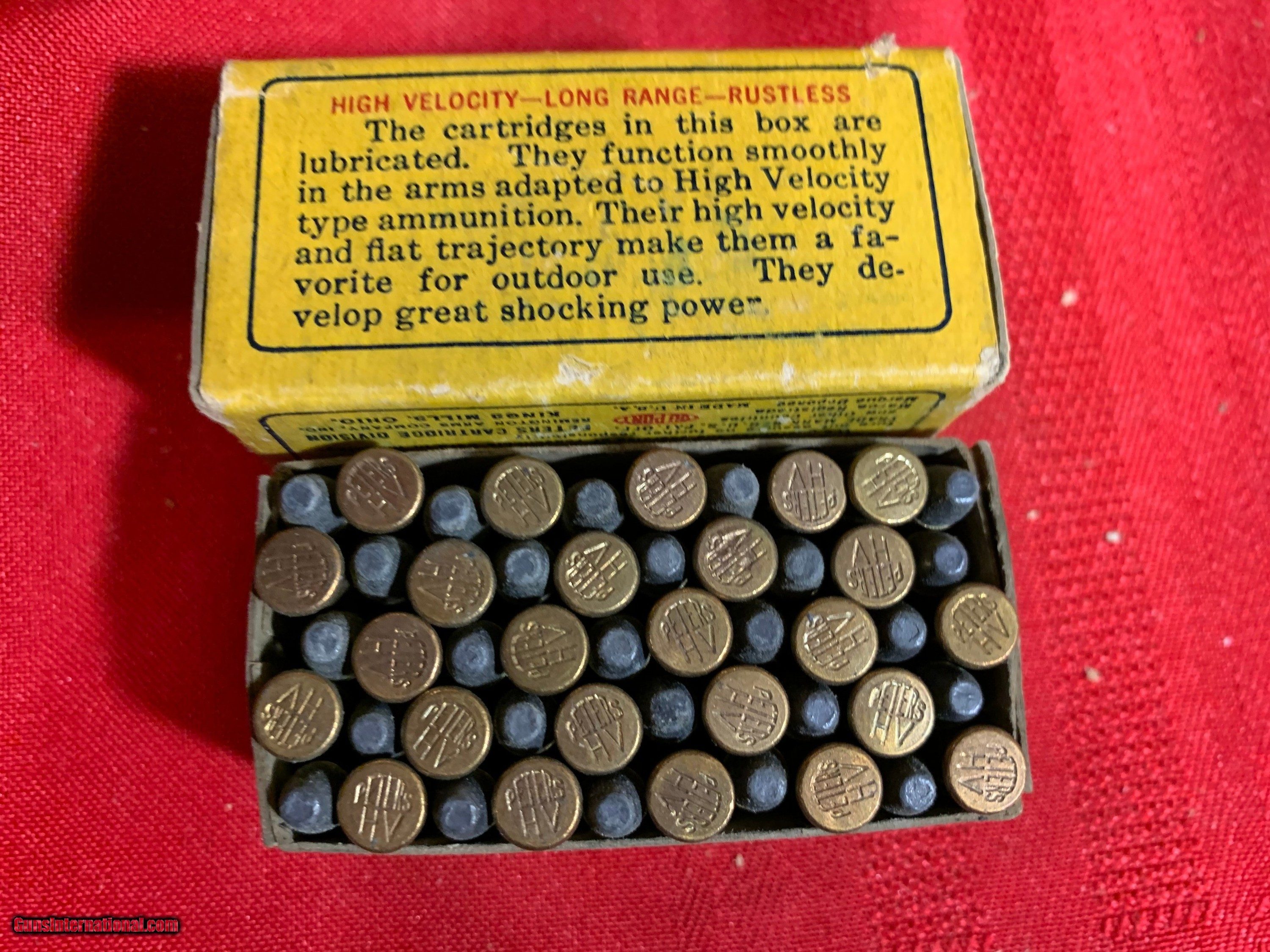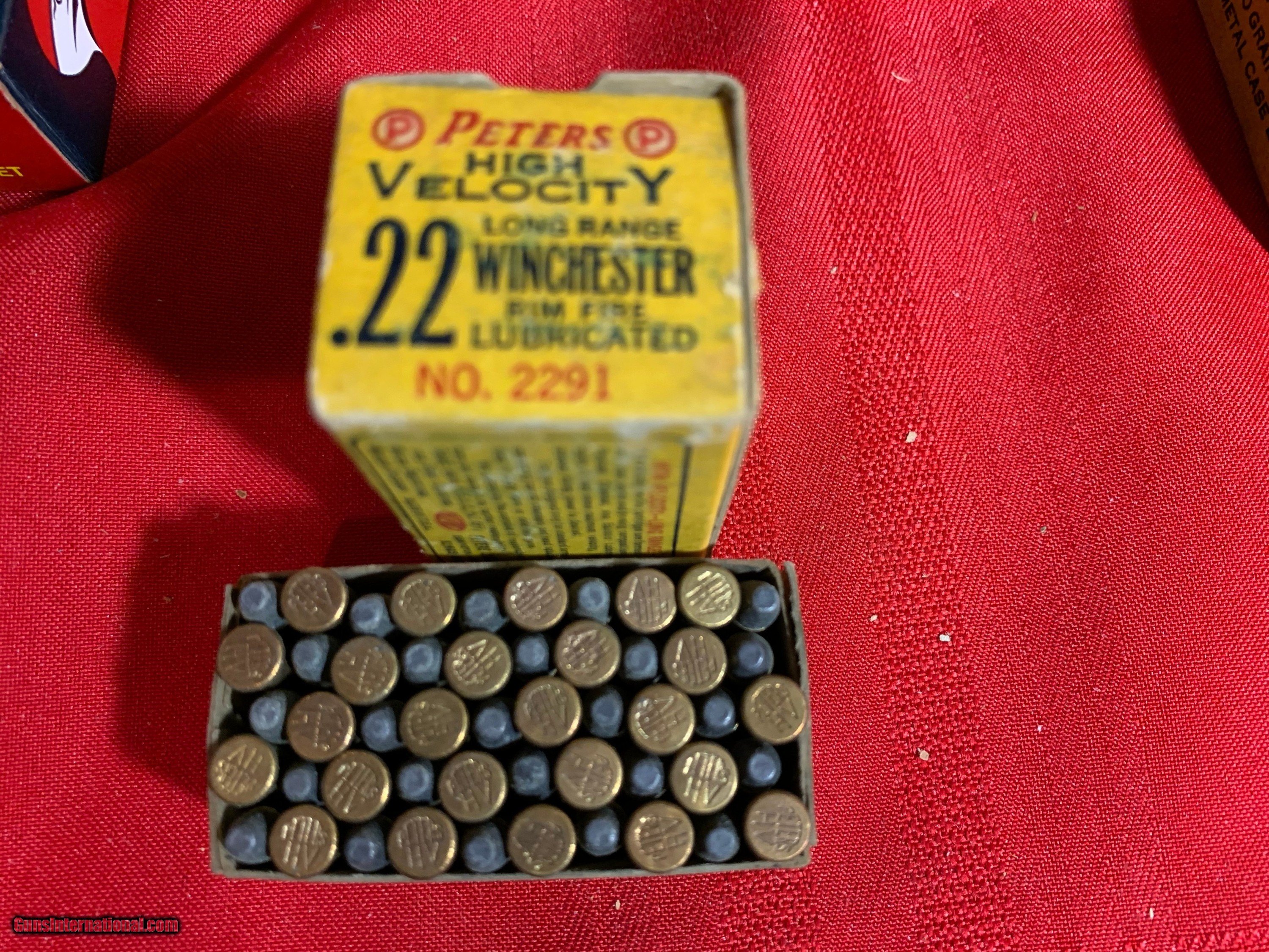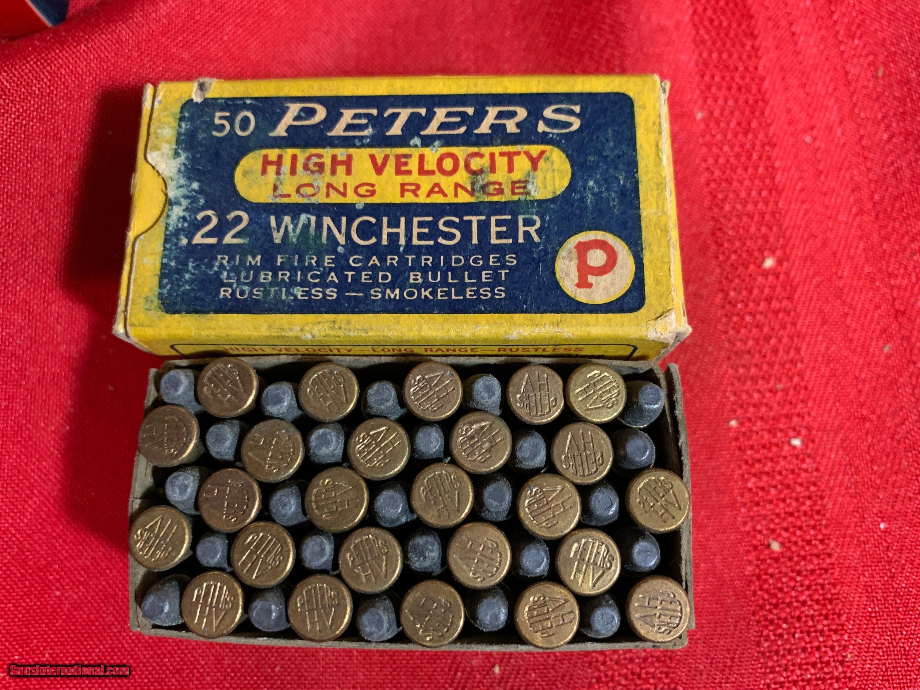 Description: A nice box of Peters 22 WRF. Box is solid with some shelf wear. Ammo is excellent. SOLD |
