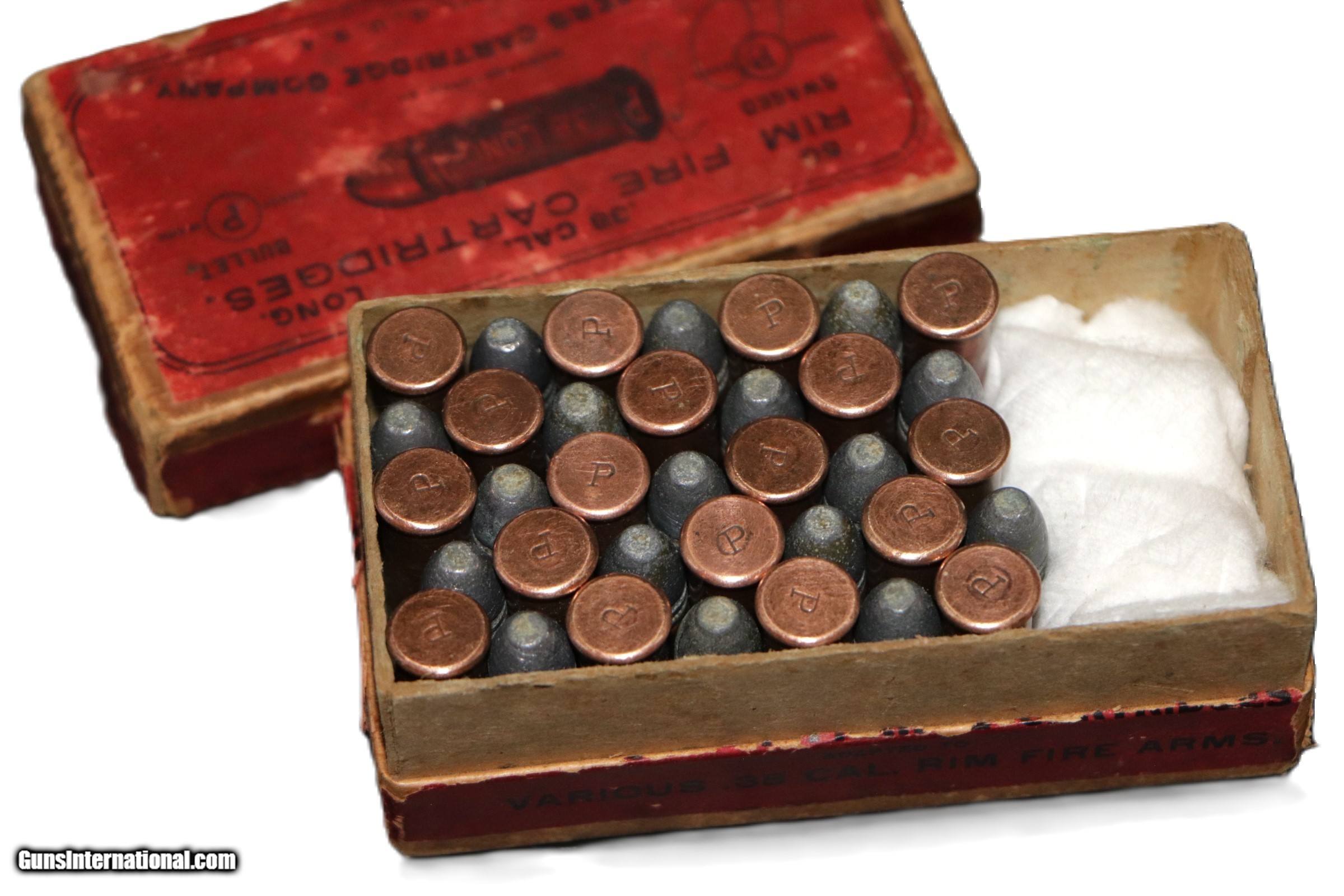 Description: Peters ,38 L RF, "Arched Logo" Blk Pwdr box, Late 1890s to early-1900s vintage. Partial with 35 Rds in VG Condition. Box is Fair-Good. Writing on top panel. Scuffs, corner and edge wear and tape residue. Ad $14 S+H SOLD |