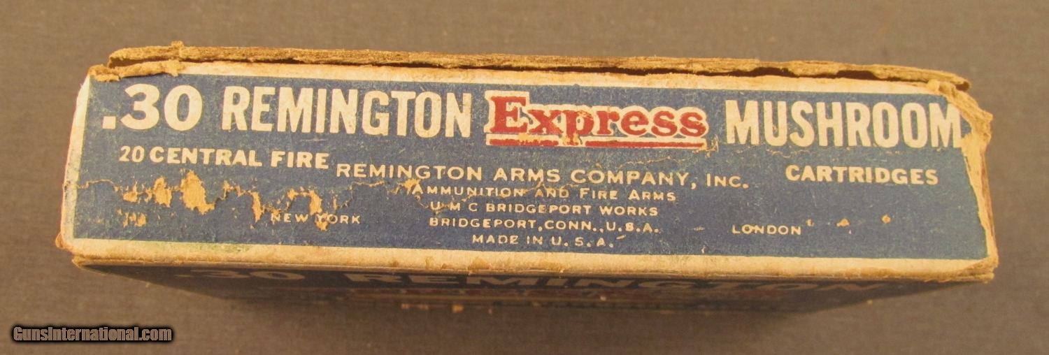 Description: This full 20 round box has the desirable express train graphics on a blue background and is in the 30 Remington 165 grain mushroom bullet loading. Box is missing both end flaps and is split along back of top. Front and back labels are fully legible and this box is a great candidate for restoration. A very rare express box in the best caliber. SOLD Manufacturer: Remington Model: Ammo Caliber Info: .30 Rem Gauge Info: .30 Rem |
