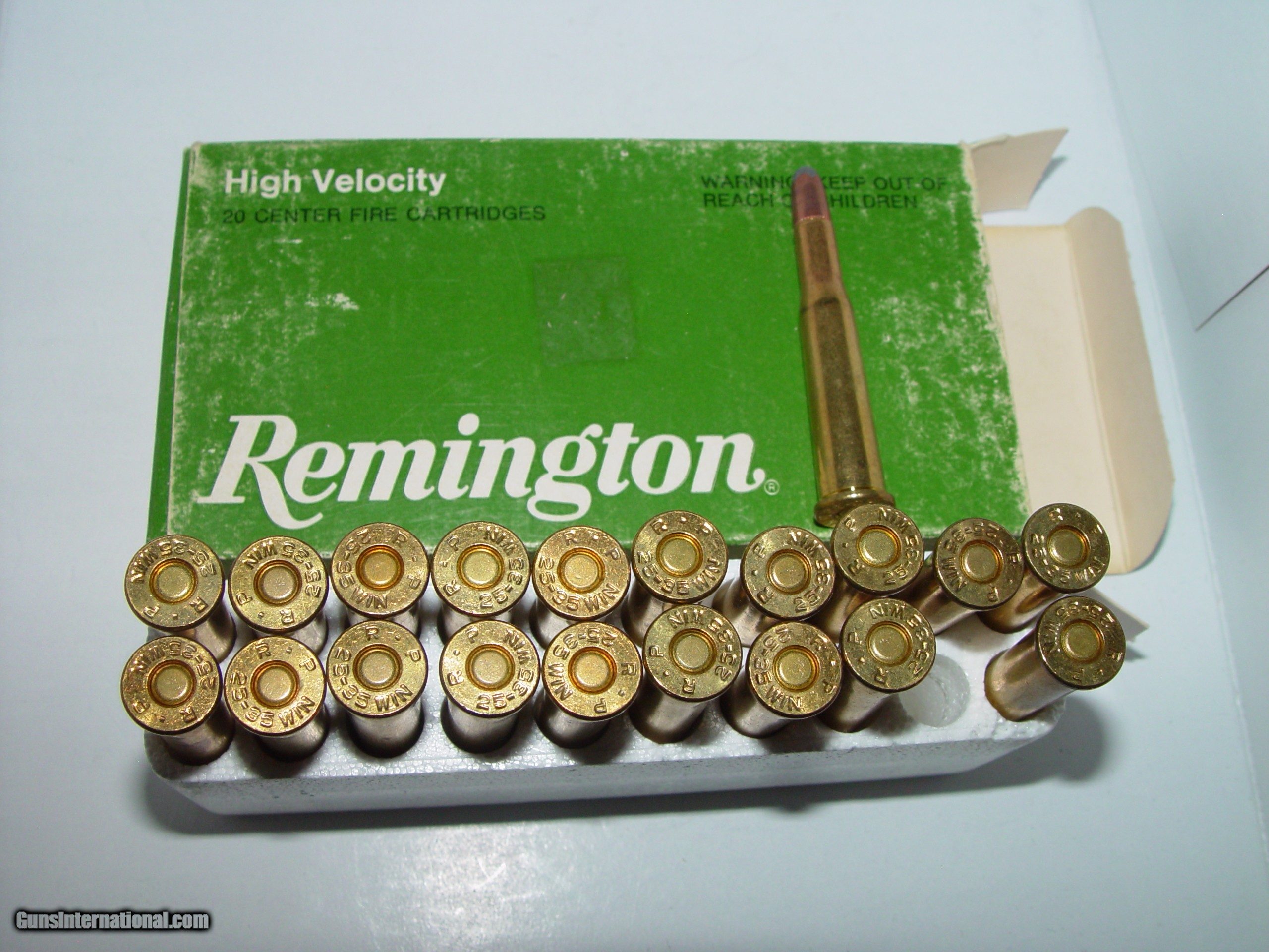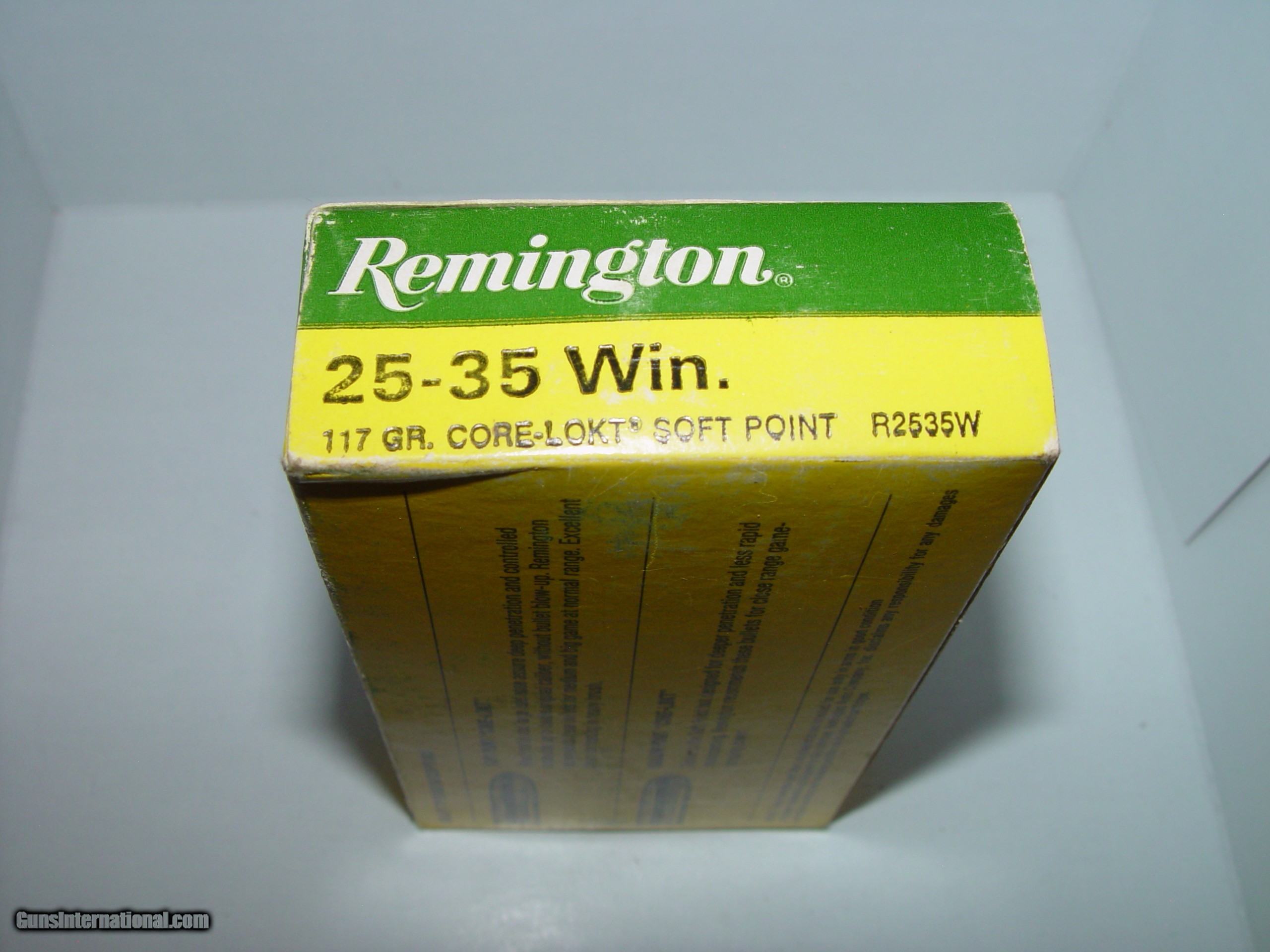 Description: Remington .25-35 ammunition in modern box. Factory ammo, bright & clean. SOLD Rifle Caliber: .25-35 Winchester |
