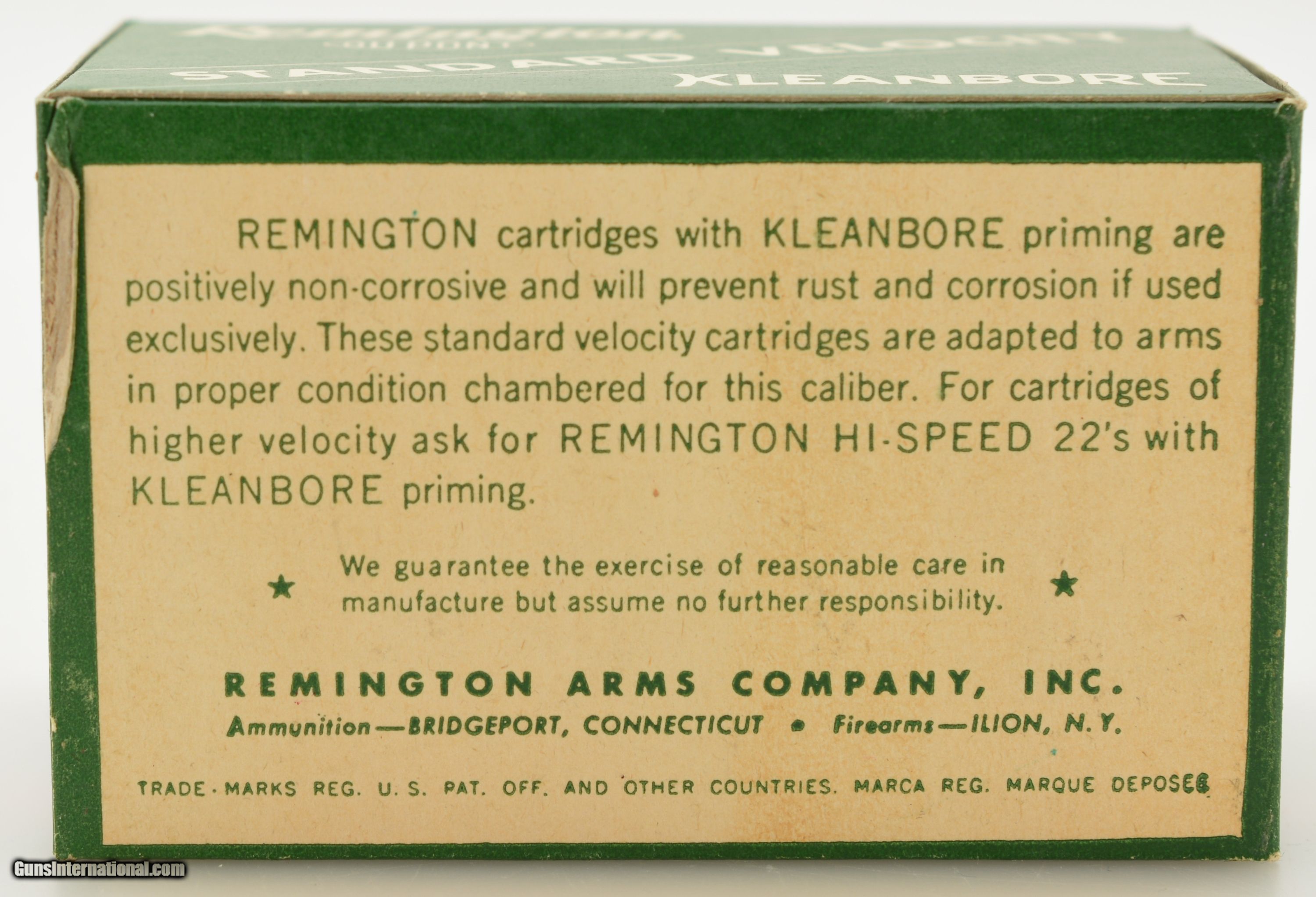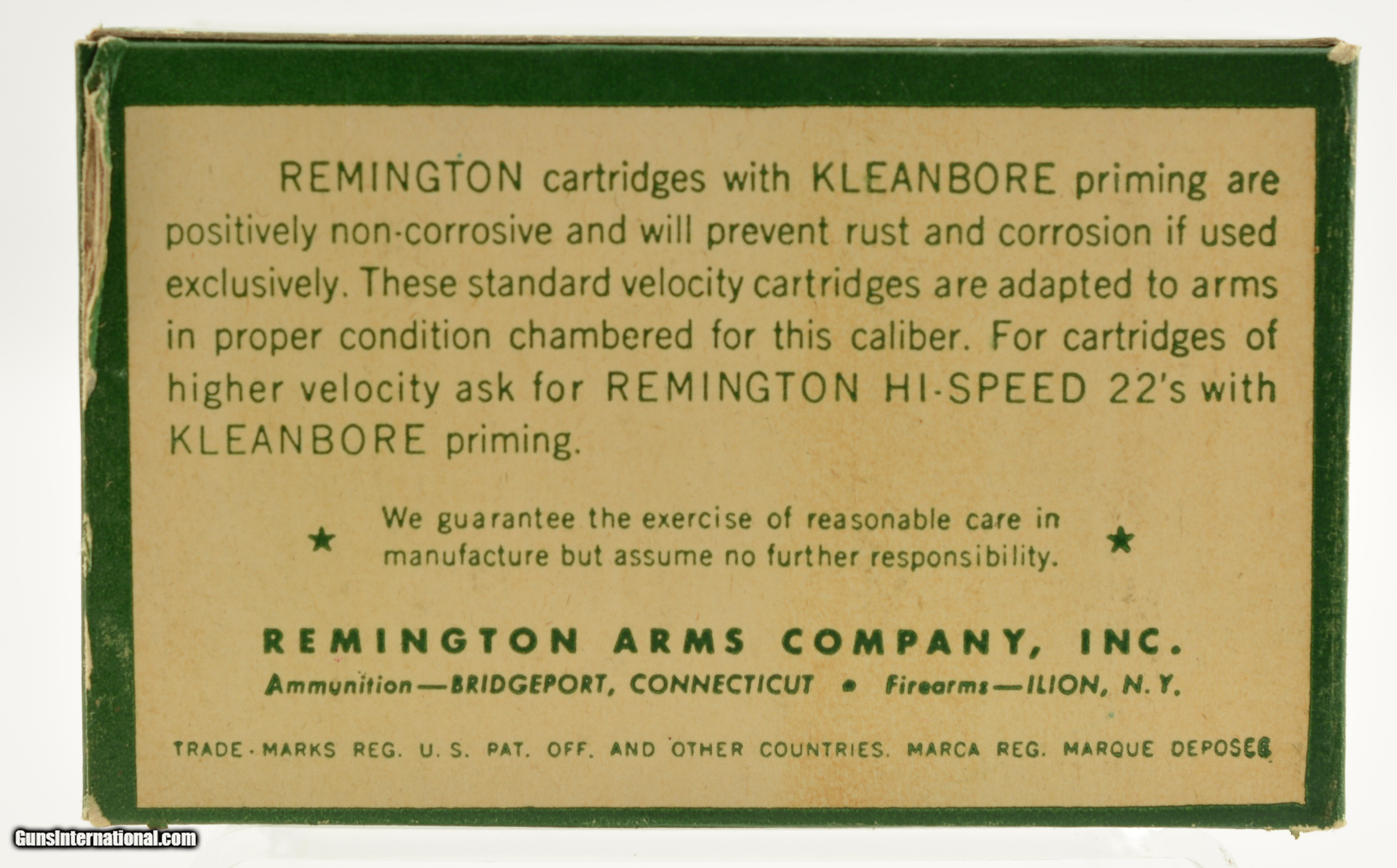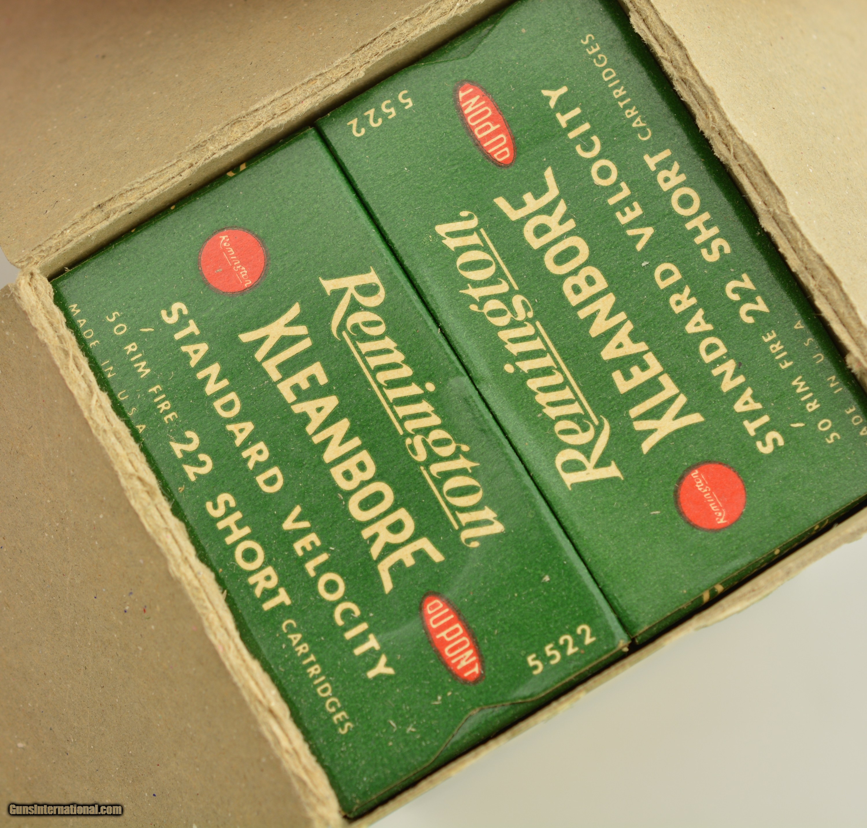Description: This is a full brick (10 boxes with 500 total rounds) of the 1946 Standard Velocity issue Kleanbore .22 Short ammo listed as 1946 S-2ba. The brick carton is in excellent condition with the dark green and red graphics with minor handling wear and contains 10 brick fresh boxes. SOLD Manufacturer: Remington Model: Ammo Caliber Info: .22 Short Gauge Info: .22 Short |