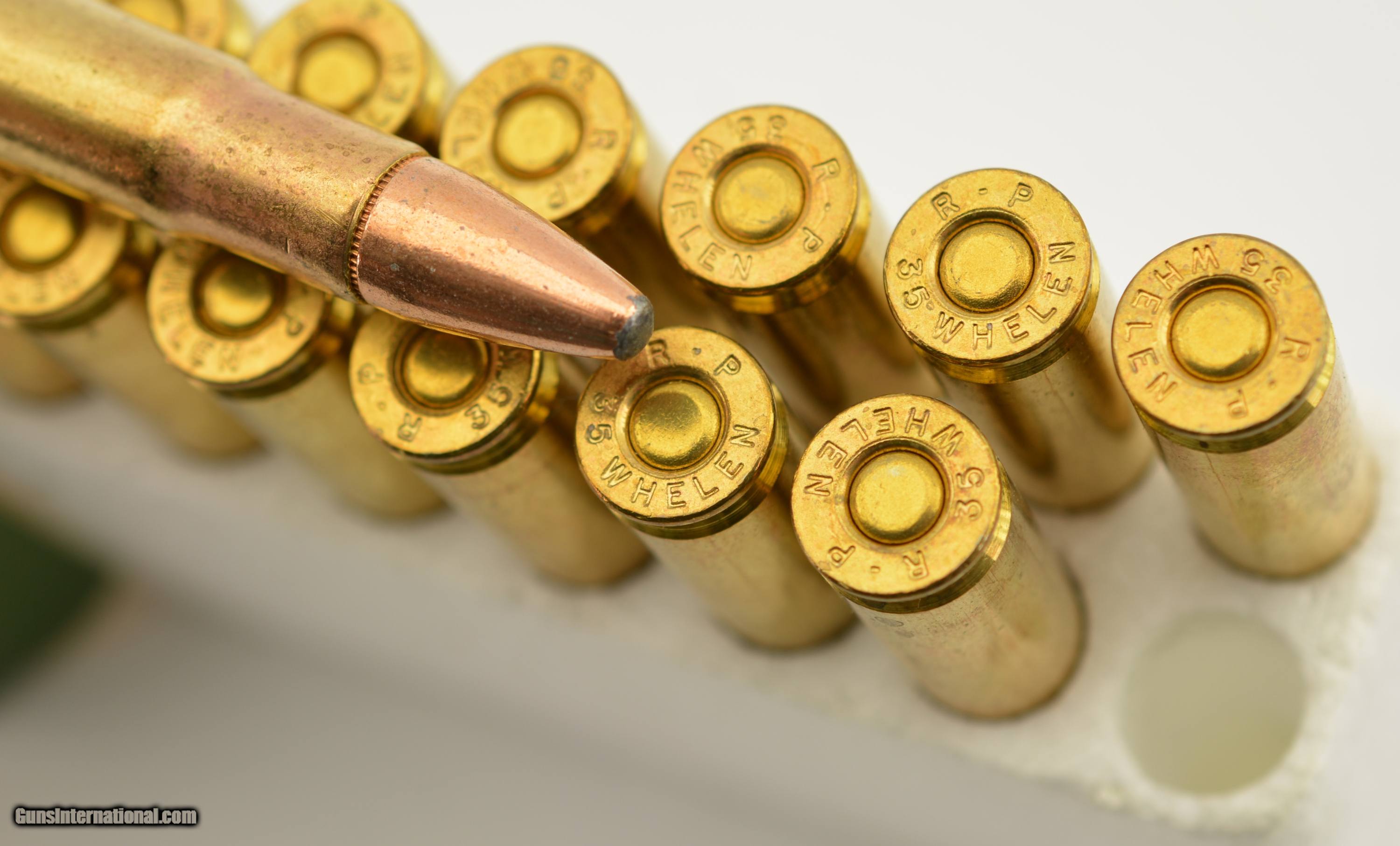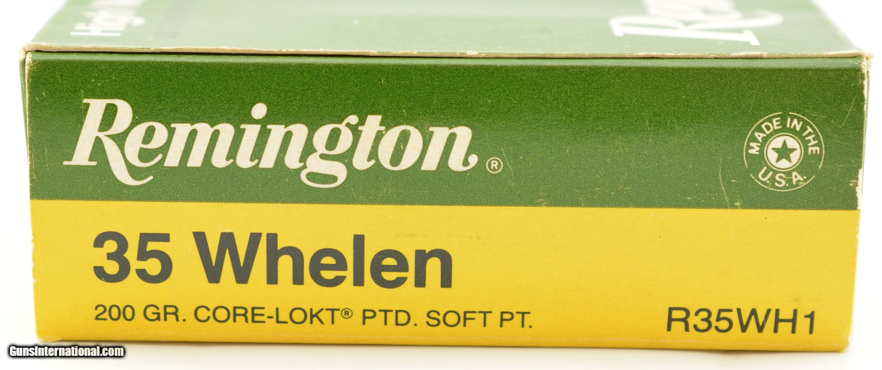 Description: This is a full box, 20 original rounds, of .35 Whelen ammunition manufactured by Remington with 200 grain pointed soft-point, CORE-LOKT bullets. The box and cartridges are in excellent condition. SOLD Manufacturer: Remington Caliber Info: .35 Whelen Gauge Info: .35 Whelen |