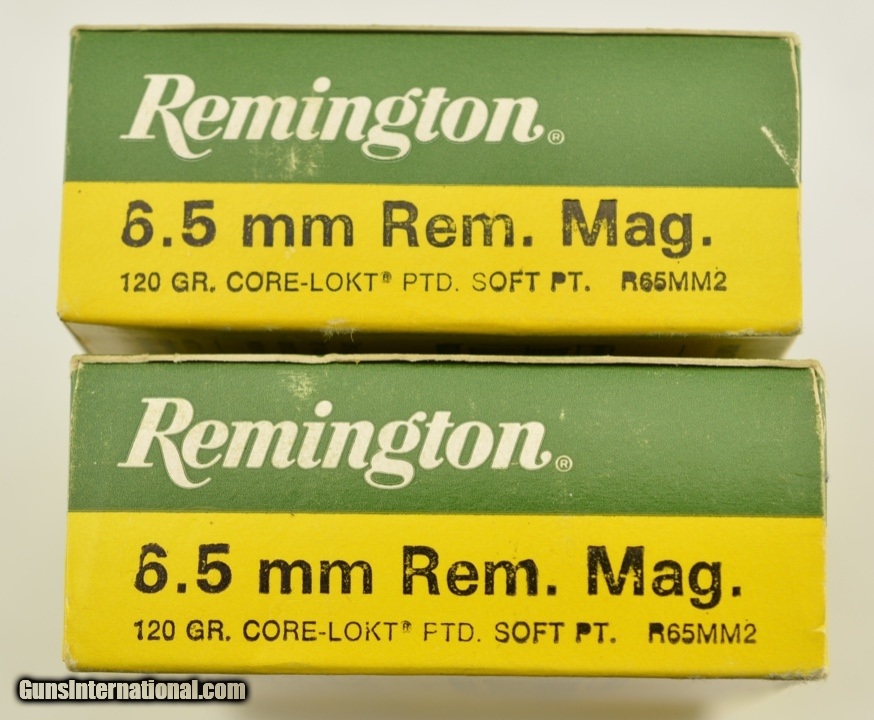 Description: This is 5 full NOS boxes of 20, Remington 6.5mm Rem. Magnum 120gr. PTD. SP Core-lokt R65mm2 ammunition. SOLD |