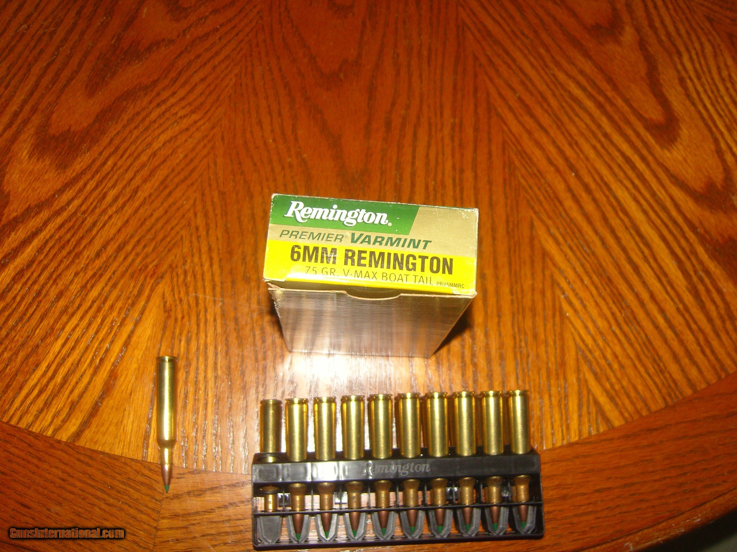 Description: Remington 6 mm Premier Varmint 75 gr. V Max Boat Tail. Full box of 20. NOS. Same as .244 caliber. Seldom avail. for purchase. click on pics to enlarge, ck out my other listings. Only $ 75 SOLD |