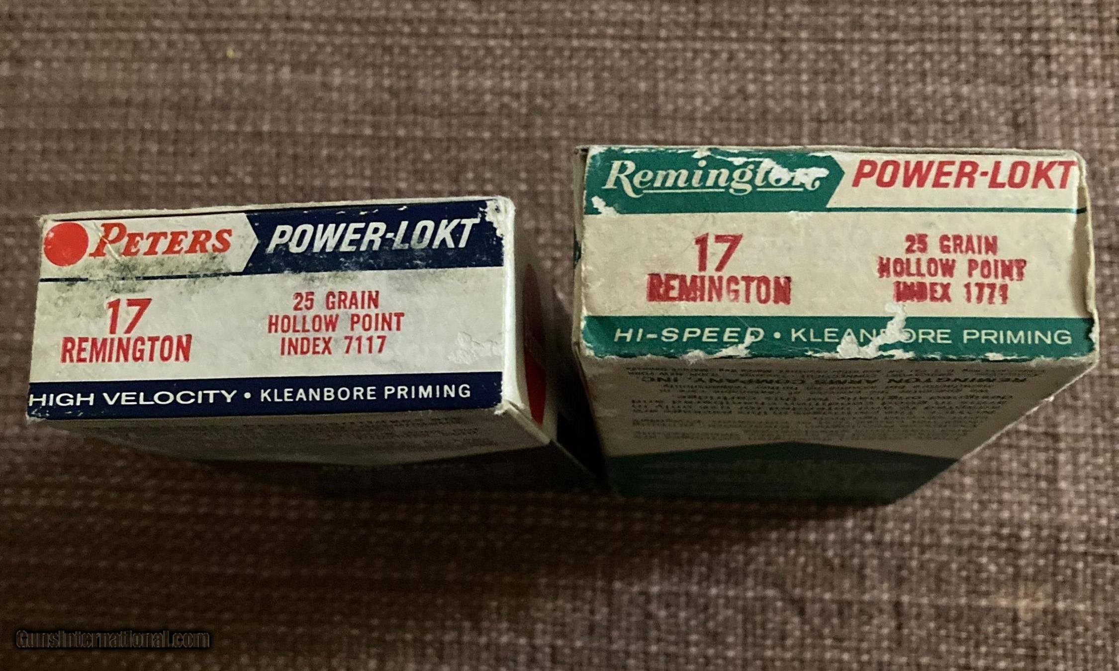 Description: New, factory original, Remington and Peters .17 caliber 25 grain Power Lokt Hollow Point ammo. 2 boxes Peters, 3 boxes Remington. Buyer pays actual shipping. SOLD Rifle Caliber: .17 Remington |