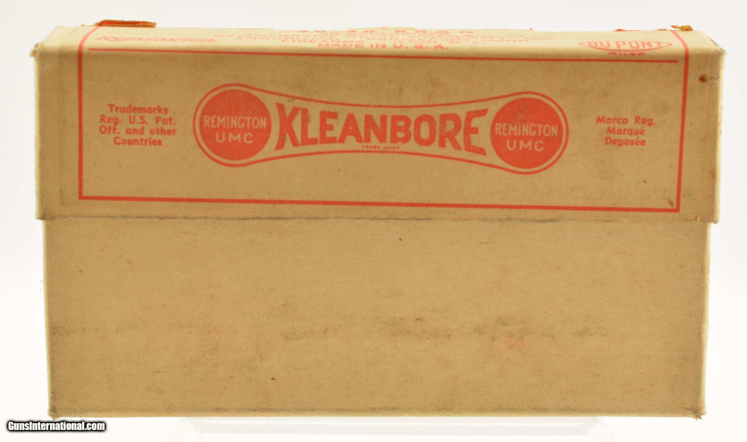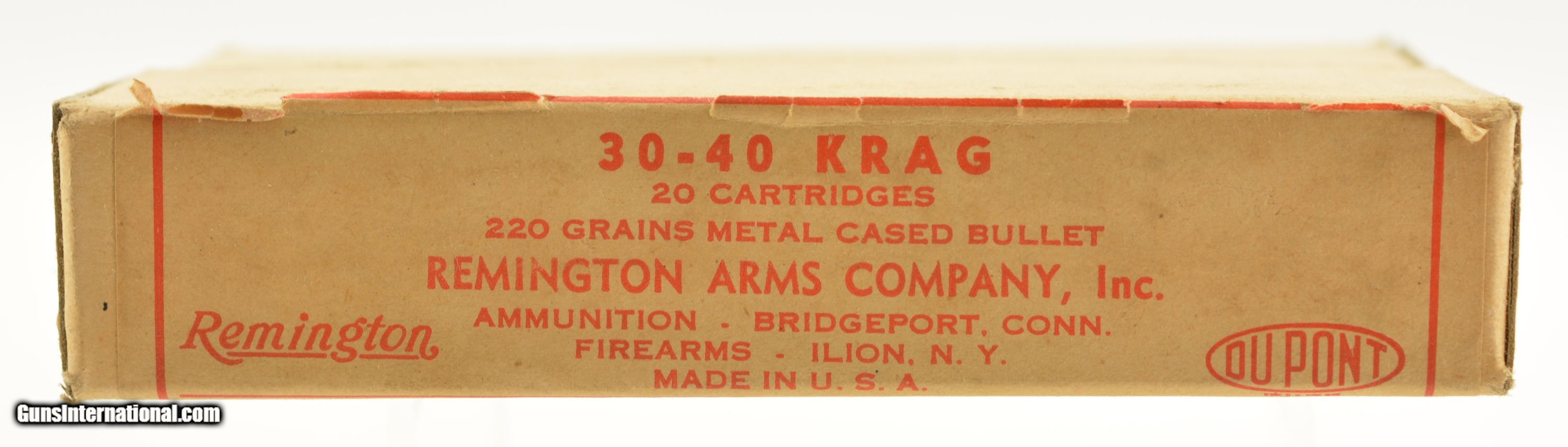 Description: This is a full box of 20, Remington-UMC, Kleanbore, .30-40 Krag, 220 Grain Metal Cased Bullet, 2pc. Buff box with buff dog bone label, box is solid with excellent color, minor age soiling, very minor corner wear, edges are mostly crisp, label is intact with minor rolled edge, ammo is very good to excellent. SOLD Manufacturer: Remington Model: Ammo Caliber Info: .30-40 Gauge Info: .30-40 |