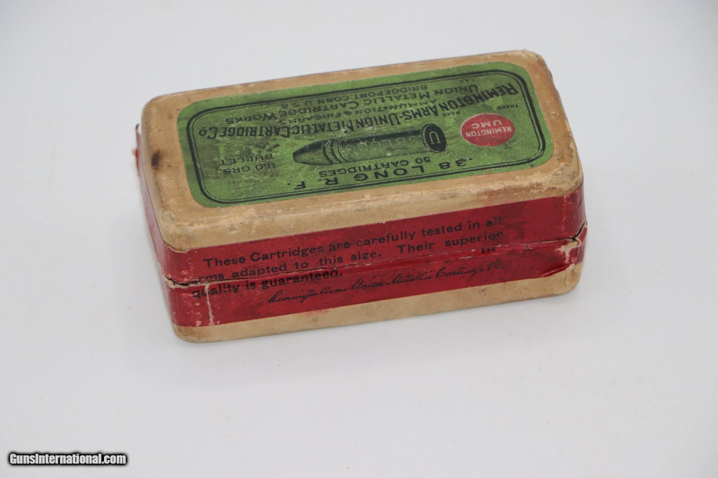 Description: Remington-UMC 38 Long Rimfire Blk. Powder Box. Red side-seal label approx 80%. Full of correct "U" headstamped cartridges in exc codition. Box has no sign of repairs or splits. Add$14 for S+H SOLD Rifle Caliber: .38 Rimfire |