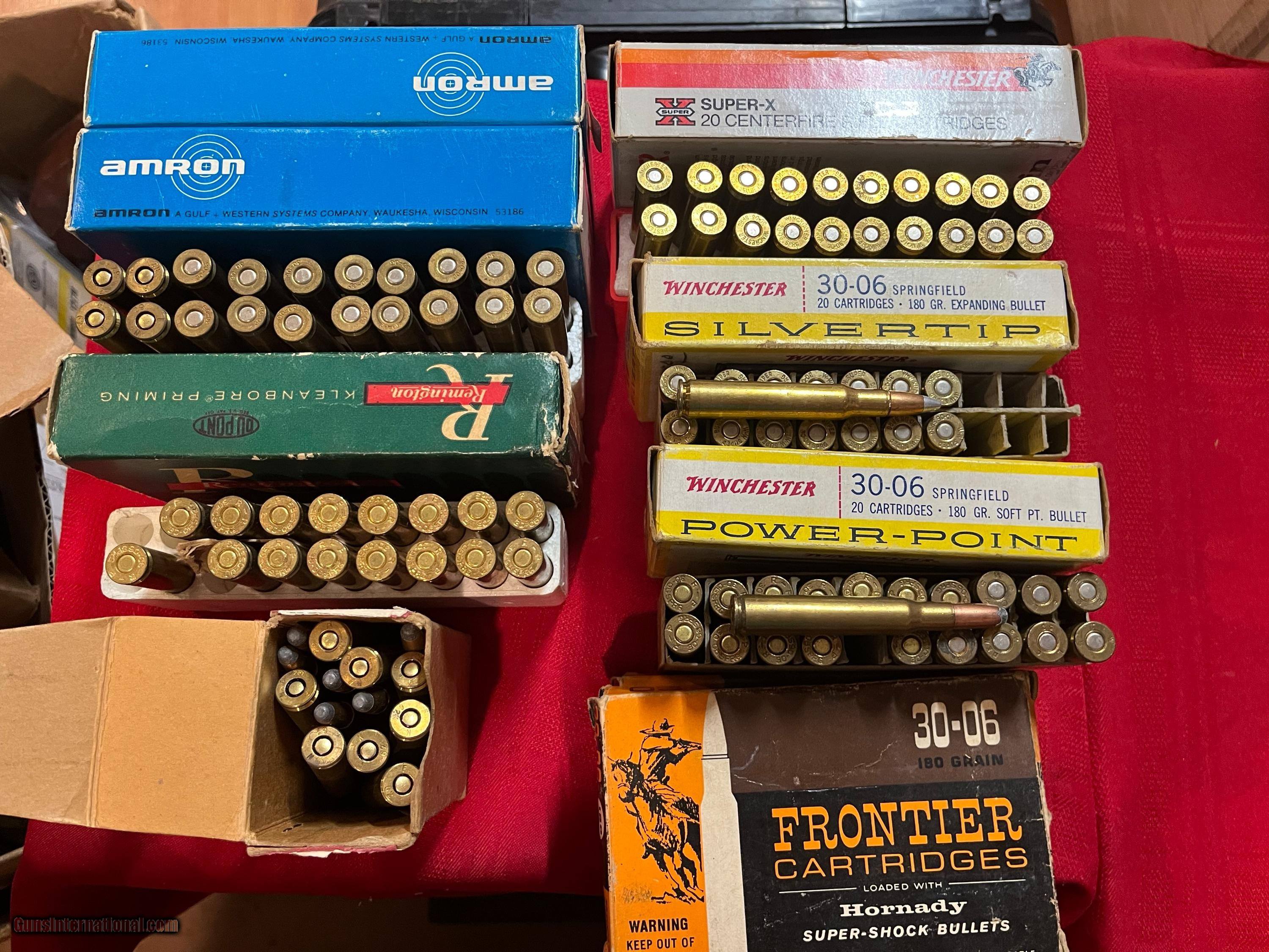 Description: Winchester: 1. 2 boxes 180 grain soft point factory 2. 15 rounds 180 grain Silvertip " Remington: 1. 16 rounds 180 grain soft point " Amron 1. 2 boxes 150 grain soft point remanufactured Various 60 cases SOLD Rifle Caliber: .30-06 Springfield |