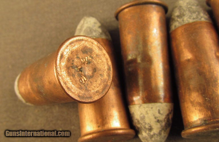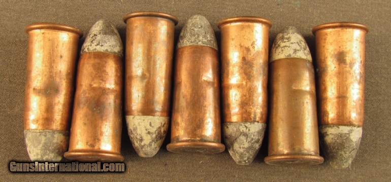 Description: Seven rounds of .56-50 with "SAW" impressed headstamp. These were built from 1864 to 1866 by sage in Cincinnati Ohio and remain in very good condition with staining and light verdigris on the copper cases. Three stab crimps hold bullet from seating deeper in magazine. This is genuine civil war ammo built under government contract, a great display item to show with your Spencer. SOLD Manufacturer: Spencer Model: Ammo Caliber Info: .56-50 Gauge Info: .56-50 |