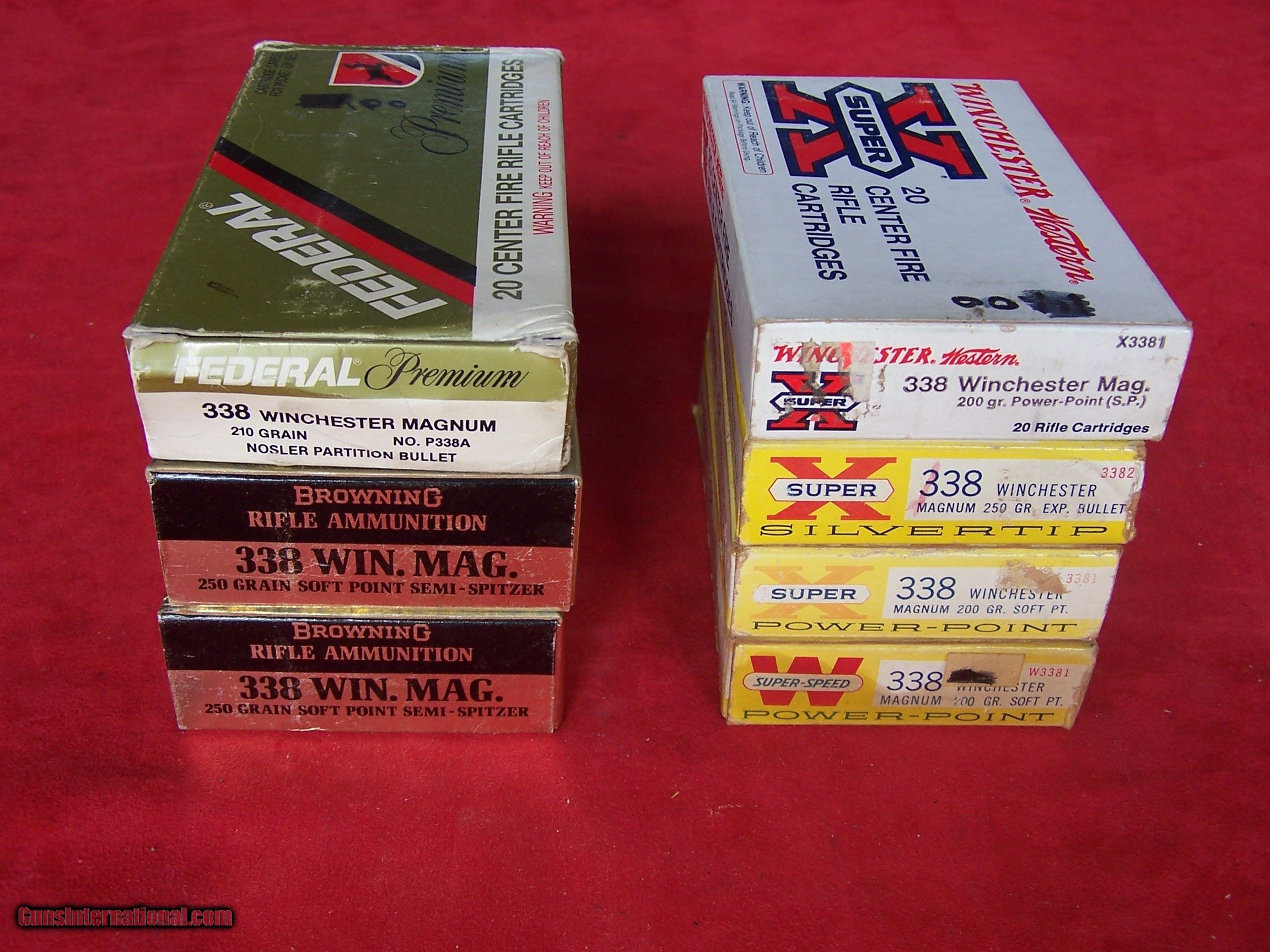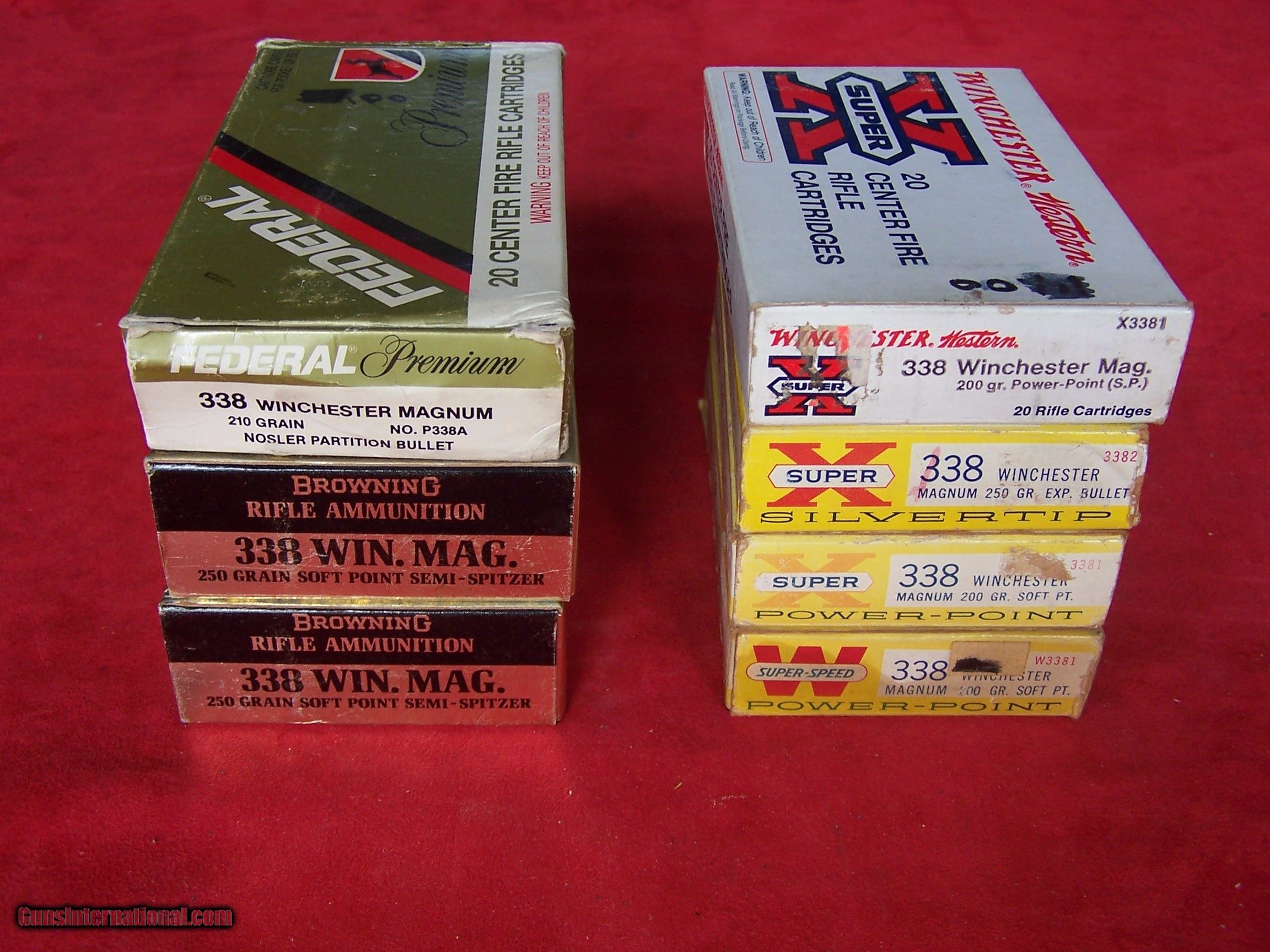 Description: Selling seven boxes of .338 Winchester ammo. Consisting of two boxes of Browning 250 GR., one box of Federal 210 GR. Nosler, three boxes of Winchester 200 GR. Soft Point & one box of Winchester 250 GR. Express Bullet. All are full except one of the Winchester 200 GR. is missing five rounds. There are a total of 135 rounds. One price for all seven boxes. These will be packaged properly and shipped via USPS for $20.00. Please see my other collector ammo and guns that I have listed. Please feel to contact me if you have any questions and thanks for viewing. Note: Sold Pending Funds SOLD |