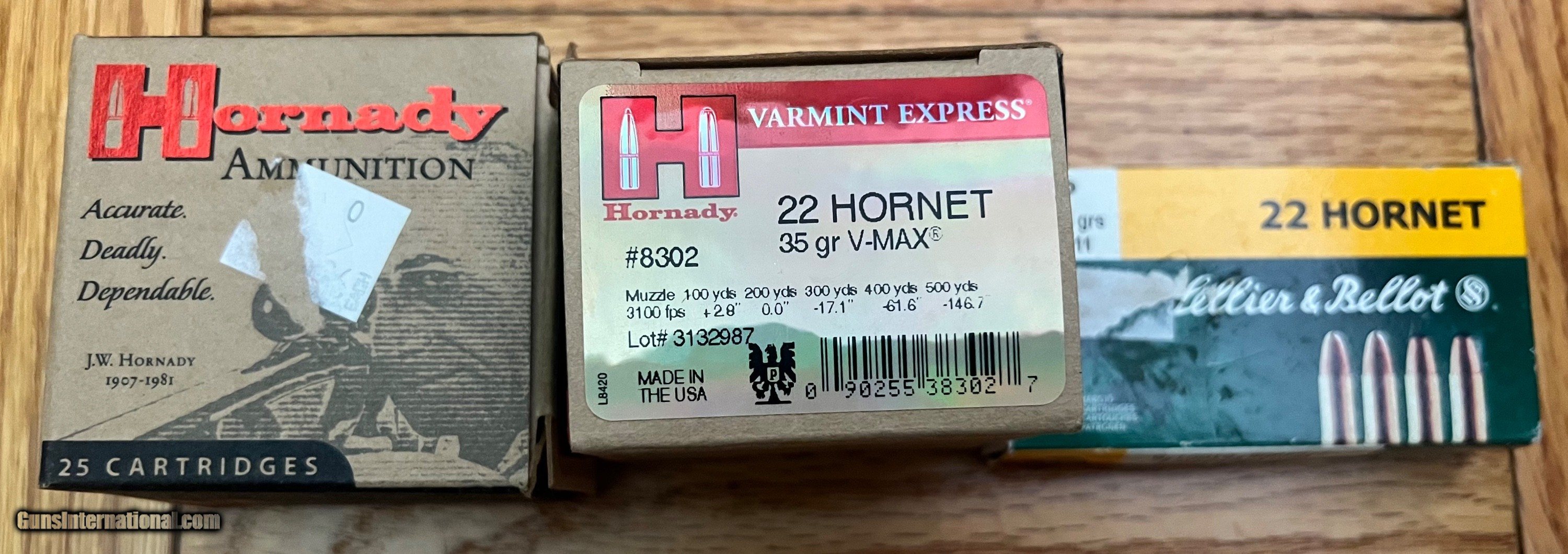 Description: Seventy rounds 22 hornet ammunition 50 rounds of HORNADY 35gr v max 20 rounds S&B 45gr SP Shipping included in price SOLD Rifle Caliber: .22 Hornet |