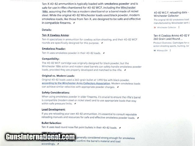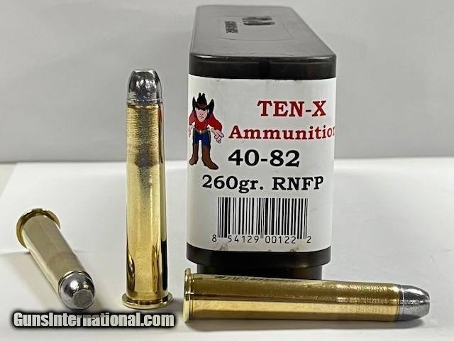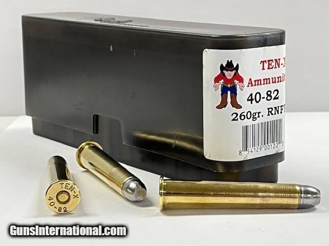 Description: TEN-X 40-82 Winchester 260 Grain RNFP 20 Rounds Factory Loaded in Excellent Condition. Nice Clean and Dependable Factory Loaded Ammunition. Ups ground shipping $19.95 Credit card payments add 3% SOLD Rifle Caliber: .40-82 Winchester |