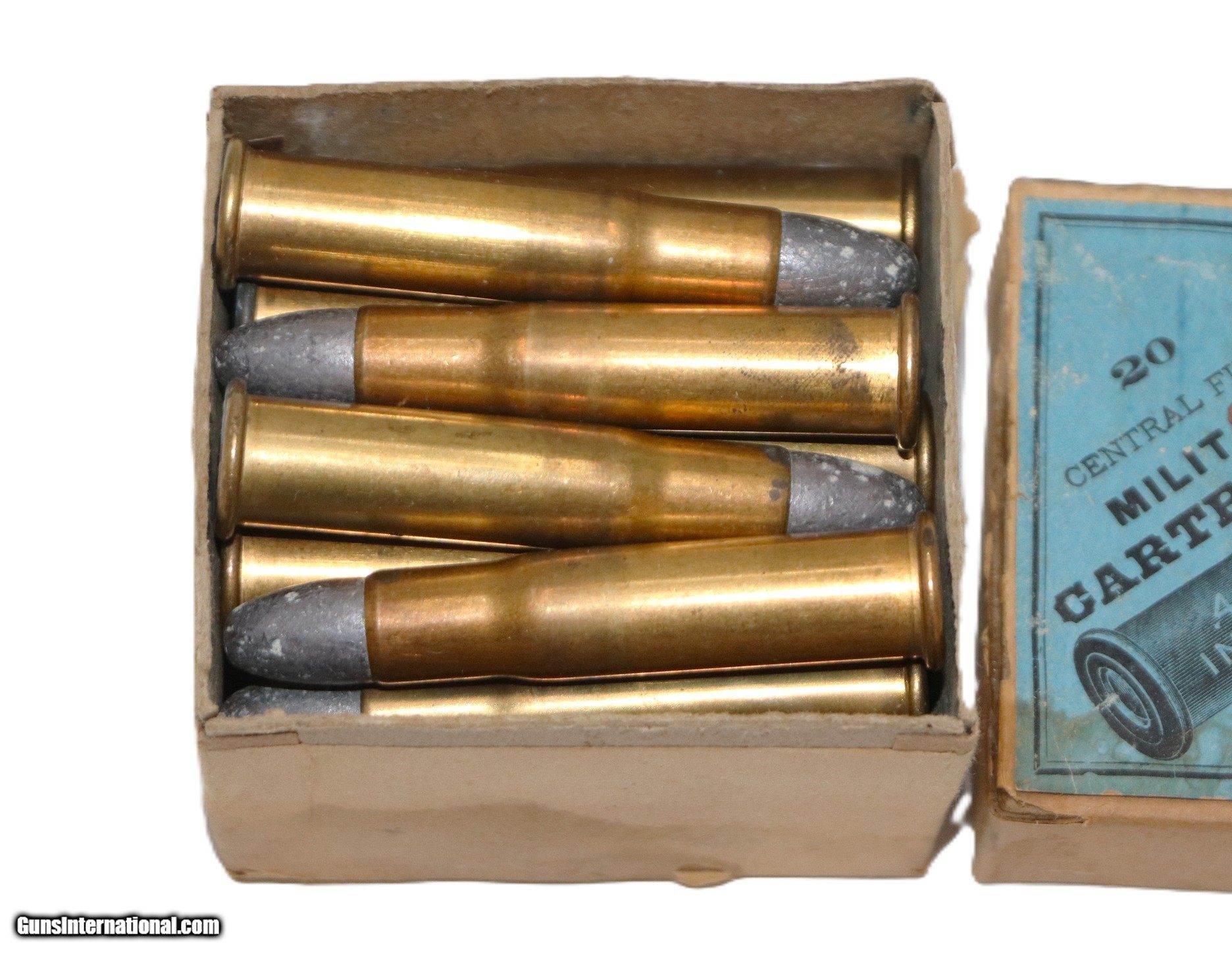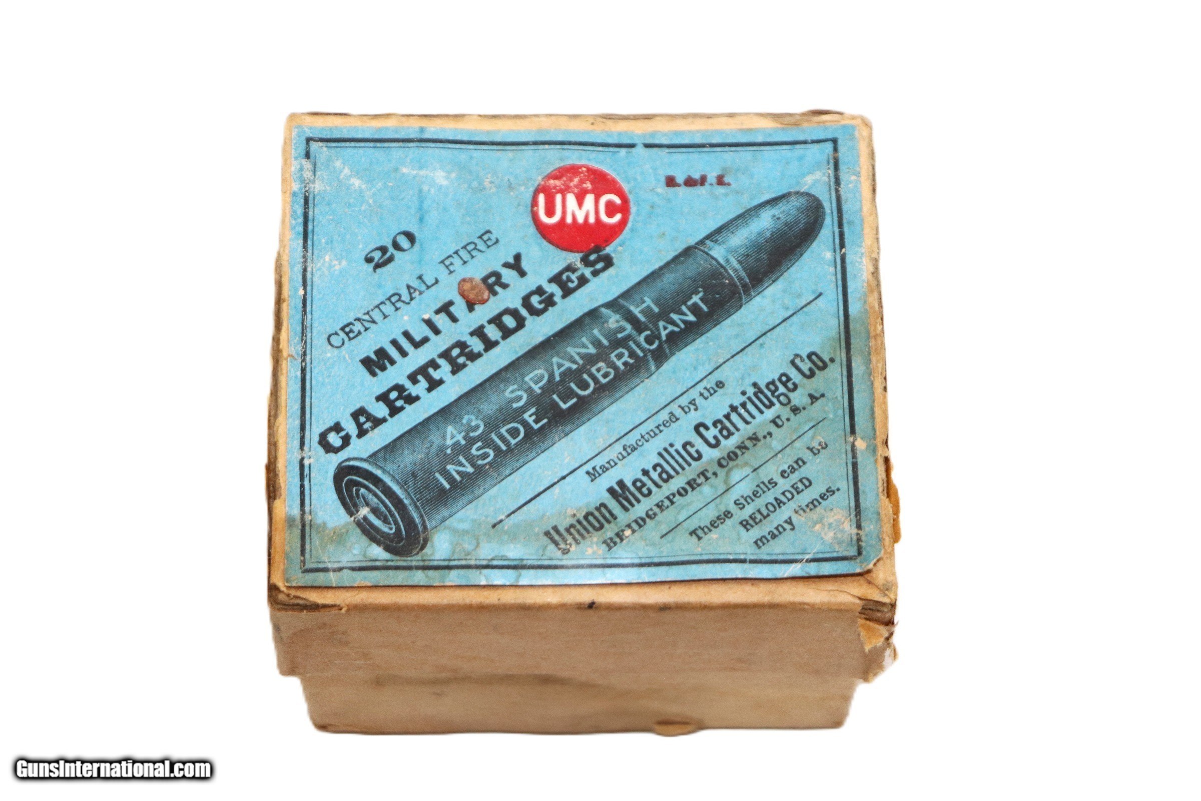 Description: UMC, Central Fire, .43 Spanish, Partial Box of 19 Rounds. Ammo is excellent, Box is VG with a seam repair and staining of label. Rifle Caliber: .43 Spanish Price: $150.00 Shipping: $15.00 Contact Seller |