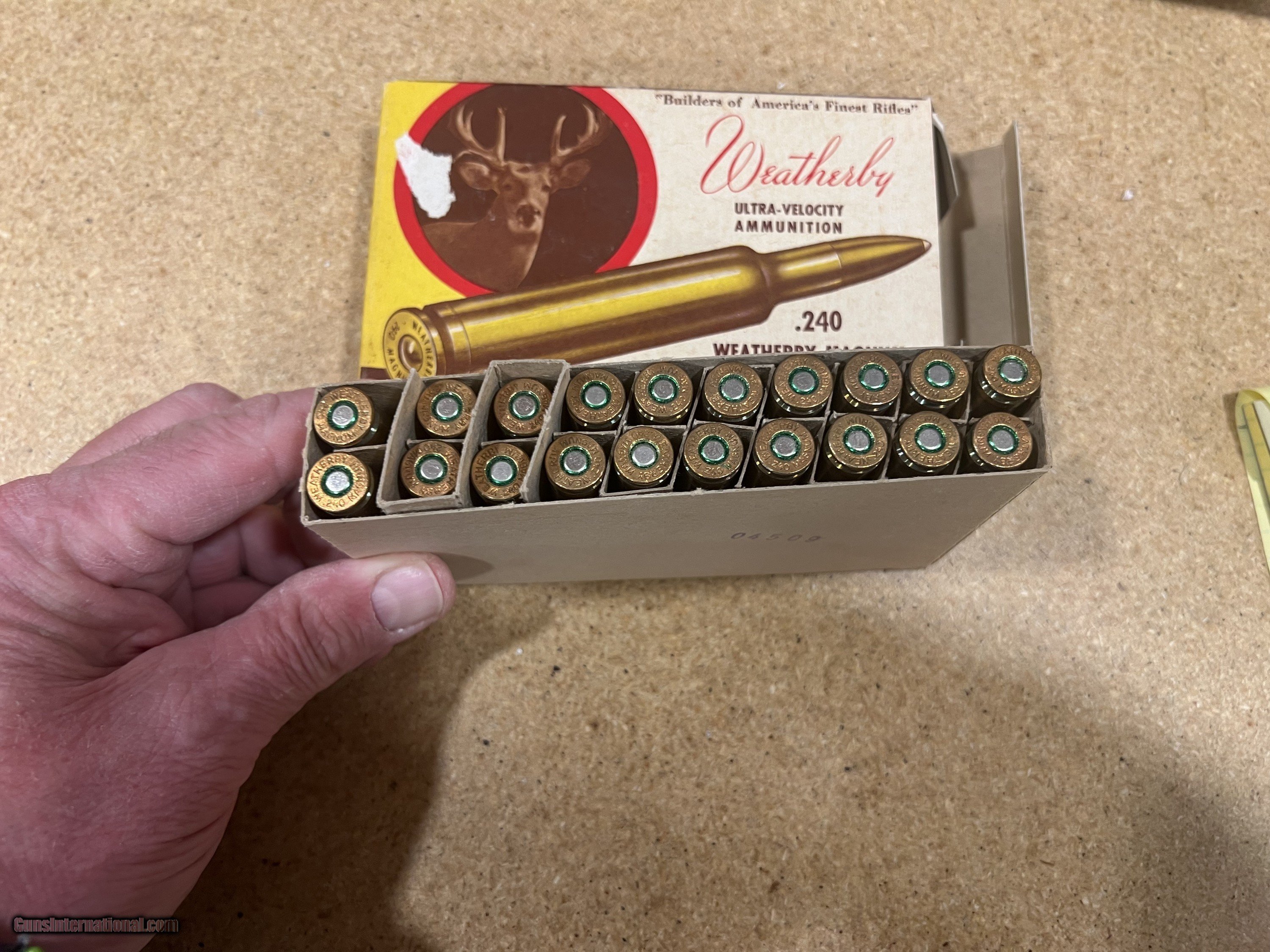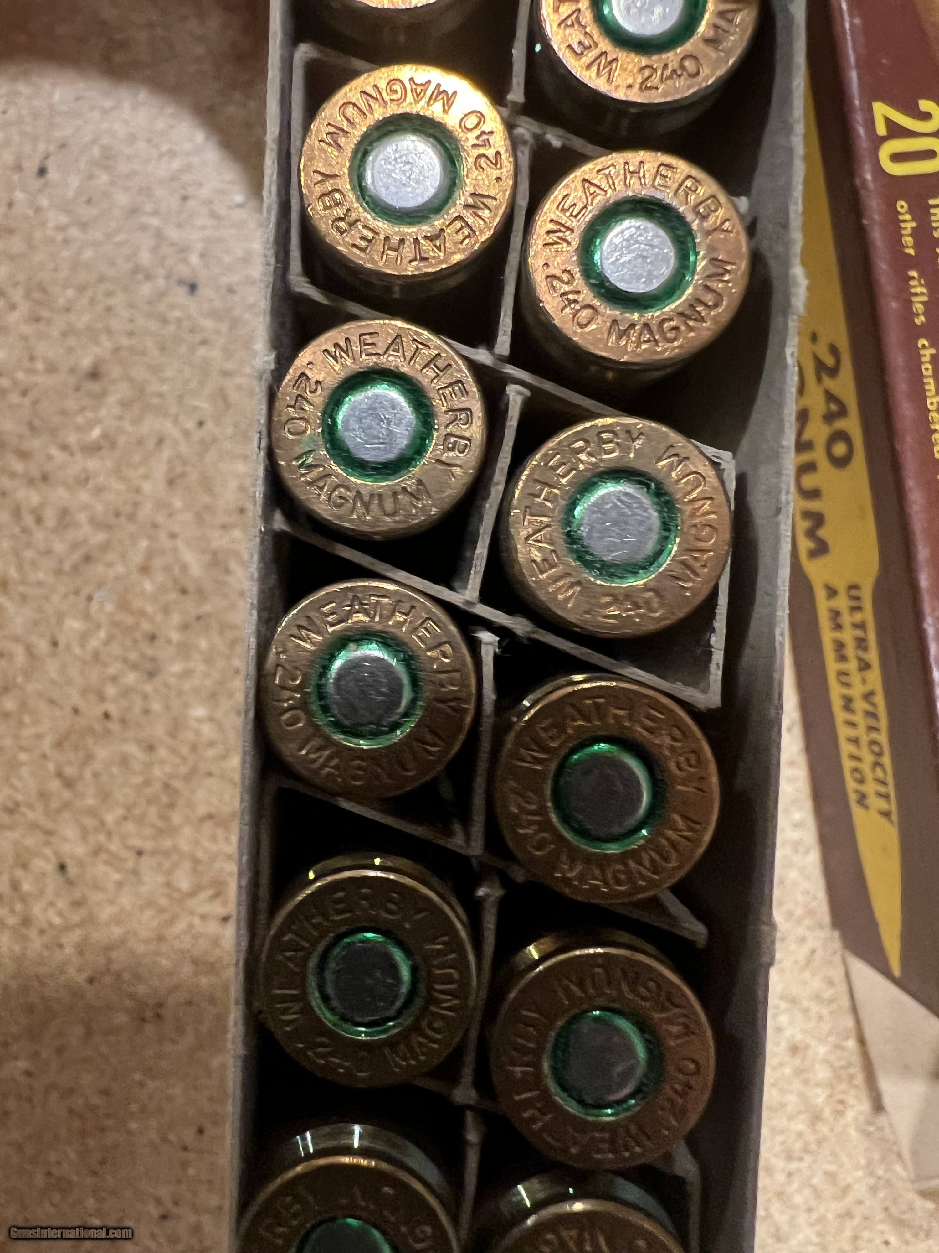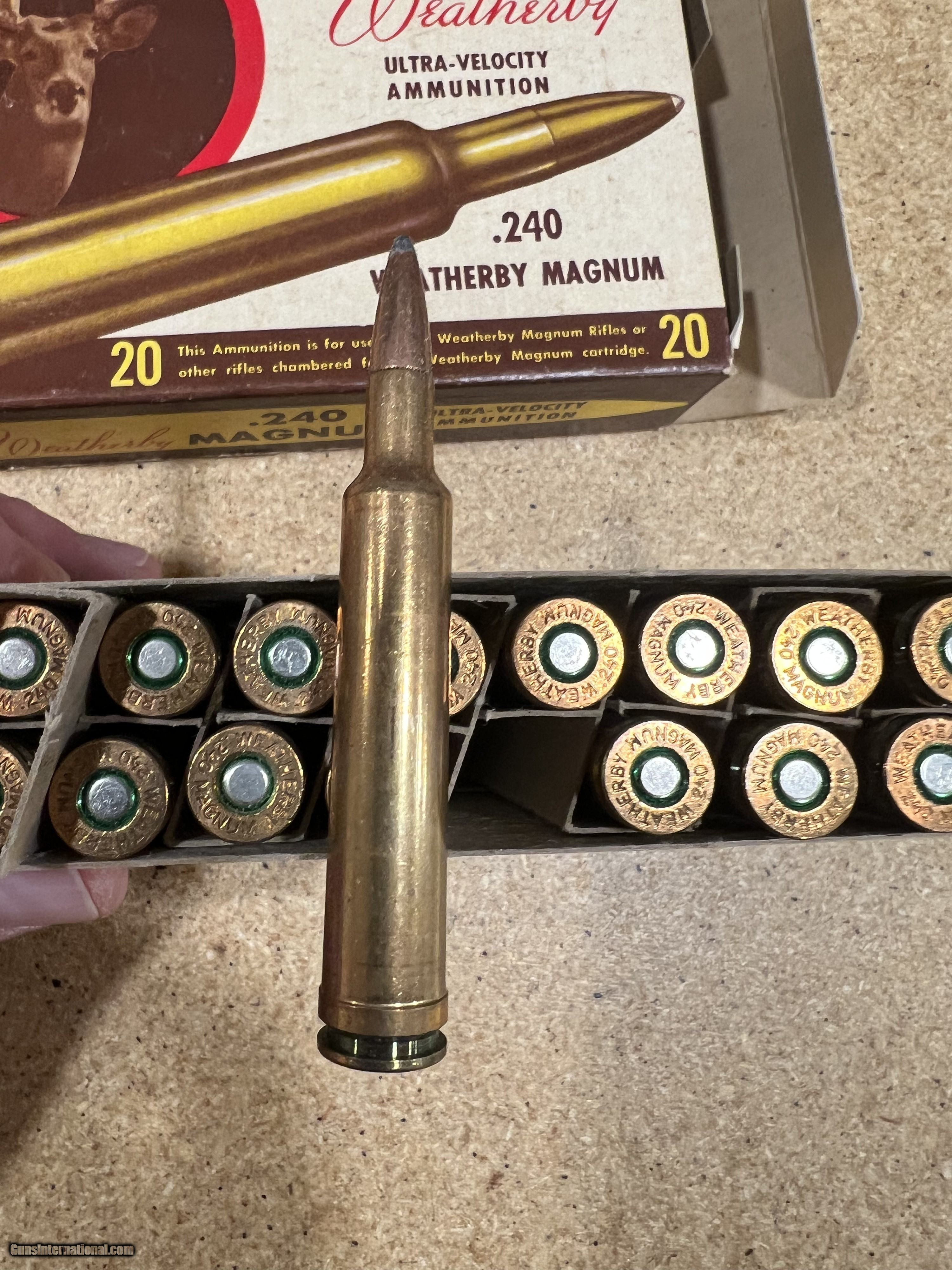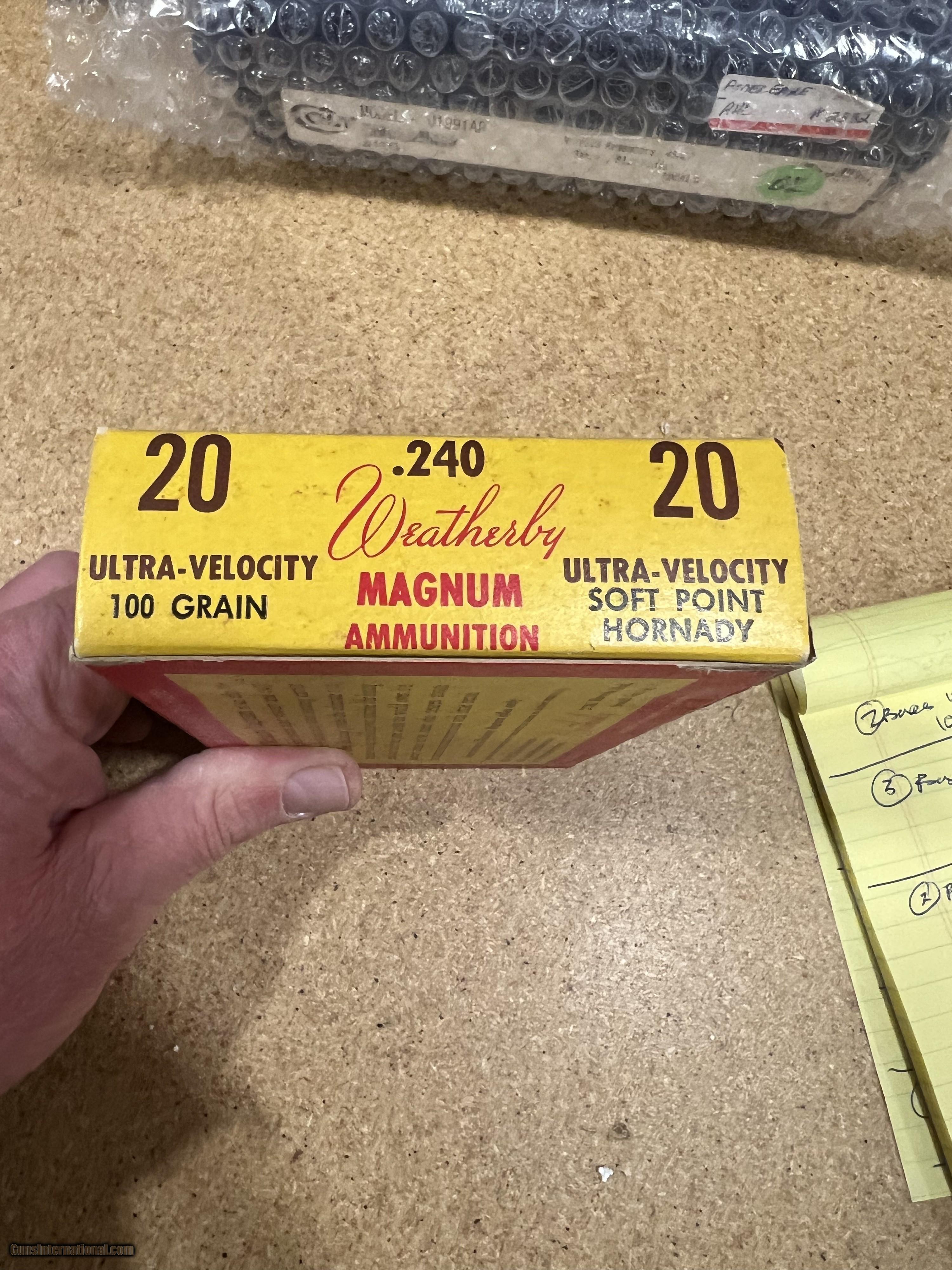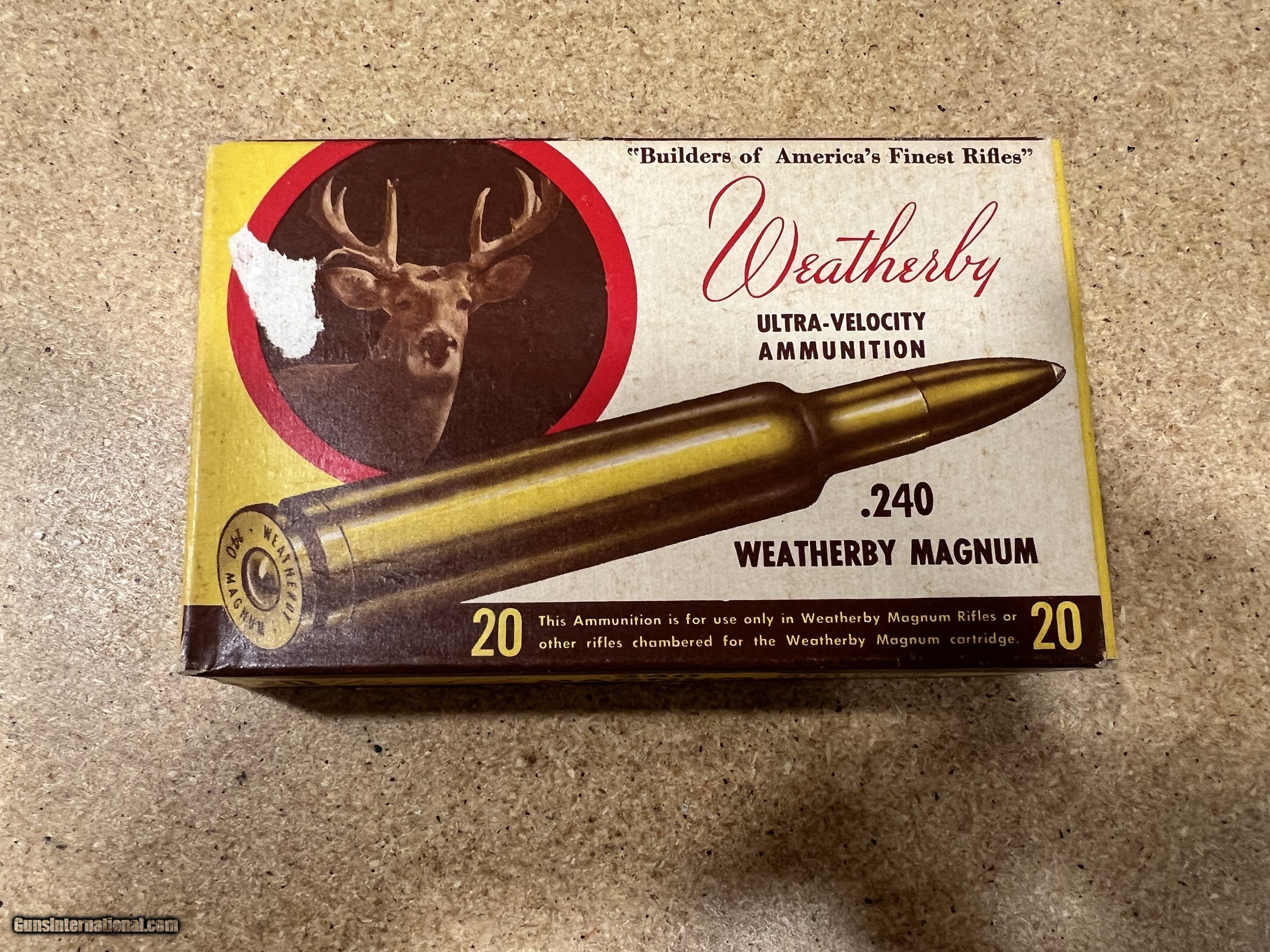 Here's 1 factory full box of Weatherby 240 Wby Mag 100 grain soft point ammo in the deer picture box with light damage as pictured 35.00 UPS shipping 2.99% credit card fee PA residents add 6% sales tax.