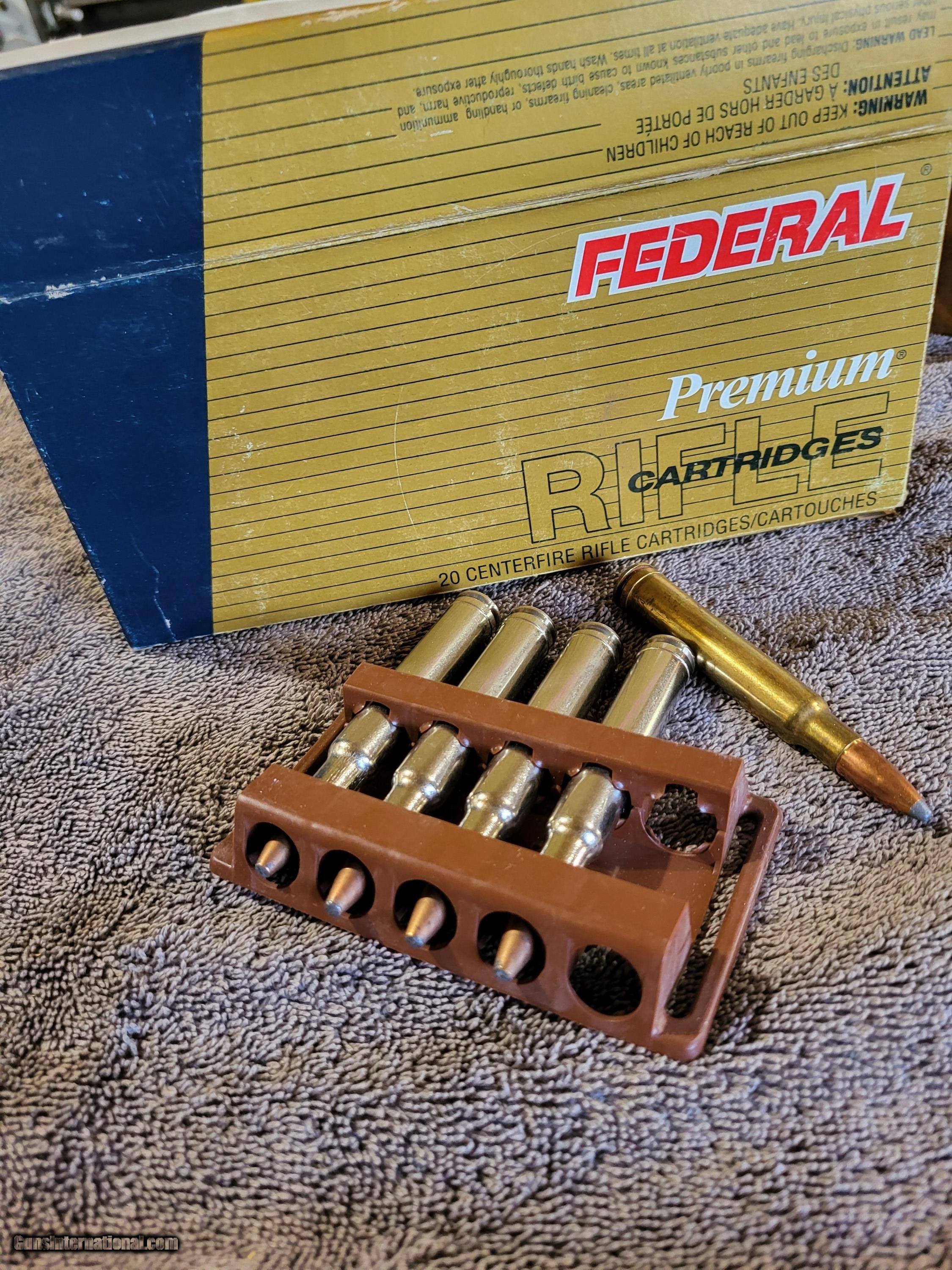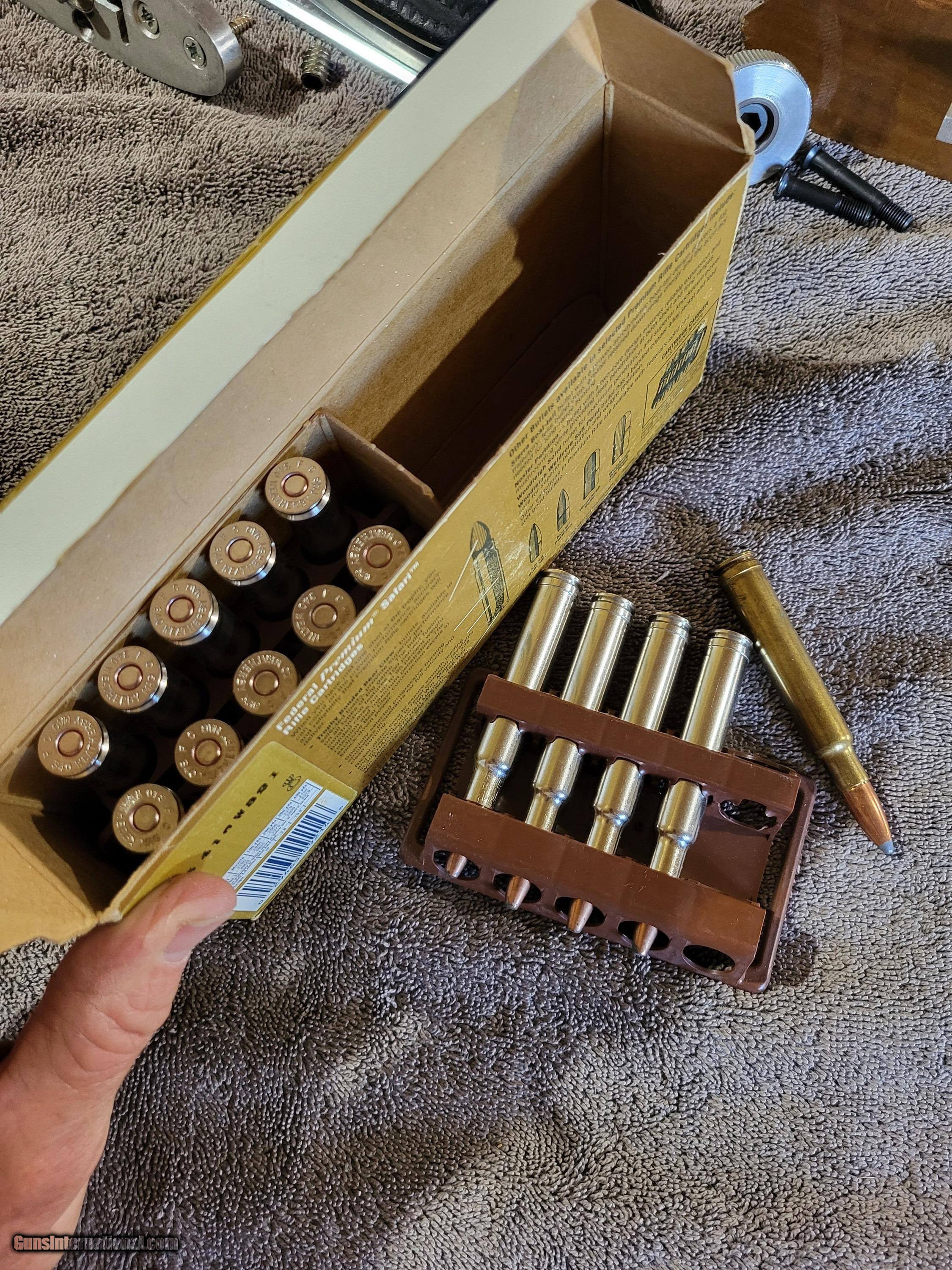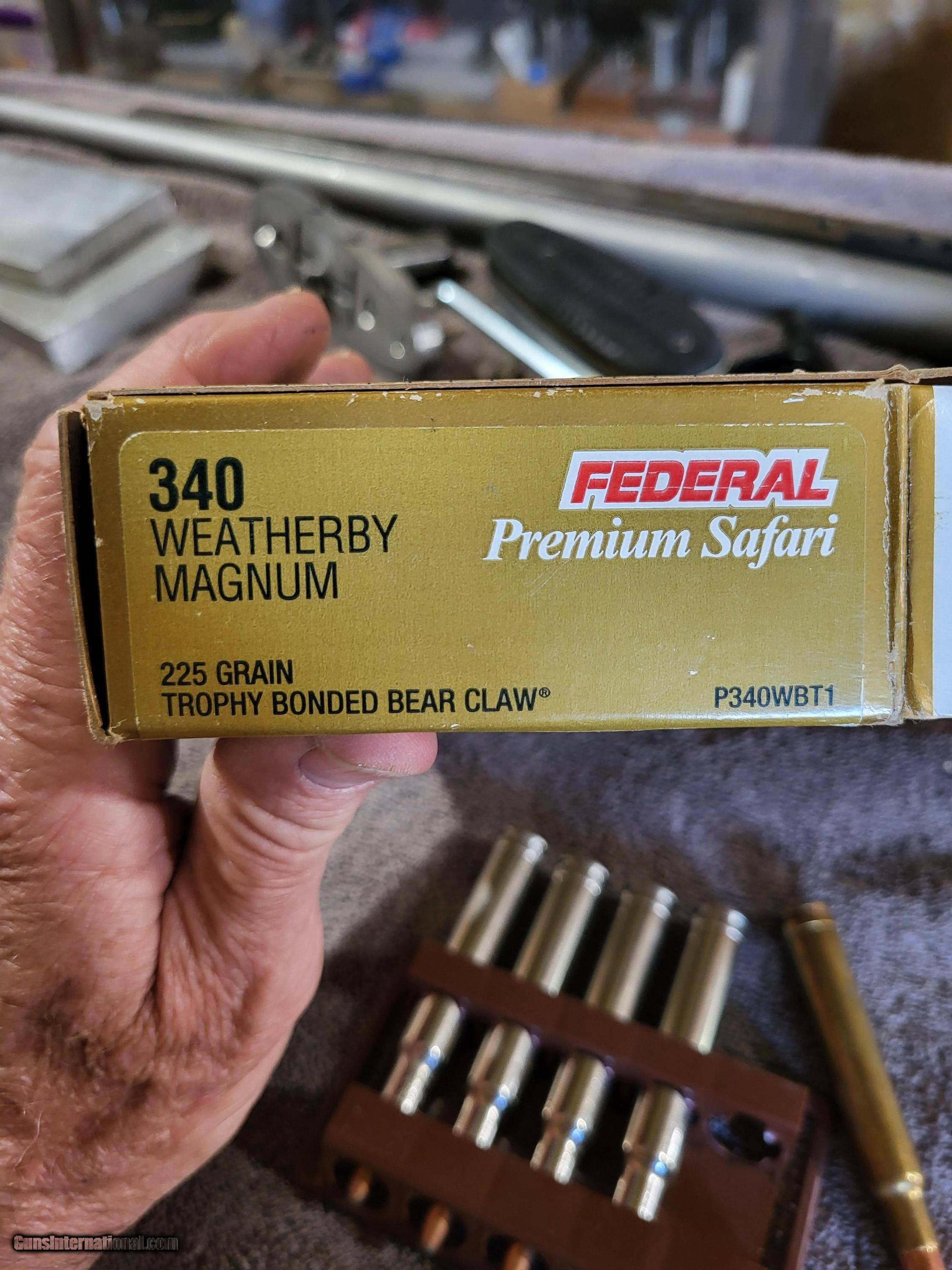 Description: 14, new In the box , Federal Premium Safari nickel plated factory cartridges. 225 gr. Trophy Bonded Bearclaw bullets. One brass caseed Weatherby 340 magnum cartridge loaded with what appears to be a 250 grain pointed soft point bullet. Free shipping. SOLD Rifle Caliber: .340 Weatherby Magnum |