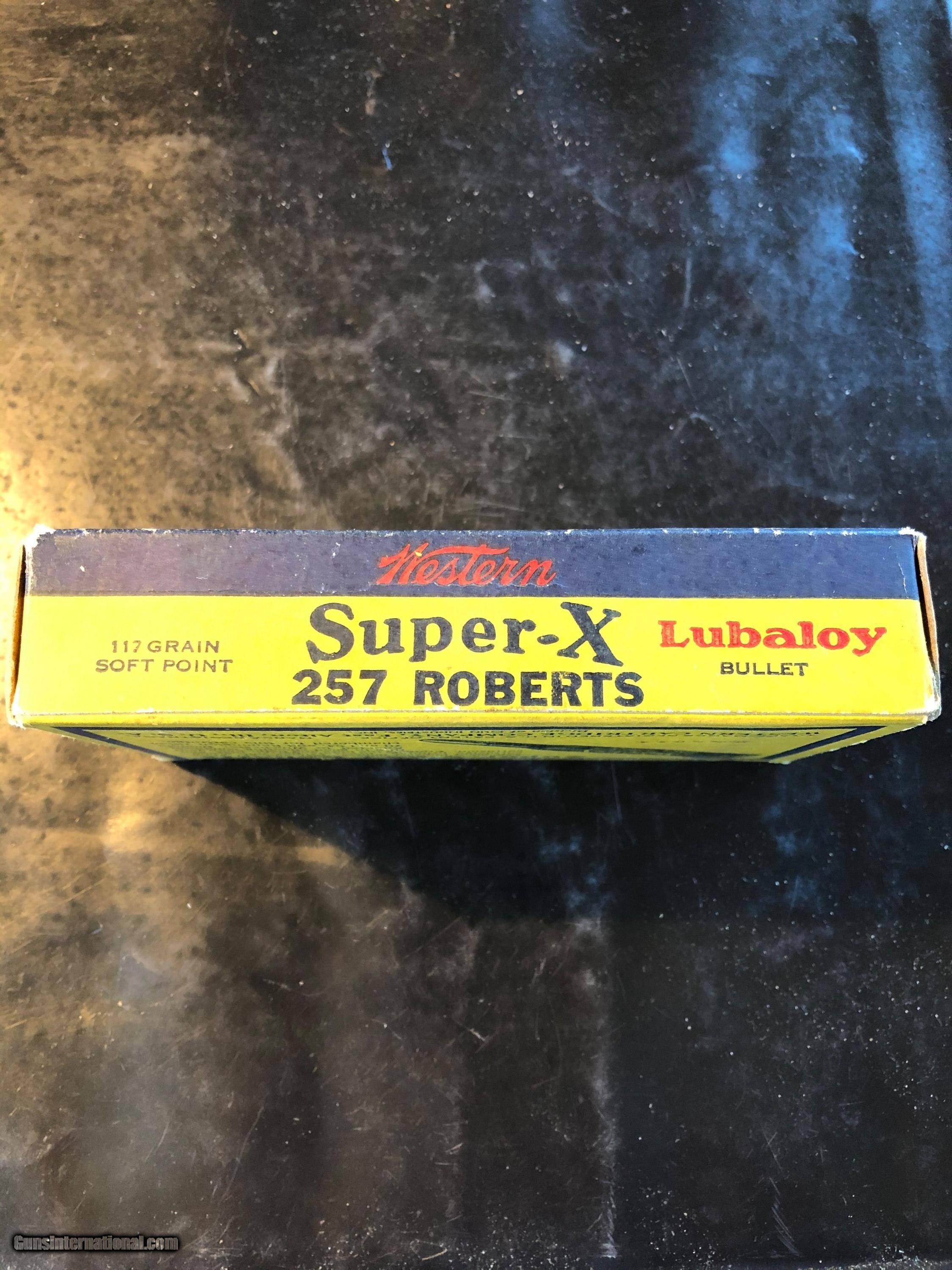 Description: SALE PENDING. Full box of twenty Western Super X .257 Roberts 117 grain soft points. Blue and yellow box is worn but intact. Has "3.00" and "3.45" written in pencil (those were the days). Shipping $10. SOLD |