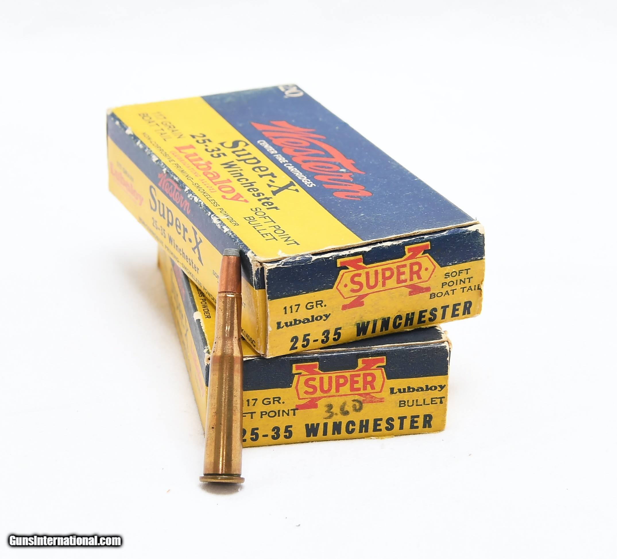 Description: SOLD Older, full boxes of Western Super X .25-35 117 gr. soft points, blue/gold boxes Priced at $75.00 per individual box Lot of two (2) boxes for $140.00 SOLD |
