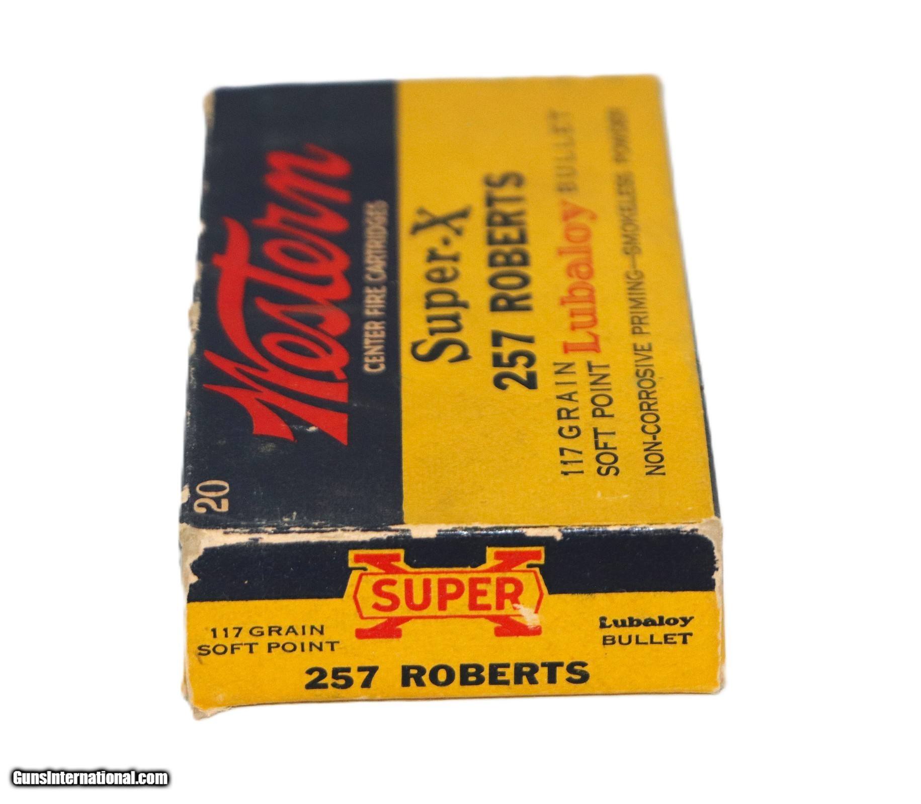 Description: Western, Super-X, .257 Roberts, 117 Grain Lubaloy Soft Point Bullet, Full with 20 Correct Rounds, 1pc. box is solid with minor age soiling, light edge & corner wear, end flaps are solid, ammo is excellent+. Price: $75.00 Shipping: $13.50 Contact Seller |
