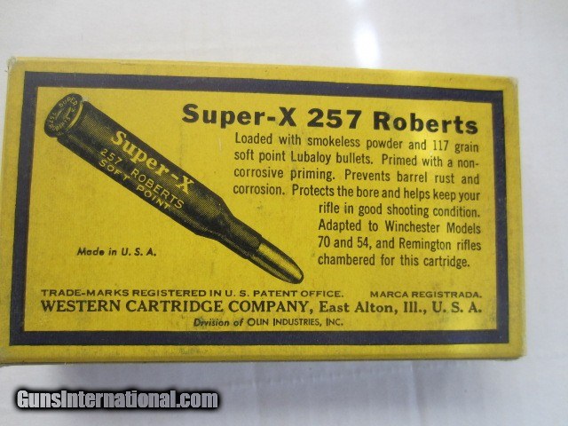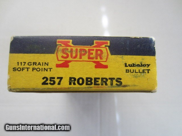 Description: WESTERN SUPER X 257 ROBERTS 117 GRAIN SOFT POINT FULL BOX OF 20 VINTAGE TO TIME FRAME SHIPPING COST $15.00 NEED MORE INFORMATION ALWAYS BEST TO CALL OUR OFFICE 716-941-3946 SOLD |