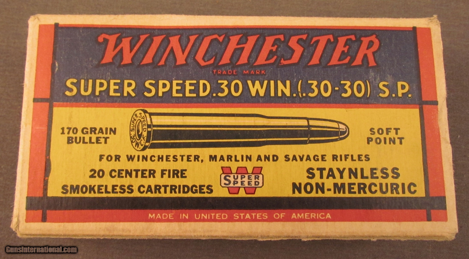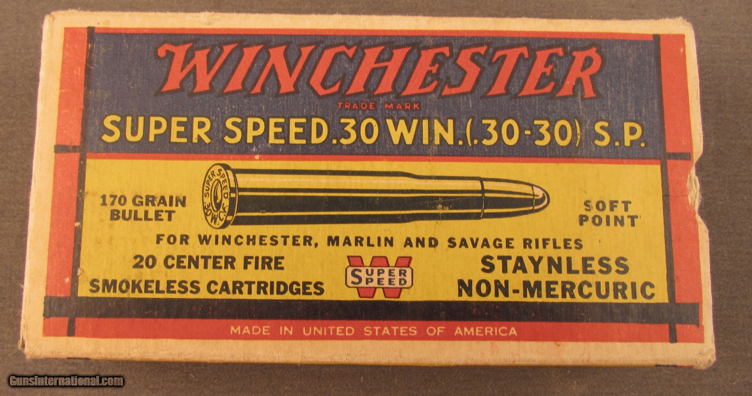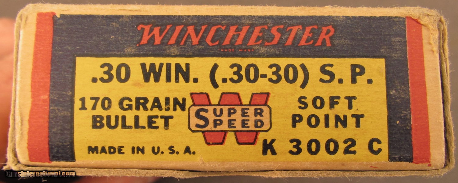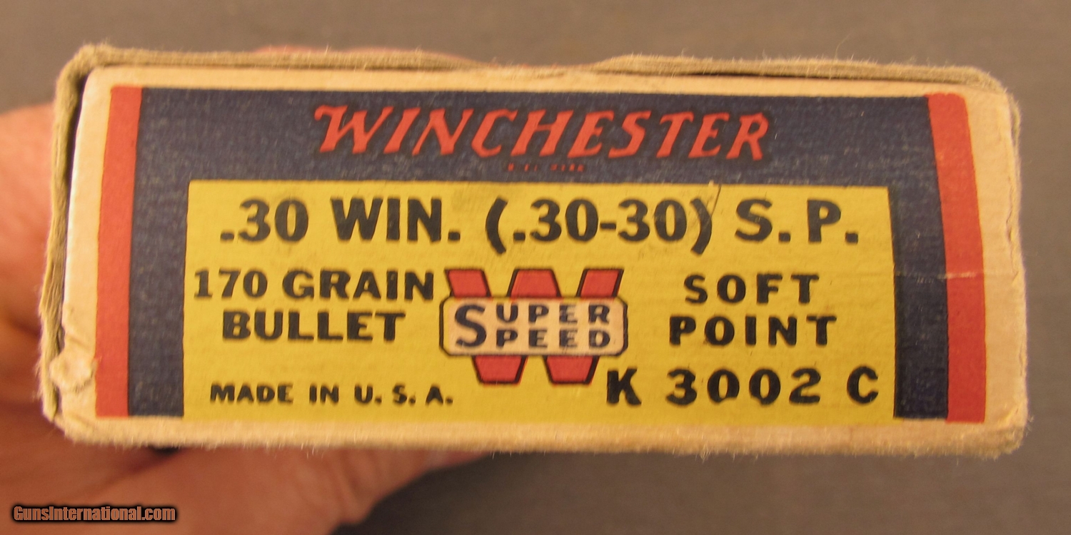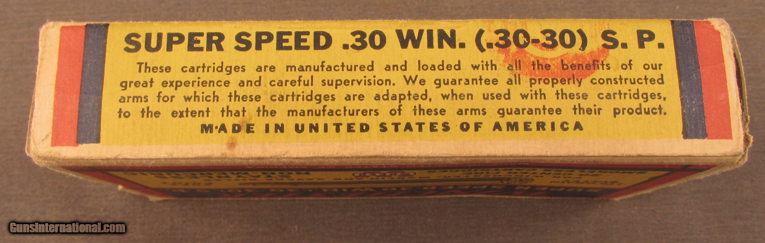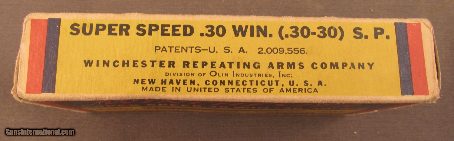 Description: This super speed one piece box is full and it remains in excellent condition with light soiling on bright colors. Ammo has super speed headstamps and is bright and clean. This box is discussed on page 180 of Giles and Shuey's Winchester Cartridge Boxes book. Box is not shown because they did not have one. It features a Post War "Division of Olin Industries Inl" line on top side. This box was only used for a short time and is quite scarce. SOLD Manufacturer: Winchester Model: Ammo Caliber Info: 30-30 Gauge Info: 30-30 |