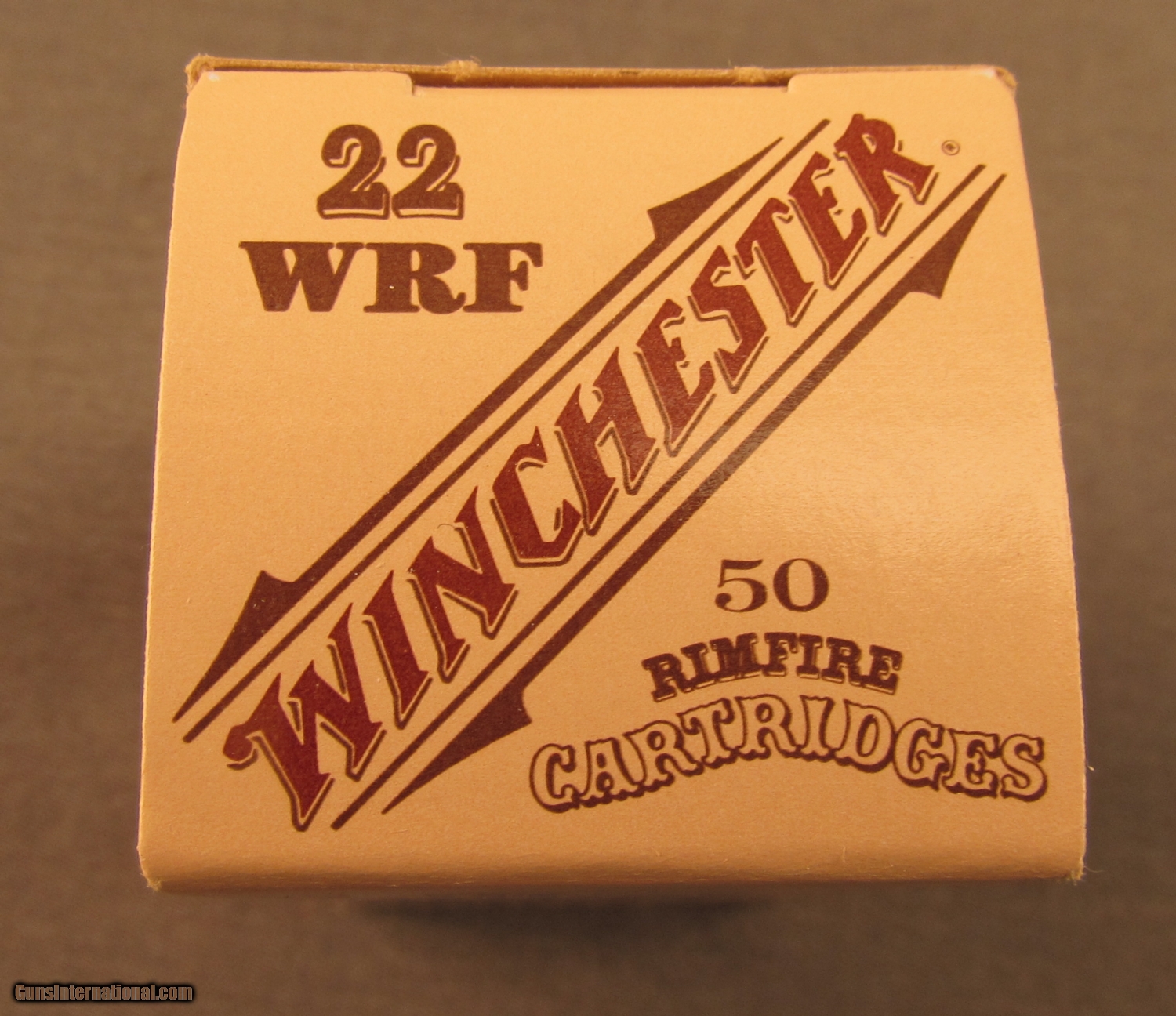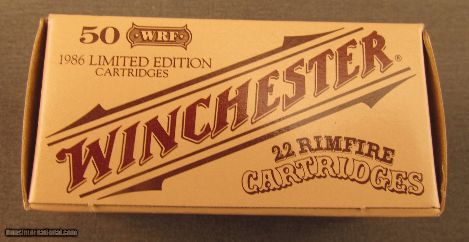 Description: This full 50 round 1986 limited edition box has great graphics and is filled with 45 grain copper plated bullets in brass cases with "W WRF" headstamps. This is listed in Dunn upgrades as WRA-90-WRF-1. SOLD Manufacturer: Winchester Model: Ammo Caliber Info: .22WRF Gauge Info: .22WRF |