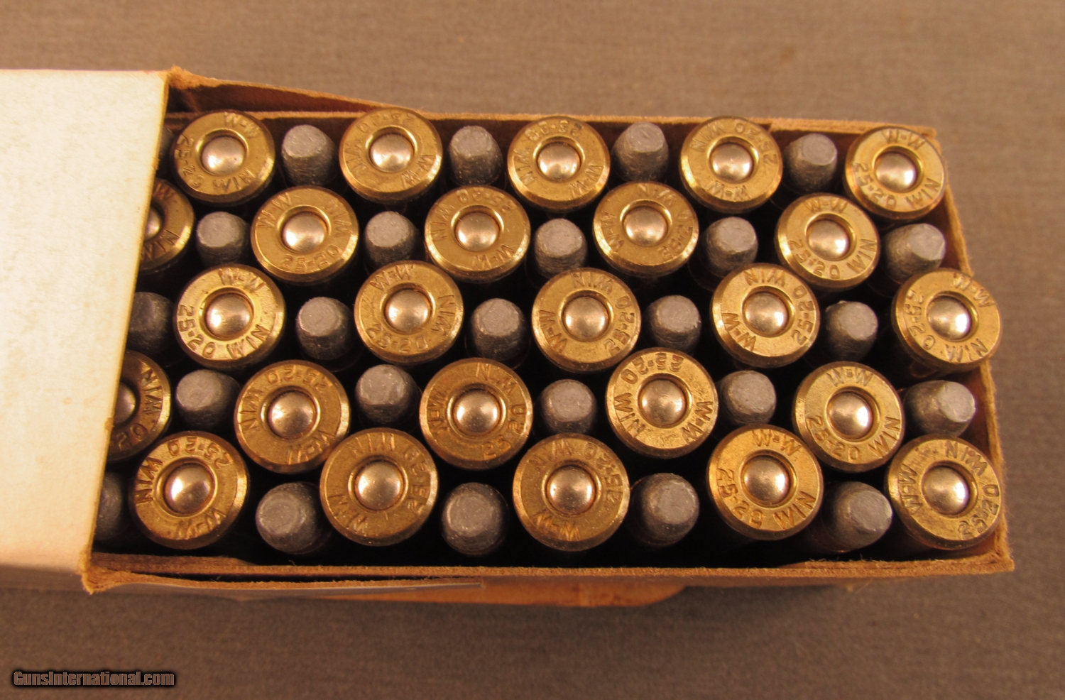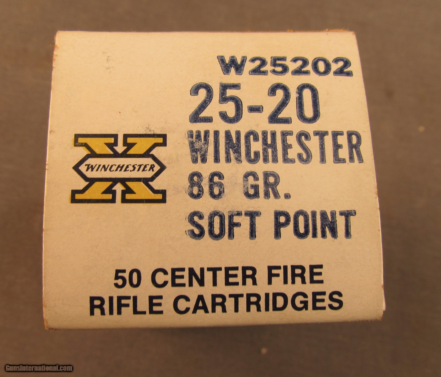 Description: This full 50 round box was used around 1980 and it remains in excellent condition with very light soiling and very little shelf wear. The ammo is loaded with 86 grain soft point bullets and remains bright and clean. SOLD Manufacturer: Winchester Model: Ammo Caliber Info: .25-20 Gauge Info: .25-20 |