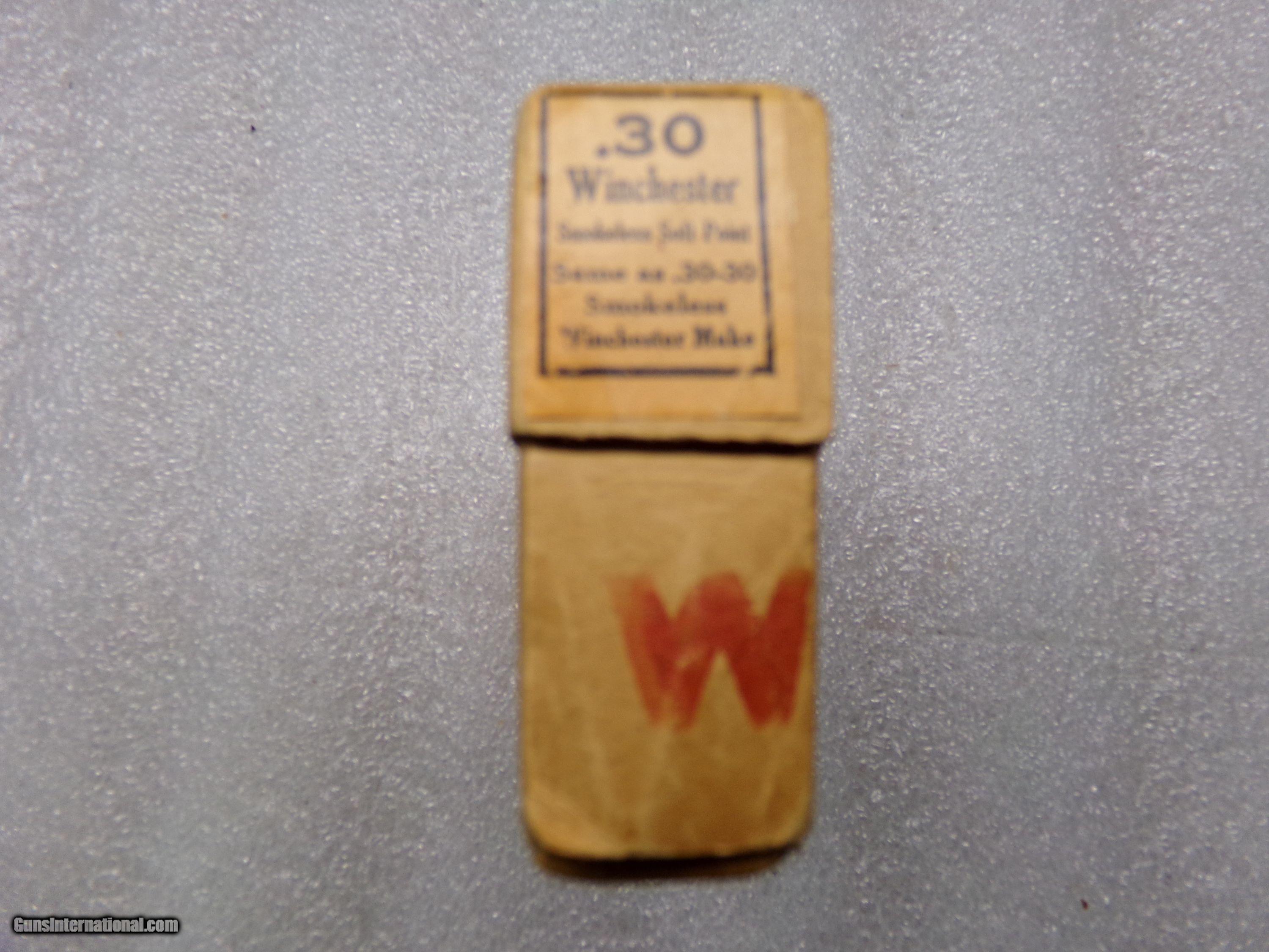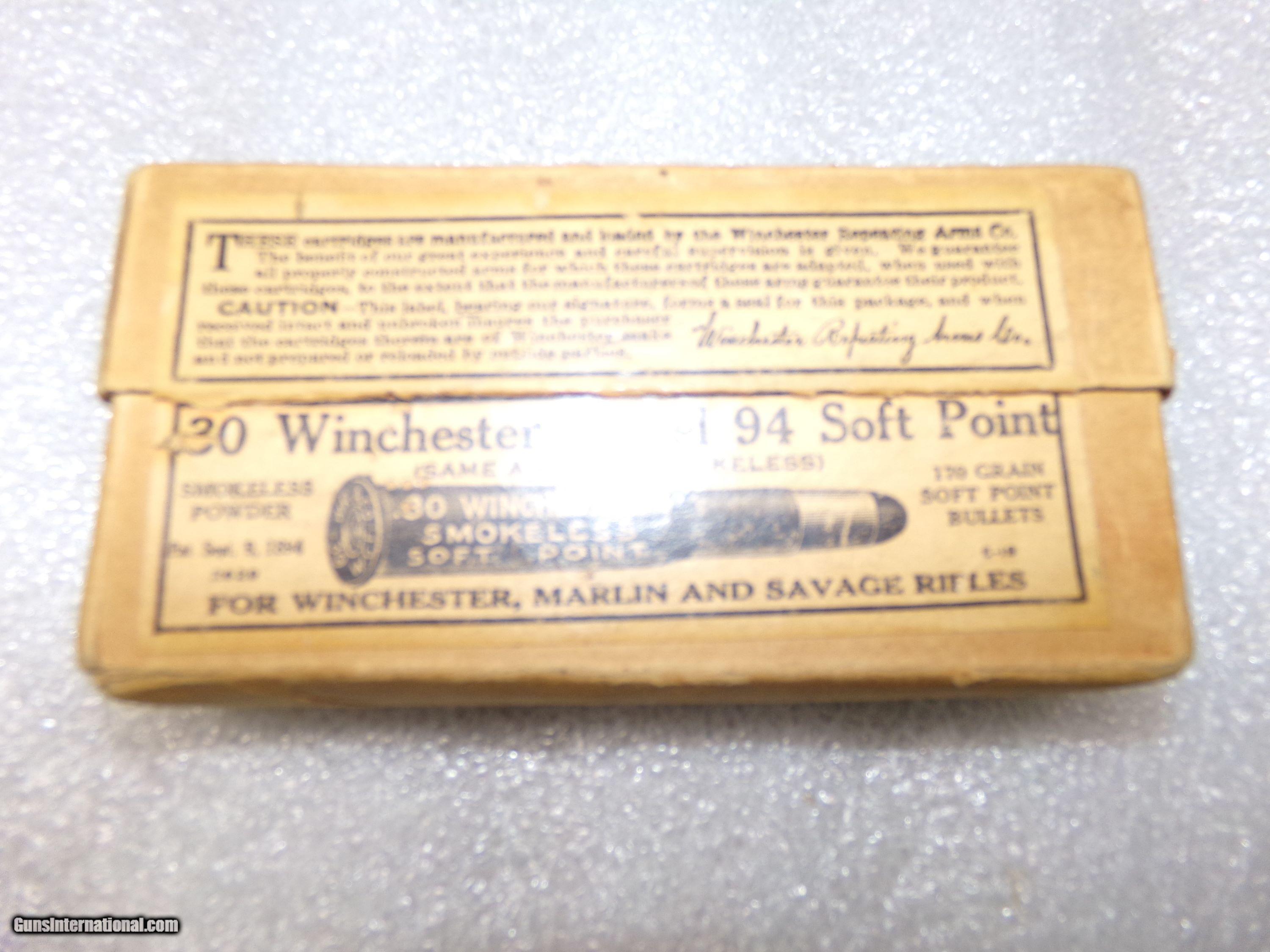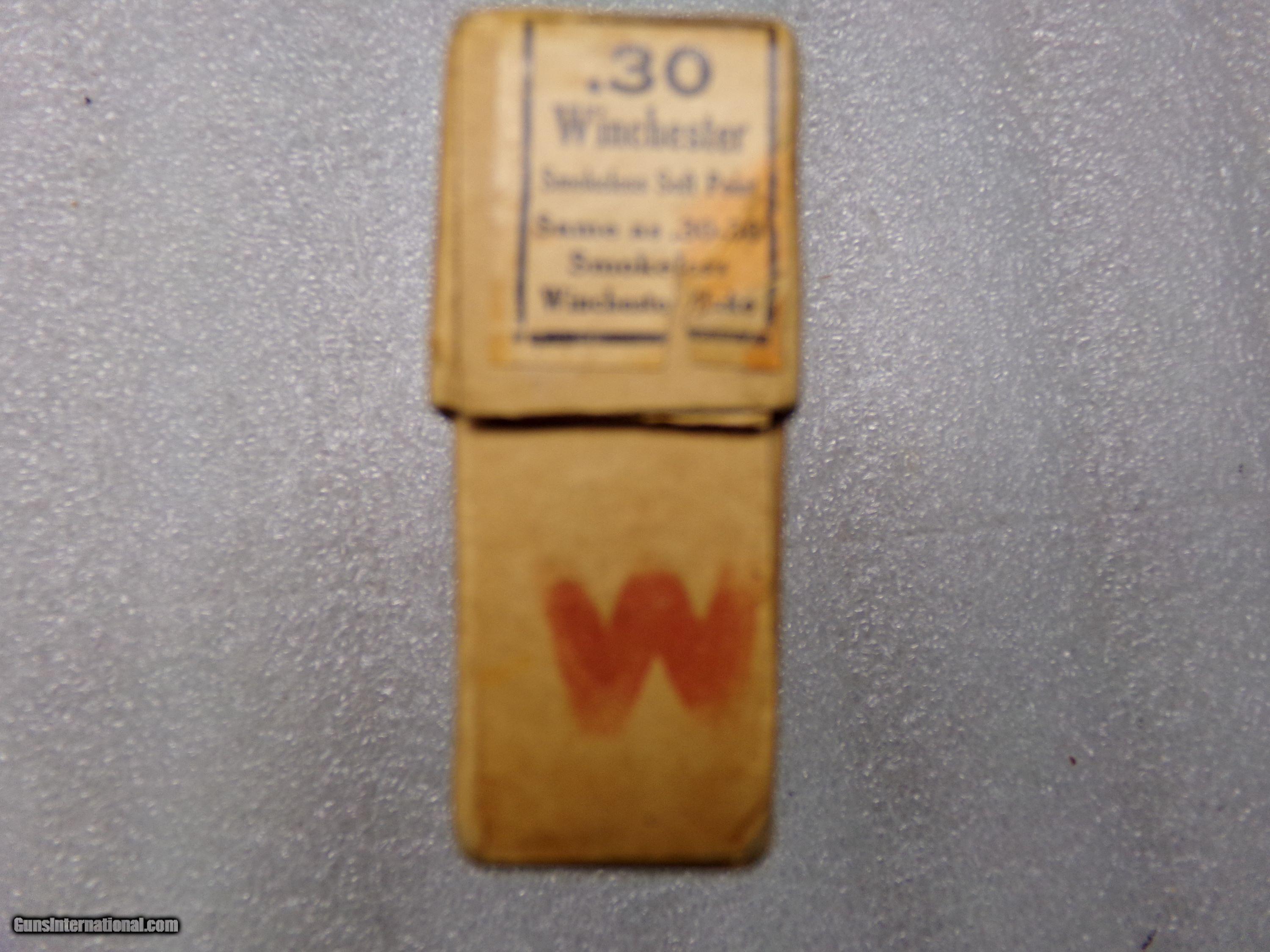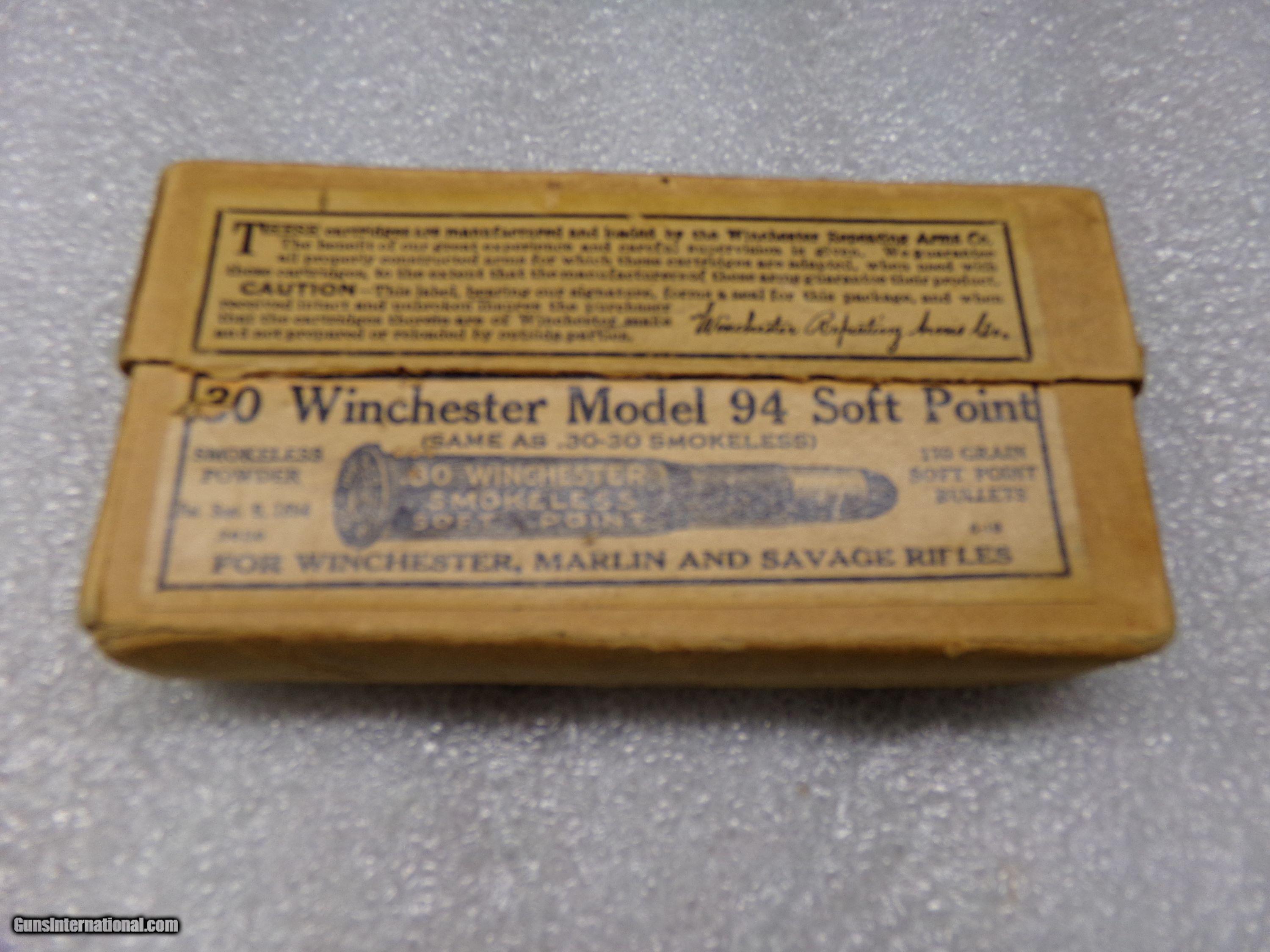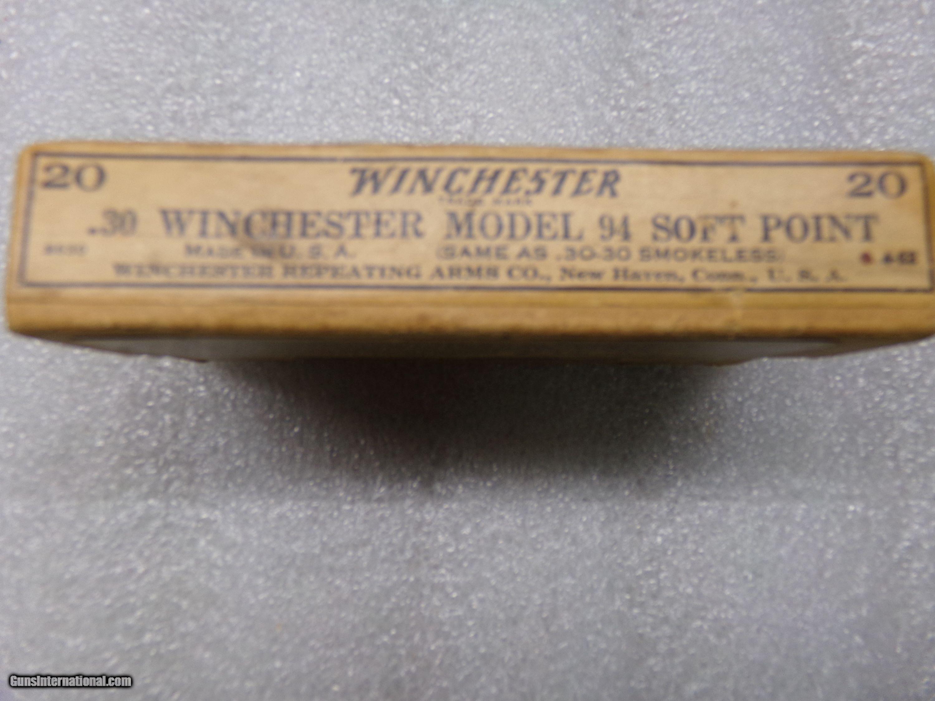 Description: Winchester FULL and ORIGINAL box of .30 WIN 94. 6-19 box. headstamp 'WRA CO 30 WCF" Free shipping. No Calif, Sales Thanks. SOLD |