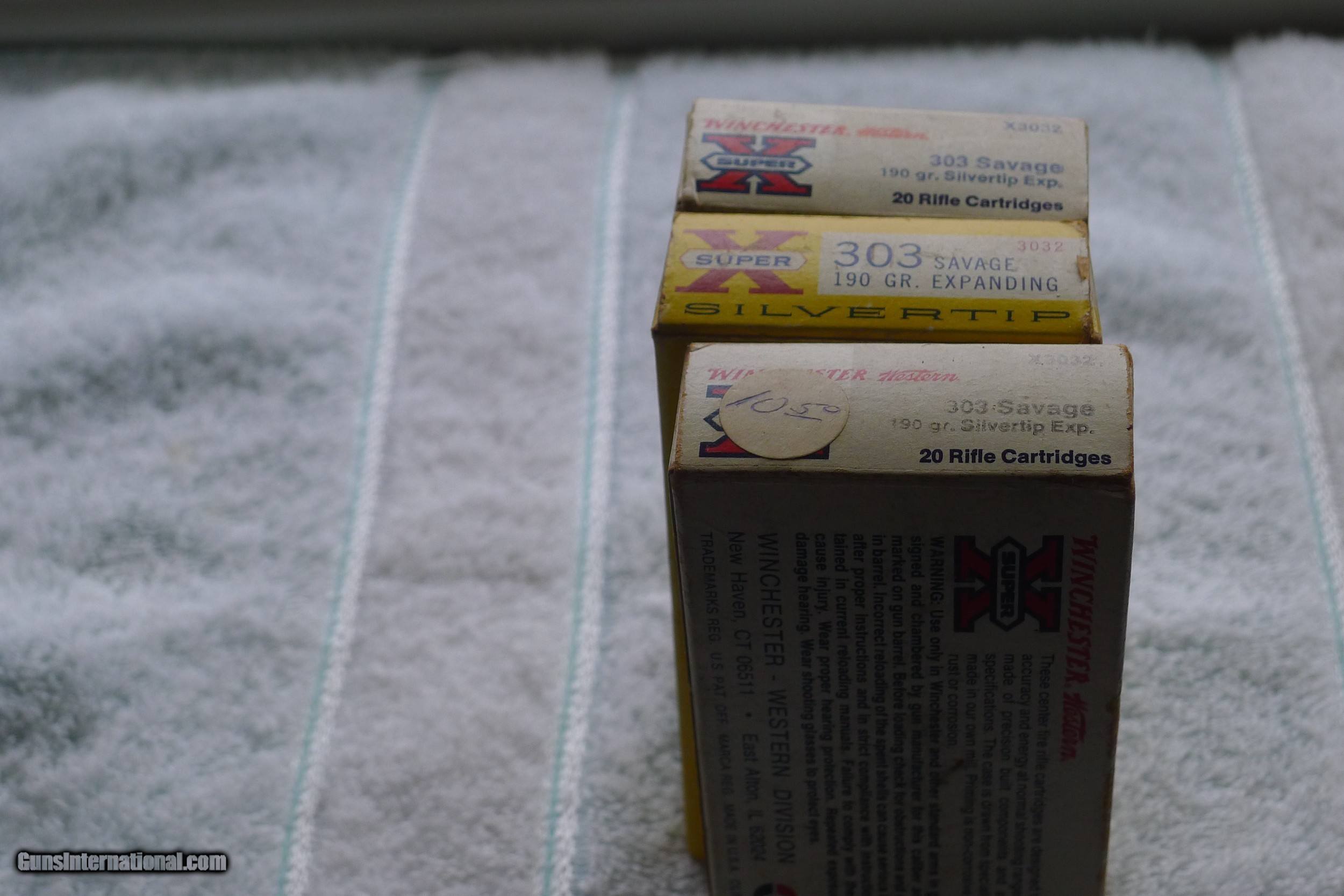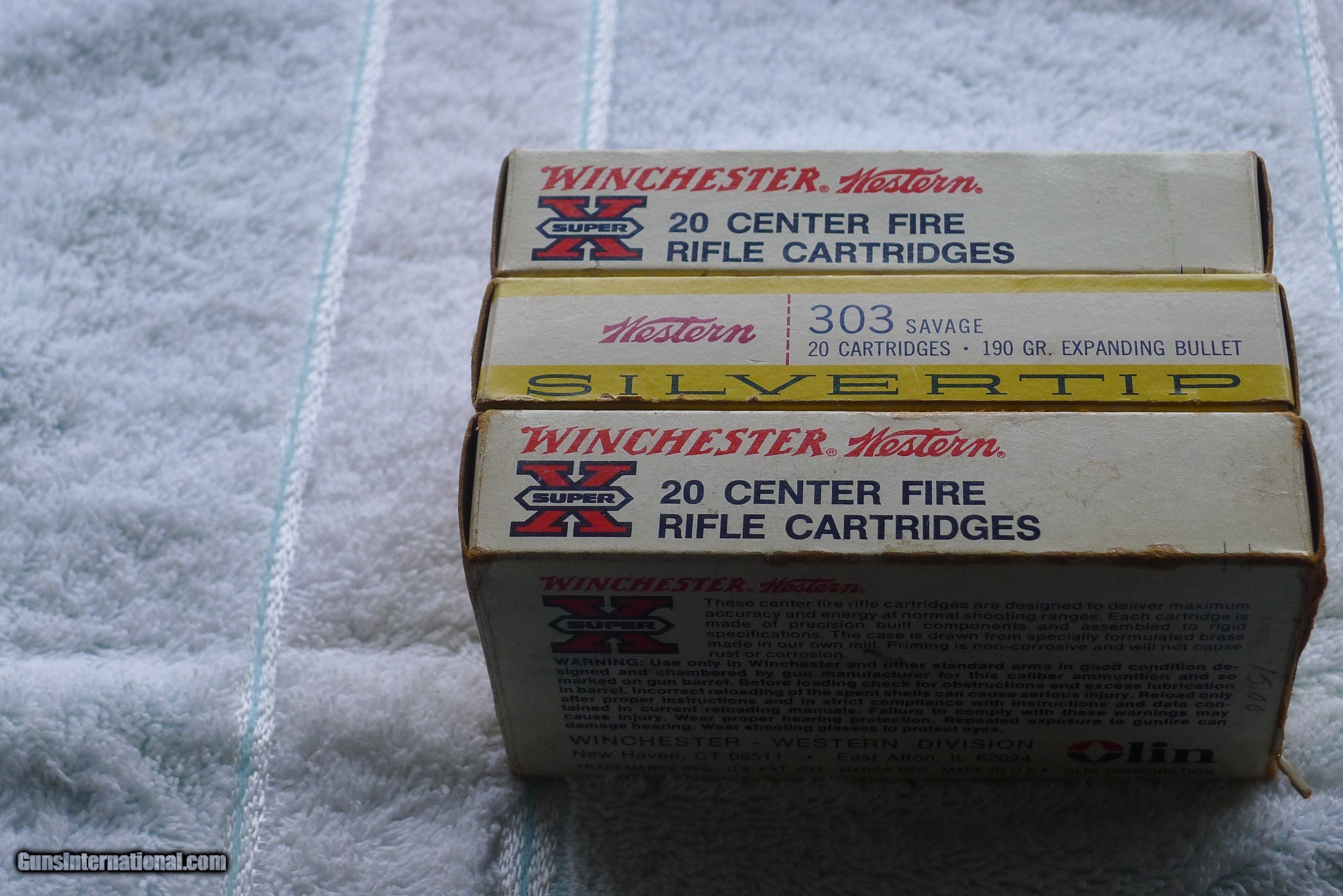 Description: SOLD DAVE THREE BOXES ( 2 FULL AND 14) IN THE THIRD BOX of 190 grain WINCHESTER 303 SAVAGE SILVERTIP AMMO. See photos. buyer pays shipping UPS GROUND SET UP FOR SHIPPING LOADED AMMO $30.00. NO INTERNATIONAL SALES QUESTIONS USE EMAIL. SOLD Rifle Caliber: .303 Savage |