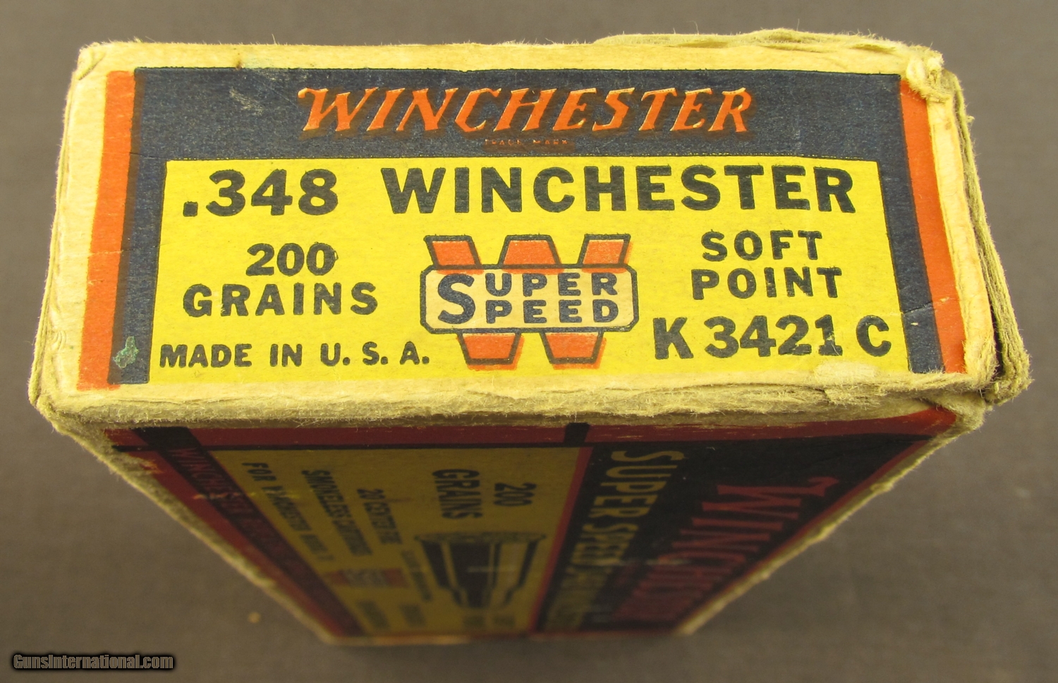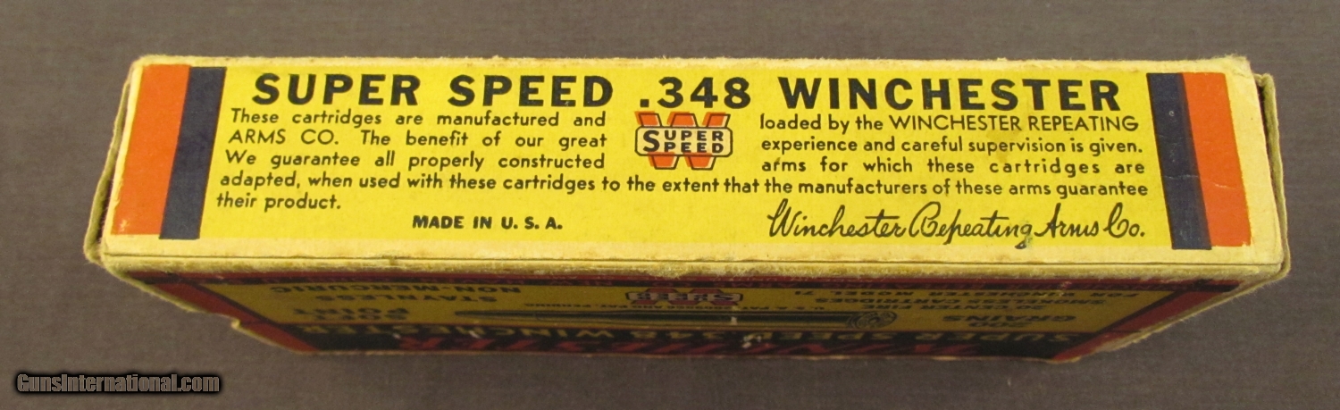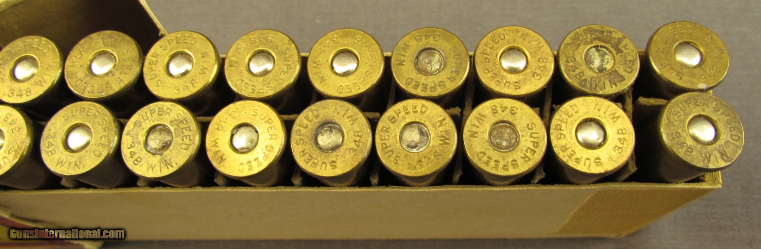 Description: This 1935 issue 20 round box shows shelf wear with corners worn through and edges scuffed. This box was replaced in 1939 with a box showing Western ownership. The ammo shows minor discoloration on some heads, most rounds are bright and clean. SOLD Manufacturer: Winchester Model: Ammo Caliber Info: .348 Win Gauge Info: .348 Win |